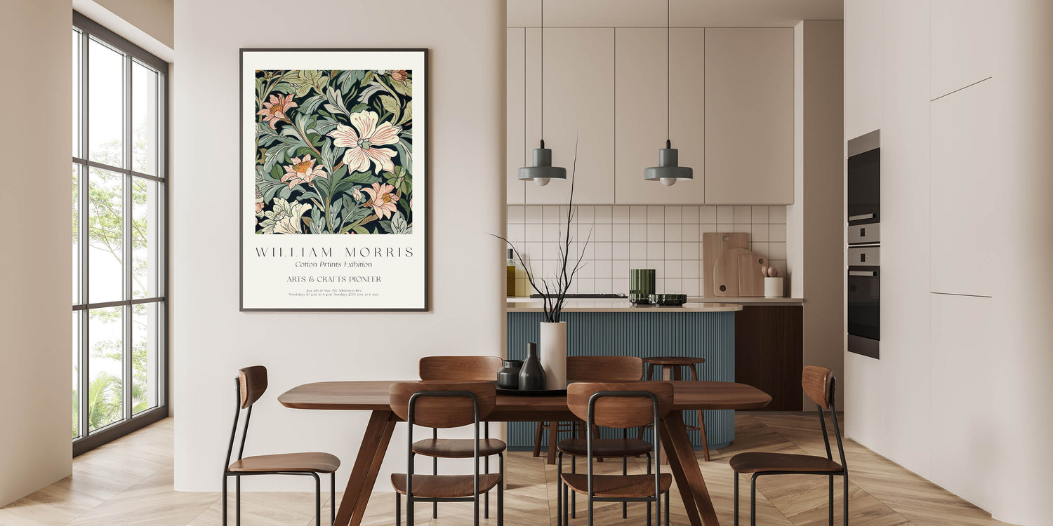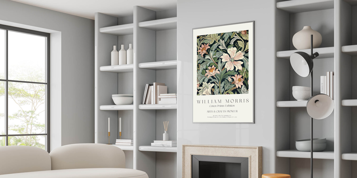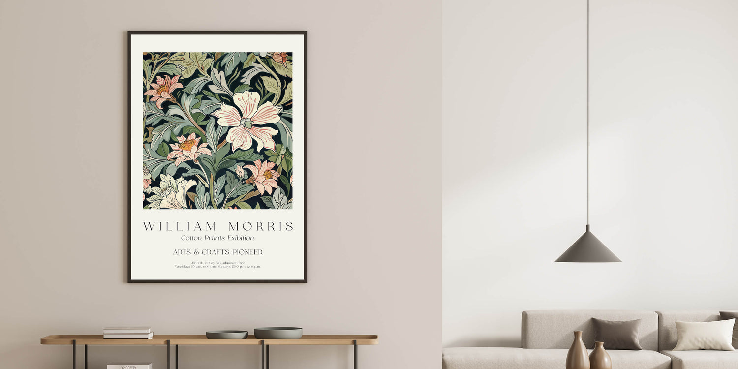 Enhance your home with the timeless beauty of this botanical-inspired wall art, featuring intricate floral patterns in a classic William Morris style. This modern wall art blends soft greens, peach-toned flowers, and delicate detailing, making it a perfect addition to living room wall décor.