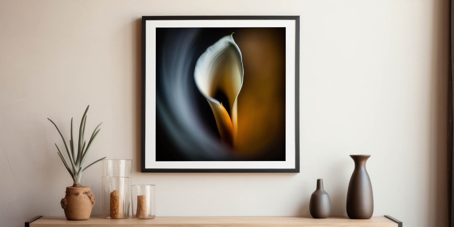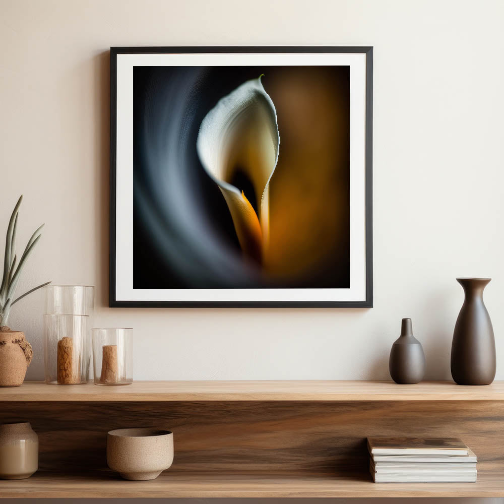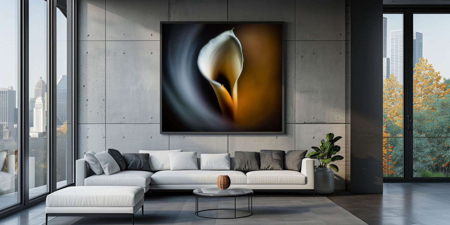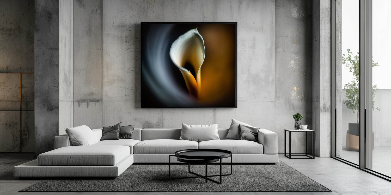 Enhance your space with this stunning wall art for living room, featuring an elegant close-up of a calla lily in soft white and golden hues. The smooth curves and artistic lighting create a mesmerizing visual effect, making this modern living room decor an exquisite focal point. The contrast of light and shadow adds depth, making this artwork a sophisticated addition to contemporary and minimalist interiors.