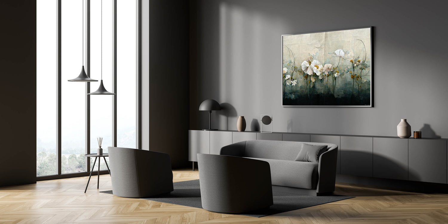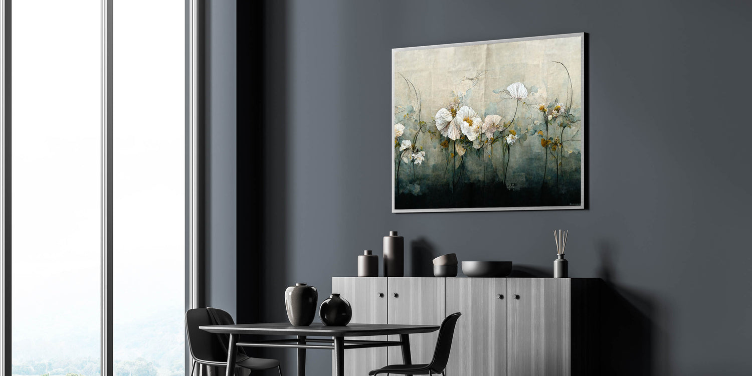 Transform your space with this stunning floral wall art for living rooms, featuring delicate white blossoms with golden accents set against a deep, abstract background. This modern living room décor blends soft neutral hues with a touch of contemporary elegance, making it the perfect statement piece for any home.