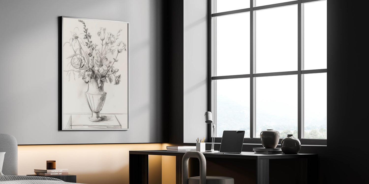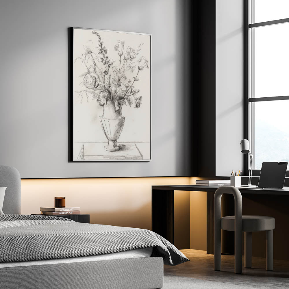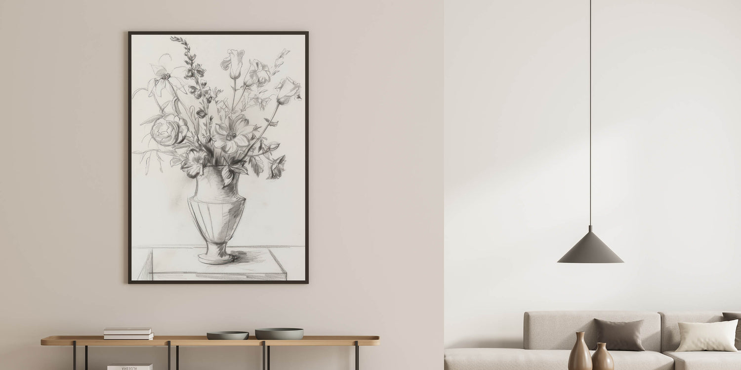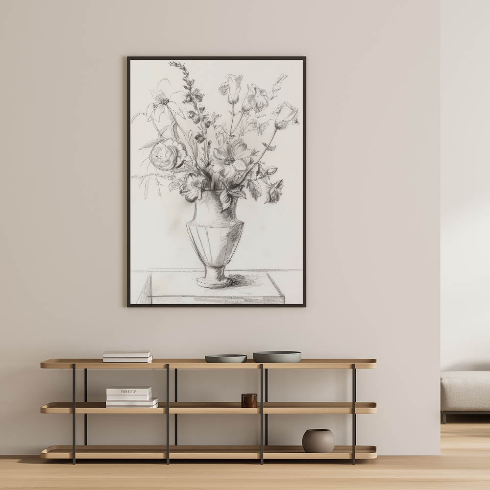 Bring a touch of classic elegance to your home with this monochrome floral sketch, beautifully depicting a vase filled with delicately drawn flowers. The fine pencil detailing adds a soft and graceful charm, making this piece perfect for modern living room décor or timeless interior styling. Whether displayed as canvas wall art, framed wall art, or acrylic glass, this artwork blends seamlessly with contemporary and vintage aesthetics.
