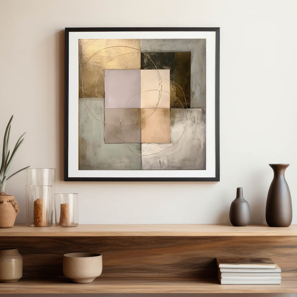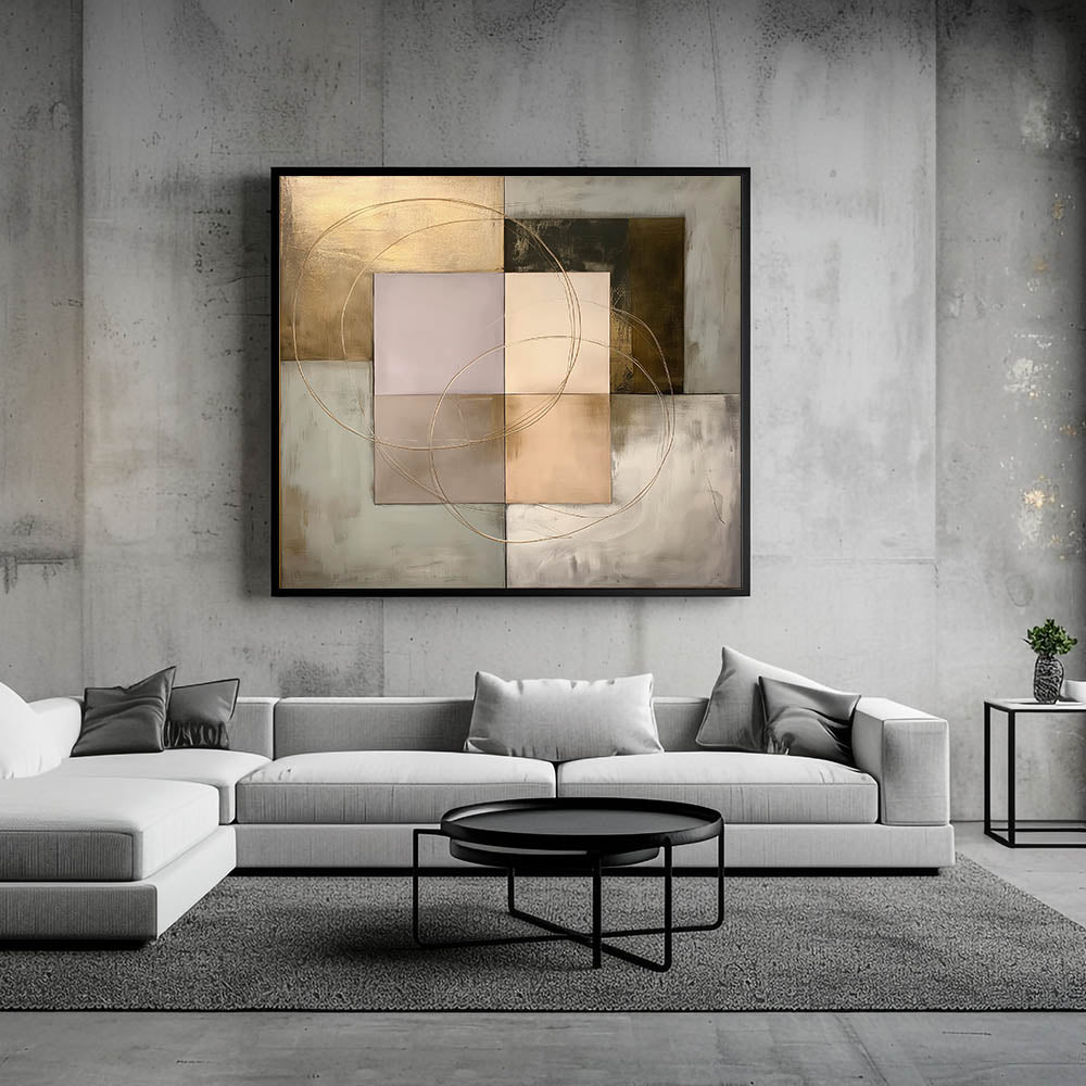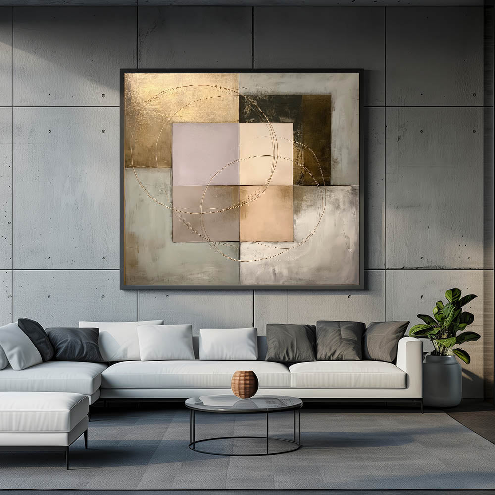Enhance your space with this Living Room Wall Art, a refined geometric abstract composition blending structured shapes with metallic gold, beige, olive green, and soft gray tones. The intersecting circular accents add fluidity and sophistication, making it an ideal statement piece for Modern Living Room Decor. This artwork strikes the perfect balance between contemporary minimalism and artistic elegance.