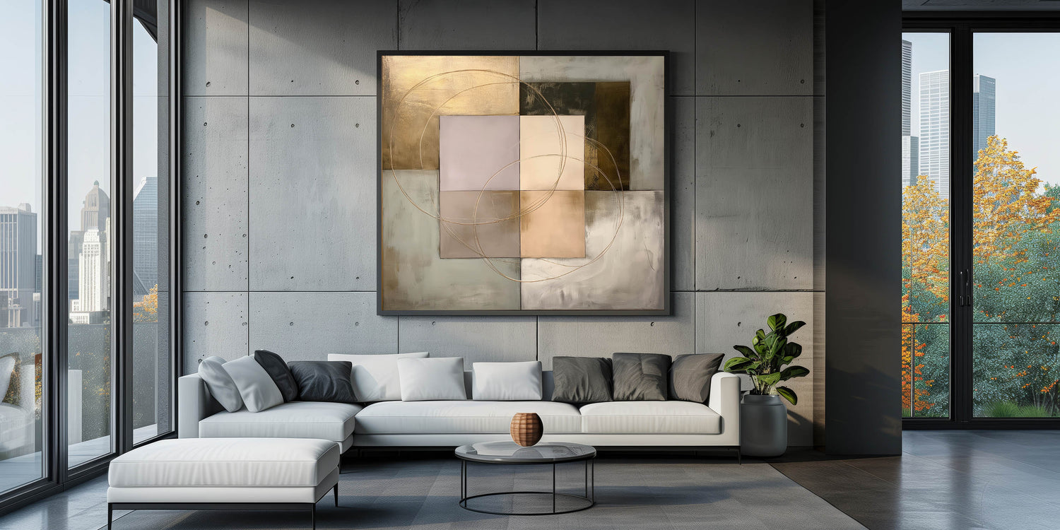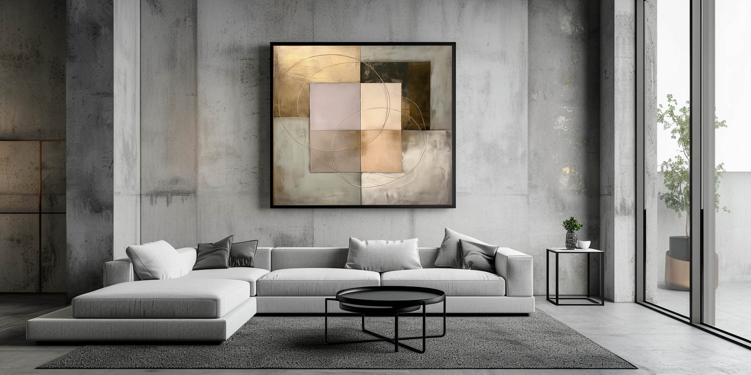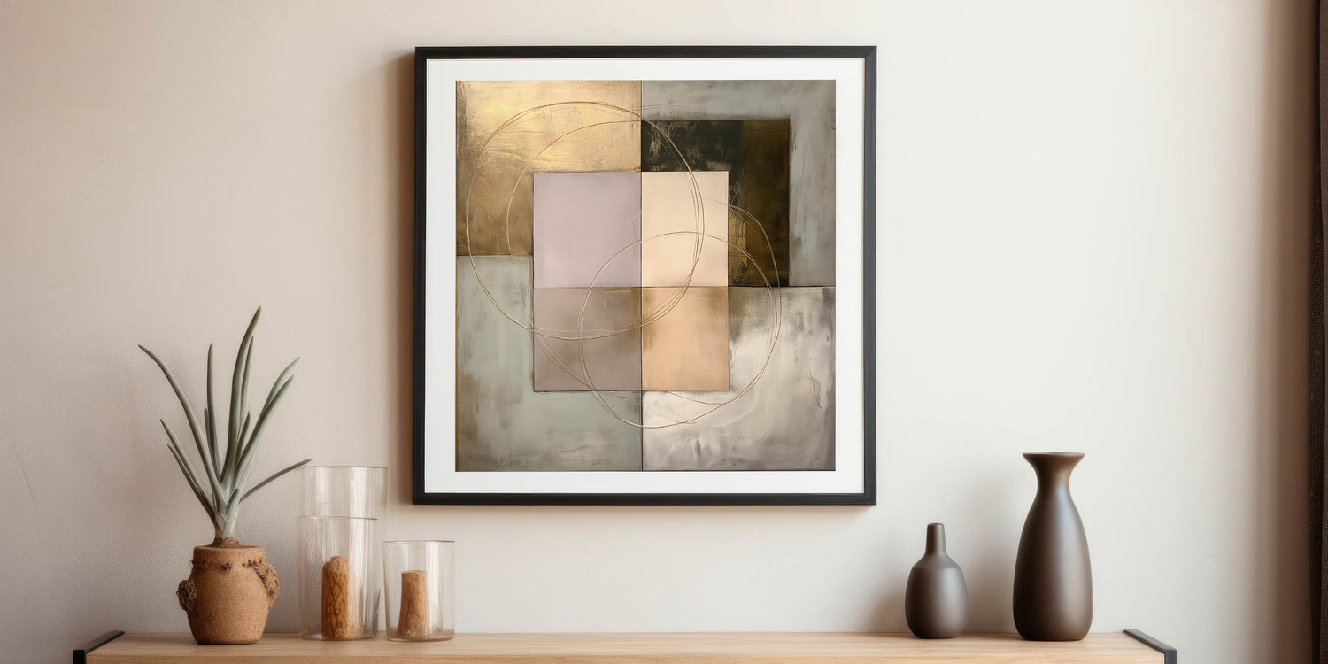 Enhance your space with this Living Room Wall Art, a refined geometric abstract composition blending structured shapes with metallic gold, beige, olive green, and soft gray tones. The intersecting circular accents add fluidity and sophistication, making it an ideal statement piece for Modern Living Room Decor. This artwork strikes the perfect balance between contemporary minimalism and artistic elegance.