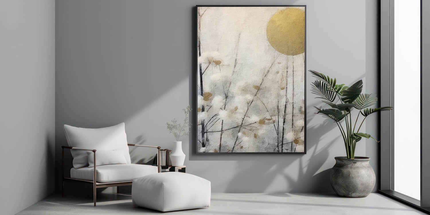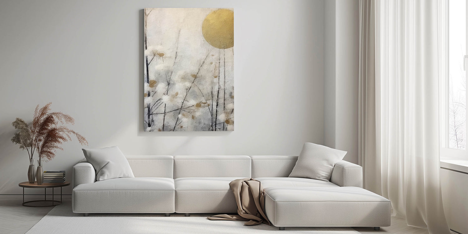 Enhance your space with this elegant Living Room Wall Art, featuring a tranquil nature-inspired scene. The soft gray and white tones, accented with golden hues, create a sophisticated ambiance, perfect for Modern Living Room Decor. The delicate branches and abstract blossoms bring a sense of serenity, making this piece an ideal focal point for your home.