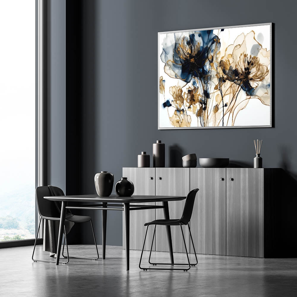 Add a touch of sophistication to your home with this Elegant Navy & Gold Floral Living Room Wall Art. This modern wall art features fluid, abstract floral elements in deep navy blue and rich gold tones, creating a luxurious and ethereal aesthetic. The delicate brushwork and artistic transparency give this piece a sense of movement, making it an elegant addition to modern living room decor.