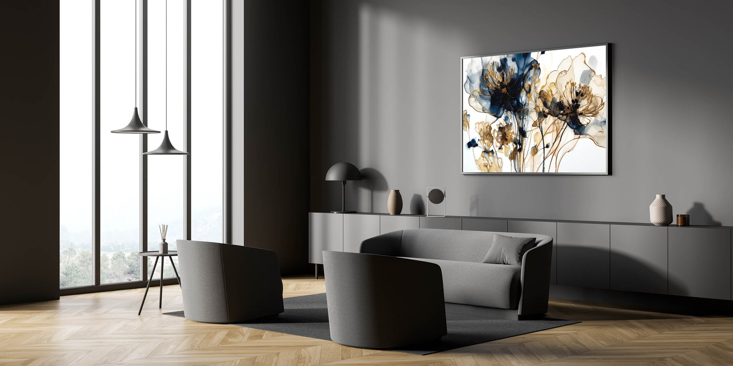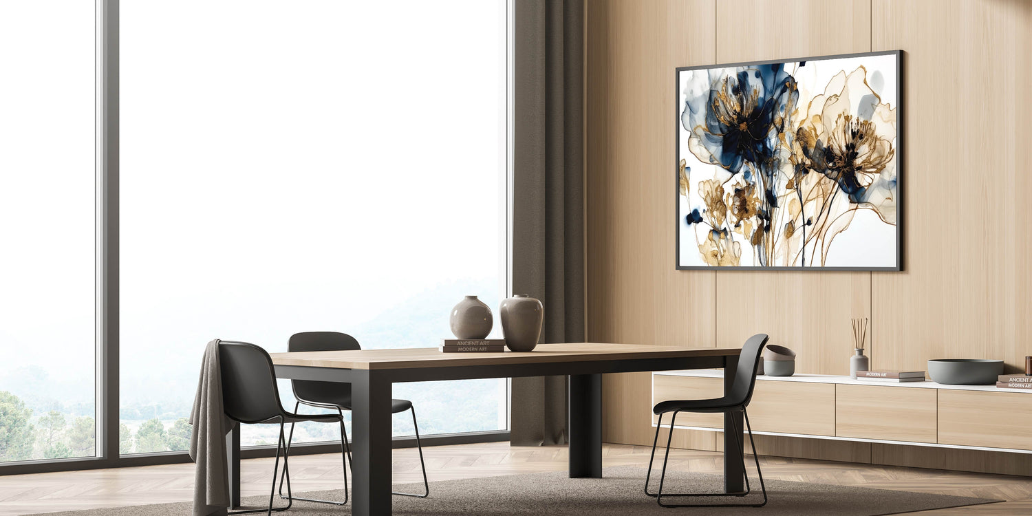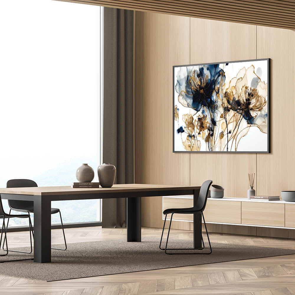 - Deep navy blue and gold accents enhance contemporary art prints.
