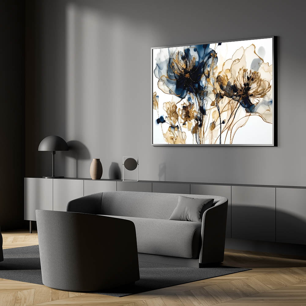 Elegant Navy & Gold Floral Living Room Wall Art - Modern Print