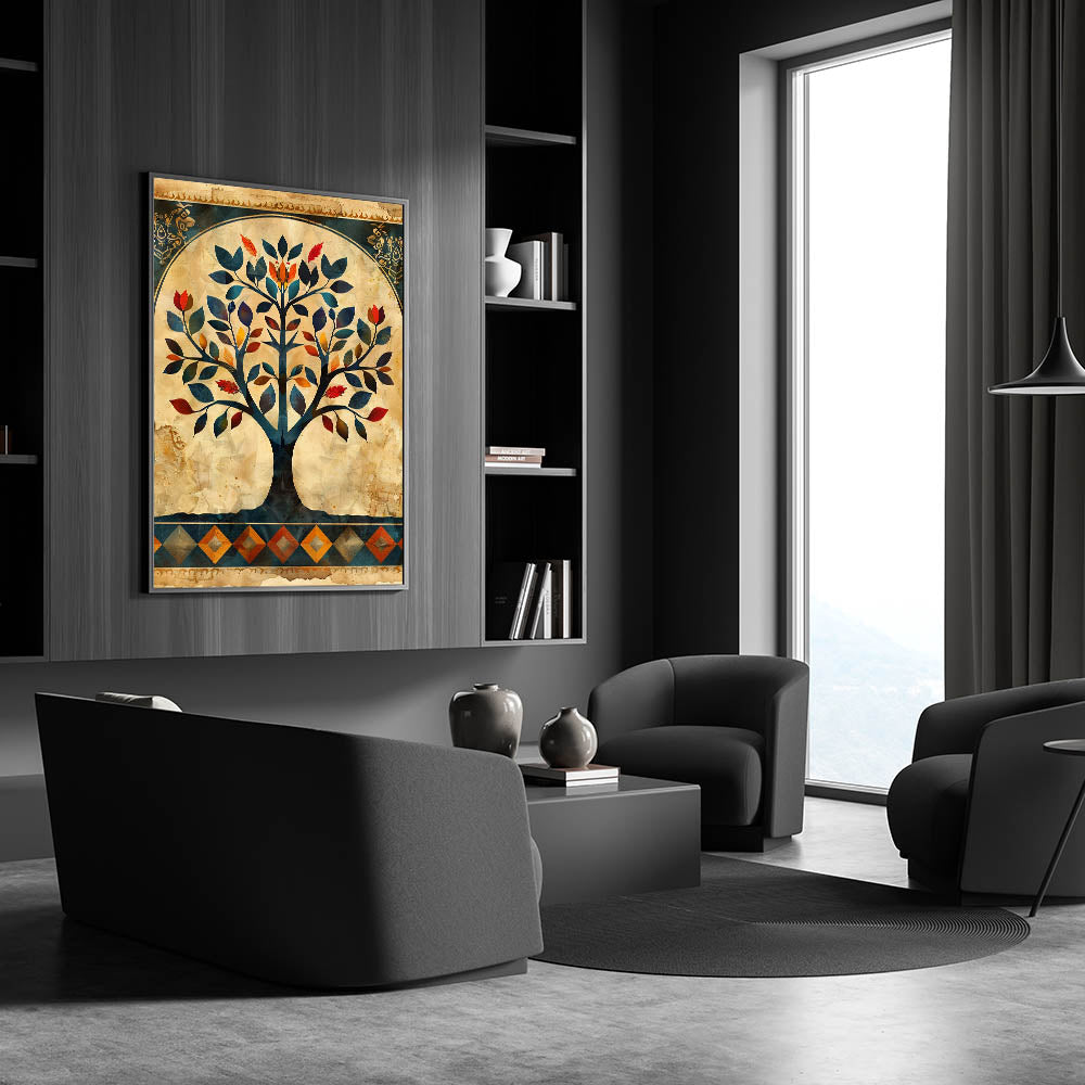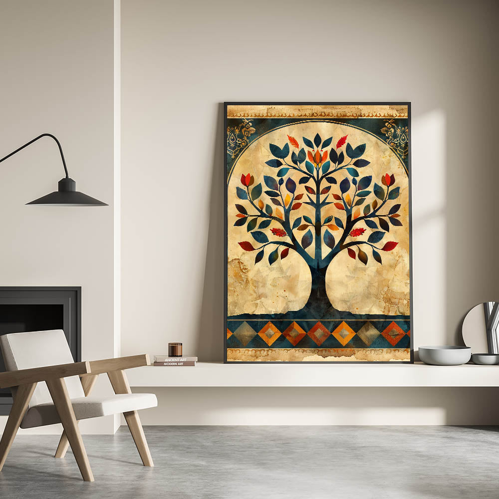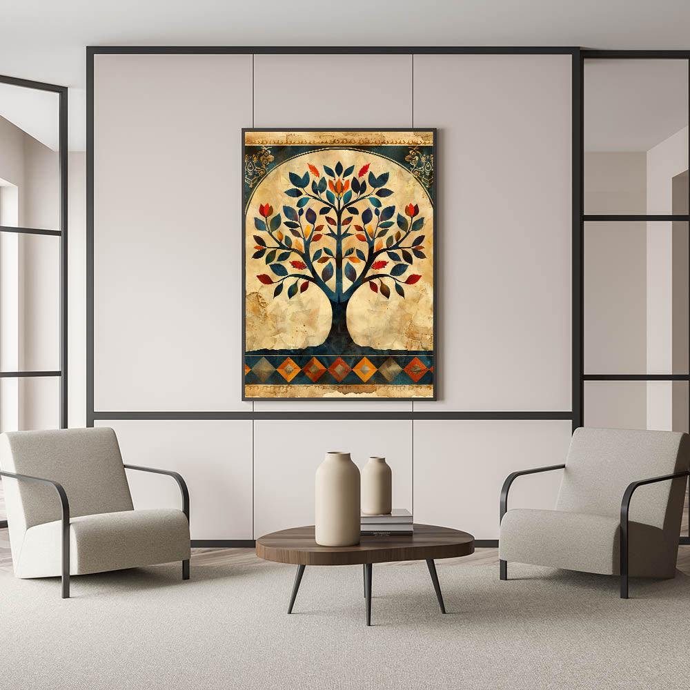Transform your space with this stunning Tree of Life wall art, a harmonious blend of tradition and modern elegance. The intricate design showcases rich hues of navy blue, deep red, burnt orange, and gold, beautifully set against a vintage beige background. This wall art for living room décor is a statement piece that brings warmth, sophistication, and artistic depth to your home.