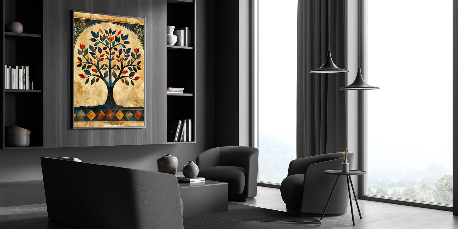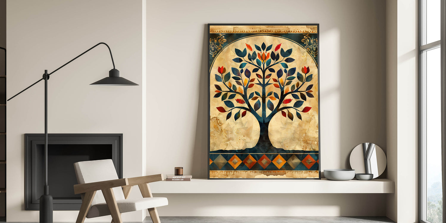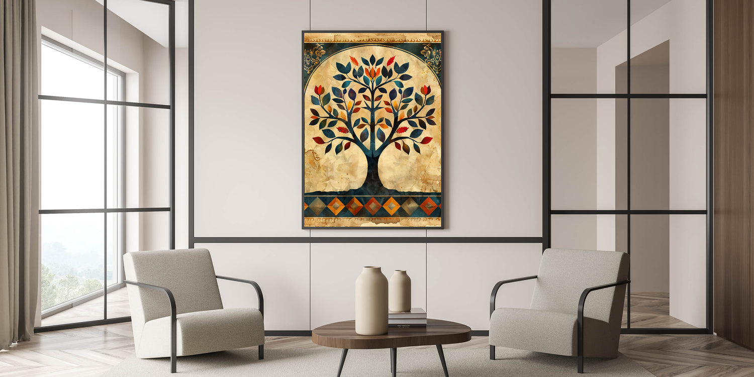 Transform your space with this stunning Tree of Life wall art, a harmonious blend of tradition and modern elegance. The intricate design showcases rich hues of navy blue, deep red, burnt orange, and gold, beautifully set against a vintage beige background. This wall art for living room décor is a statement piece that brings warmth, sophistication, and artistic depth to your home.