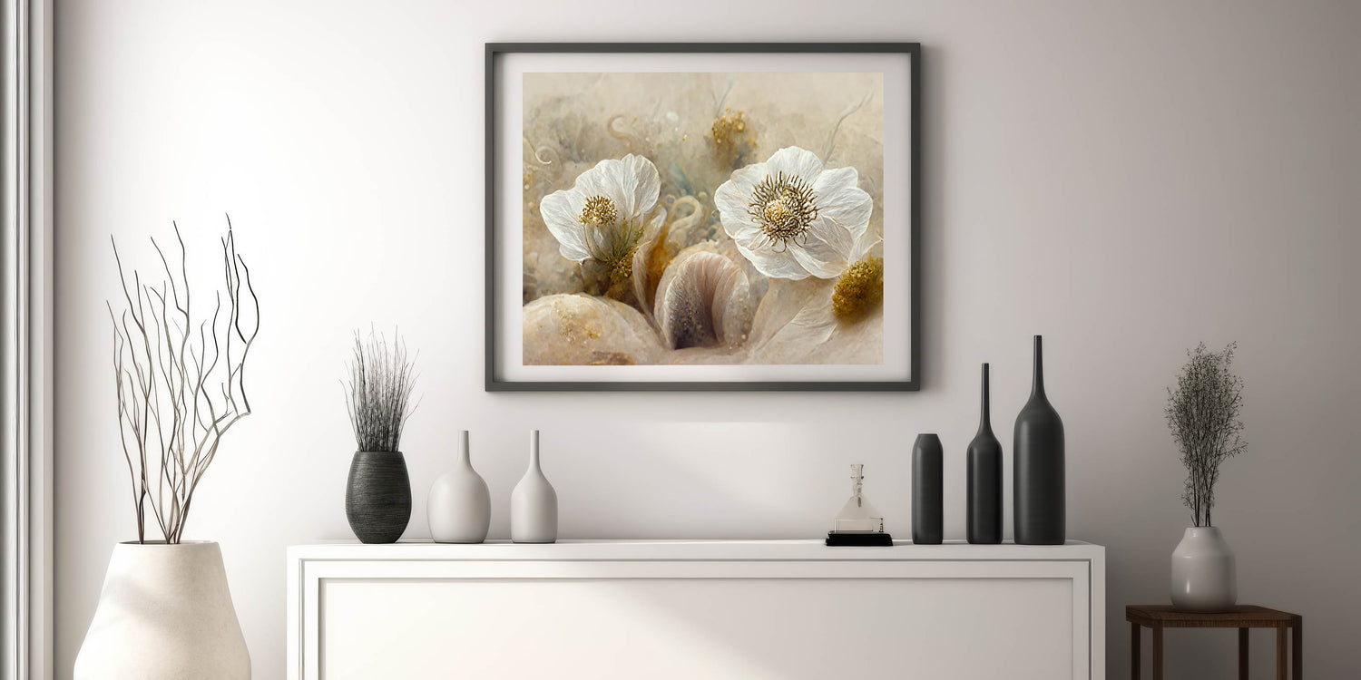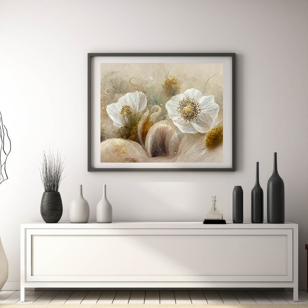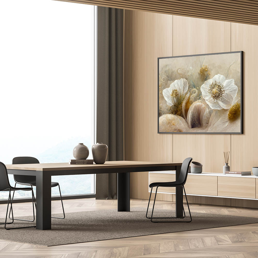 Bring a sense of tranquility and natural beauty into your home with this exquisite white floral wall art. Featuring delicate flowers in soft beige and white hues, this artwork captures a dreamy, nature-inspired elegance that blends seamlessly with modern living room décor. The intricate petal details and warm neutral tones make this canvas wall art a perfect choice for creating a serene atmosphere.