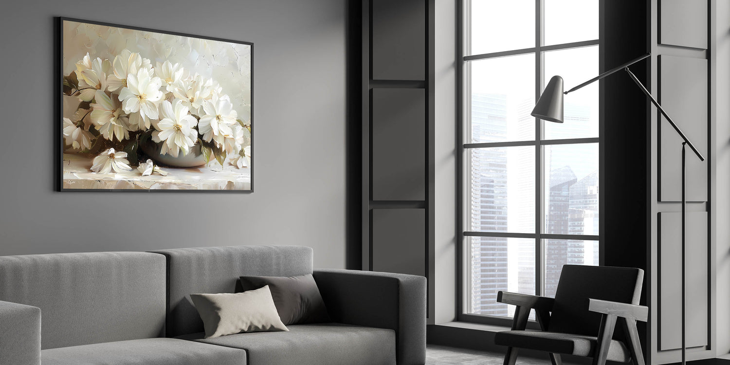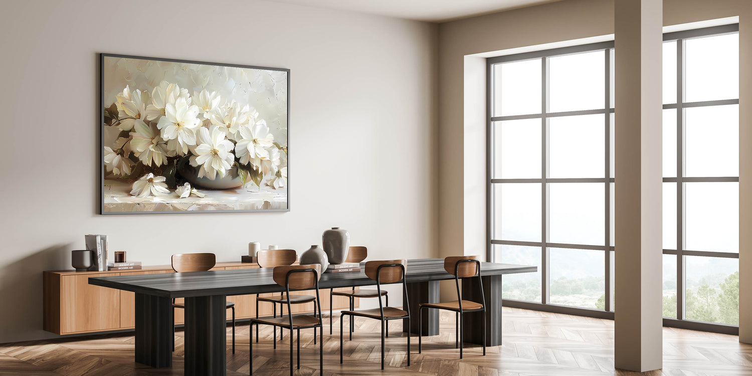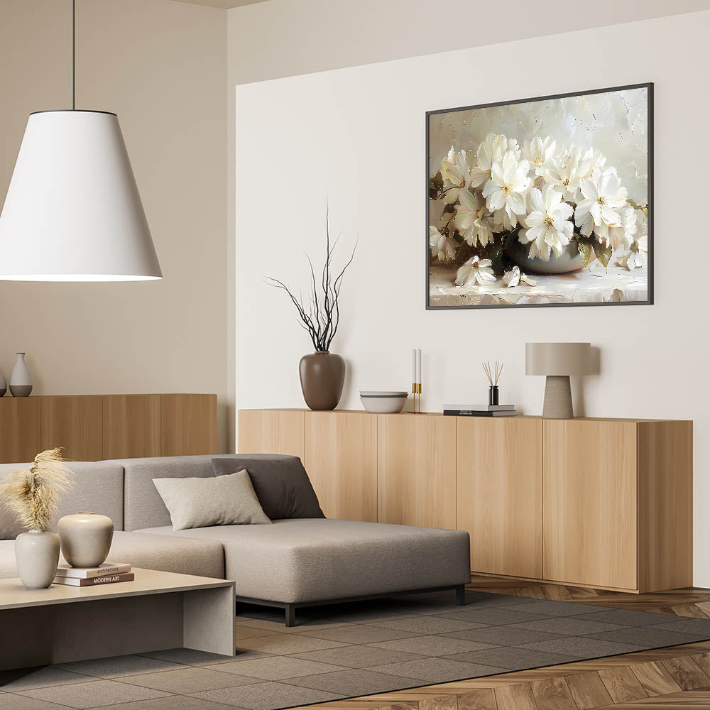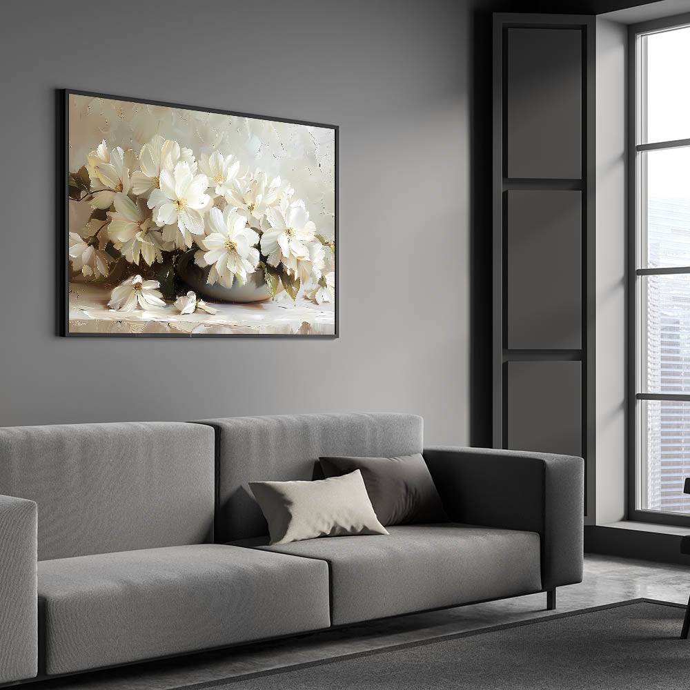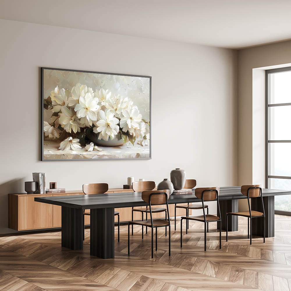 Bring timeless elegance to your home with this white floral wall art, featuring a beautifully arranged bouquet of delicate white blossoms in soft, neutral tones. This modern wall art blends shades of beige, cream, and muted greens, creating a sophisticated yet calming atmosphere. The painterly texture and soft brushstrokes enhance the artwork’s depth, making it an exquisite choice for wall art for living room spaces, dining areas, or bedrooms.