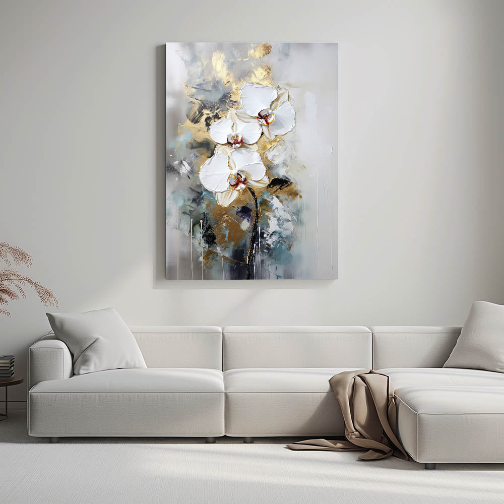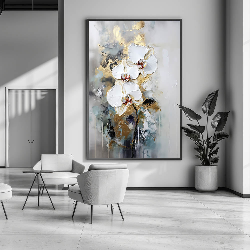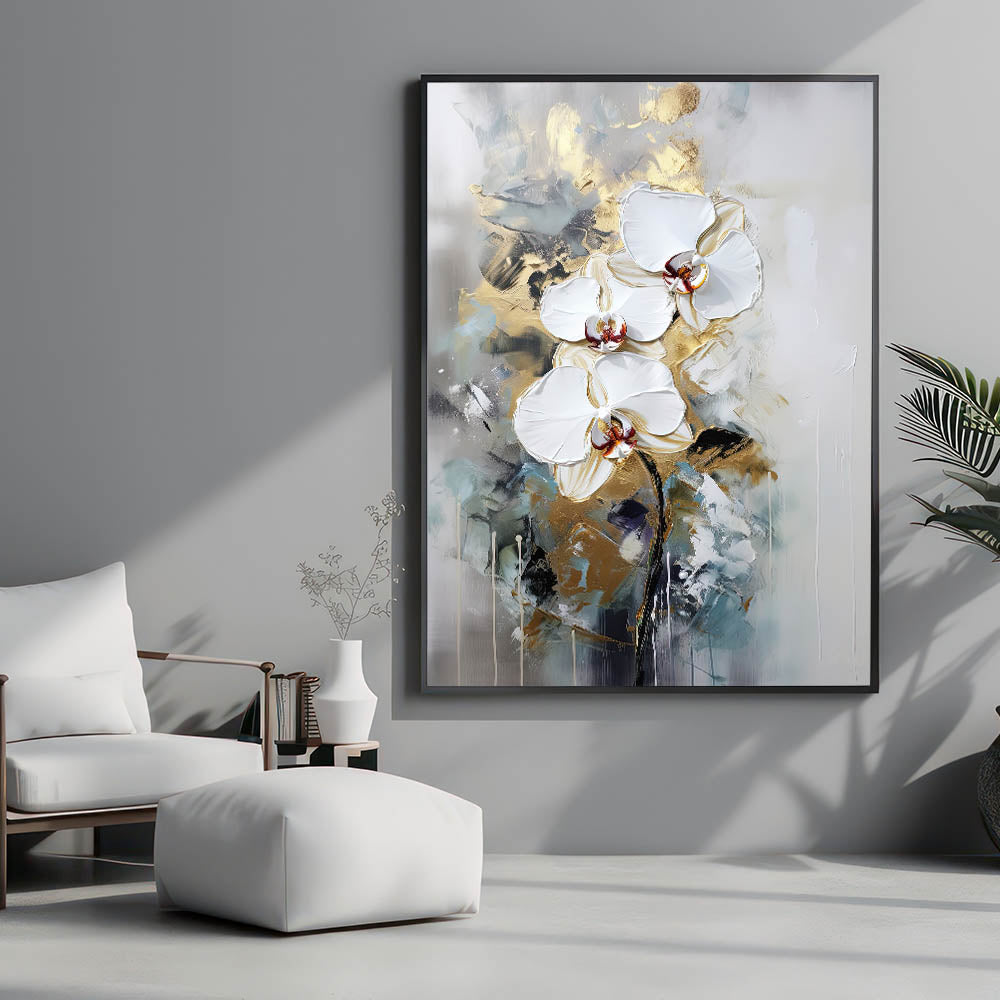 Bring a sense of refinement and tranquility into your space with this Elegant White Orchid Wall Art. Featuring delicate white orchids accented with shimmering gold and deep teal brushstrokes, this living room wall art blends floral beauty with modern abstract expression. The combination of rich textures and subtle metallic highlights makes this modern wall art a timeless statement piece for contemporary interiors.