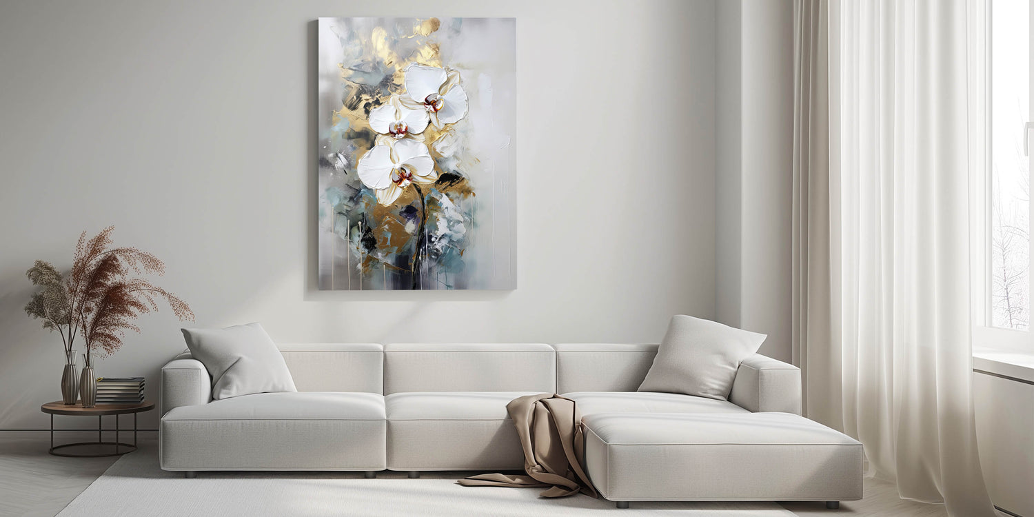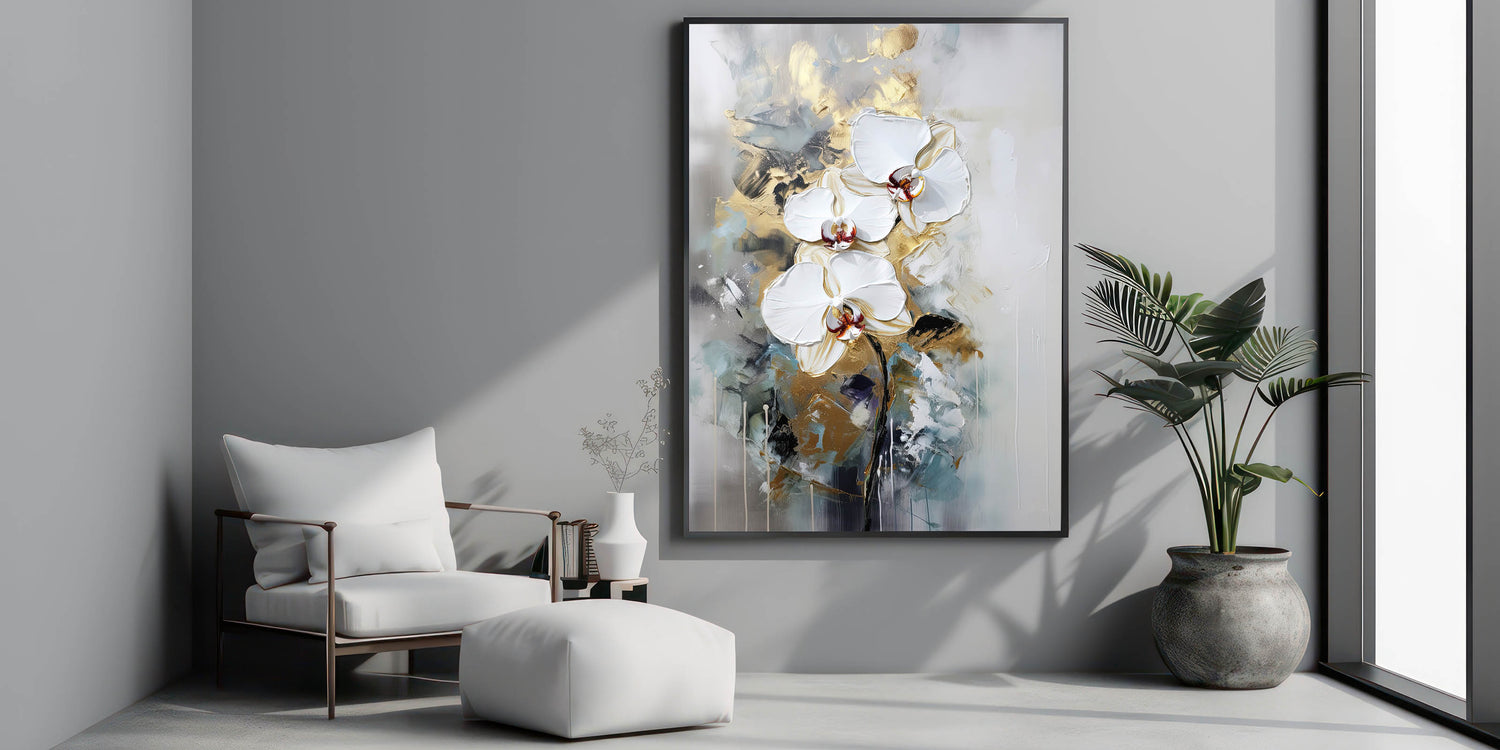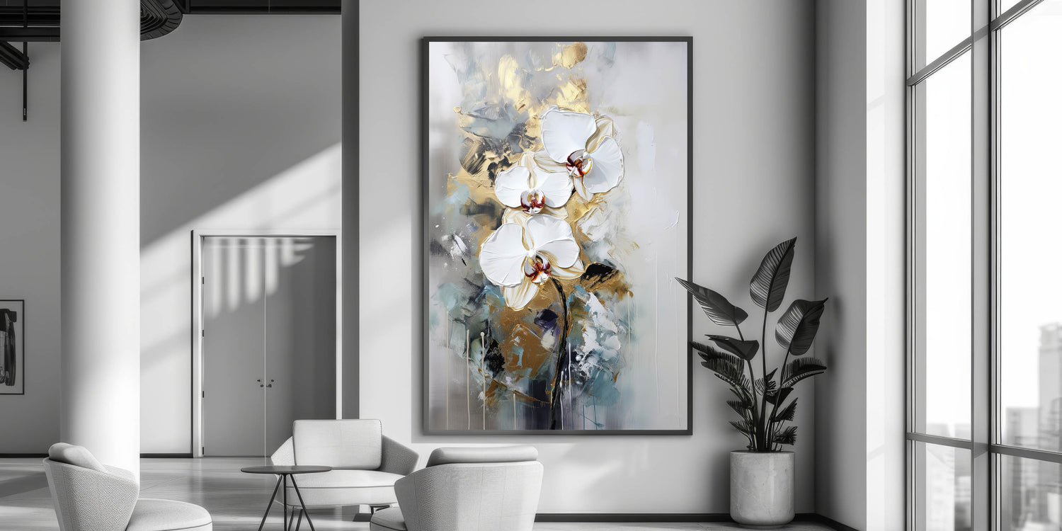 Bring a sense of refinement and tranquility into your space with this Elegant White Orchid Wall Art. Featuring delicate white orchids accented with shimmering gold and deep teal brushstrokes, this living room wall art blends floral beauty with modern abstract expression. The combination of rich textures and subtle metallic highlights makes this modern wall art a timeless statement piece for contemporary interiors.