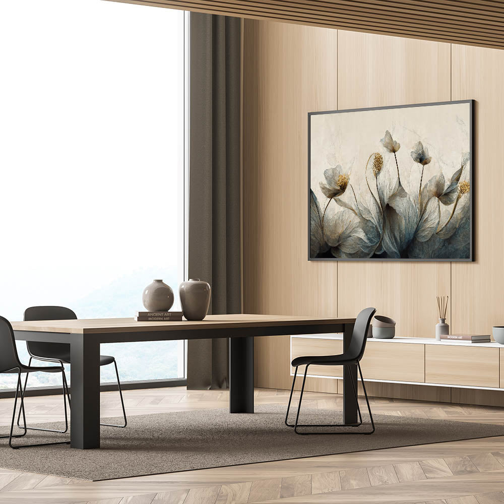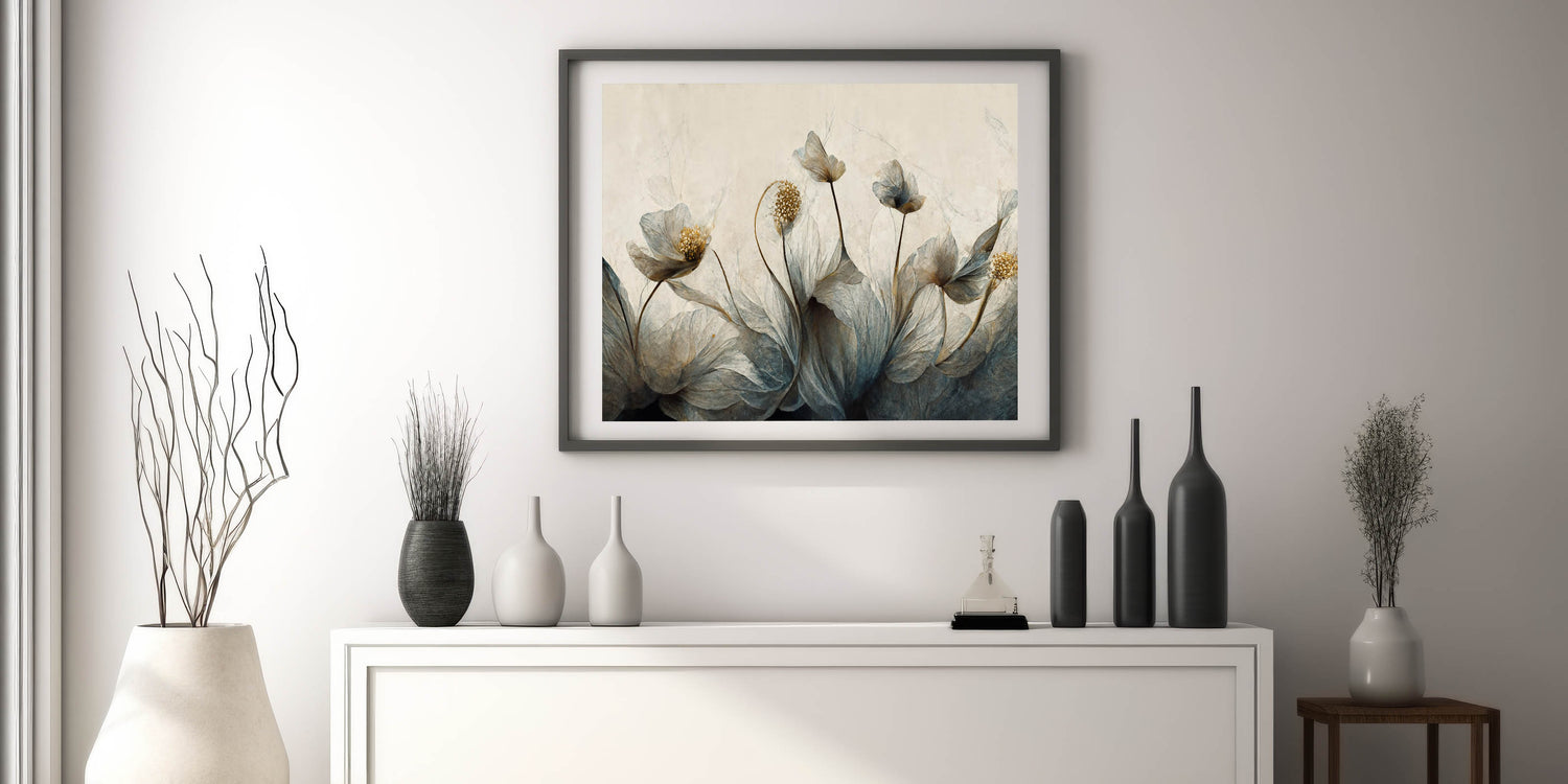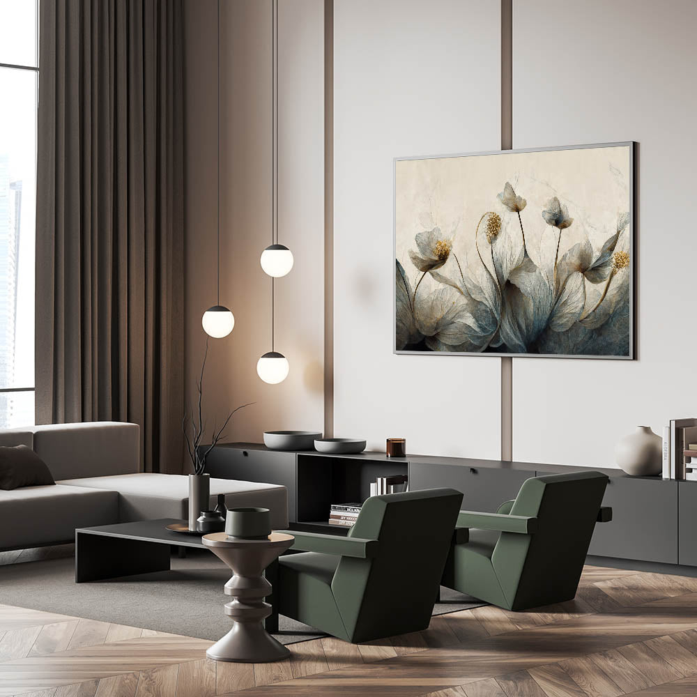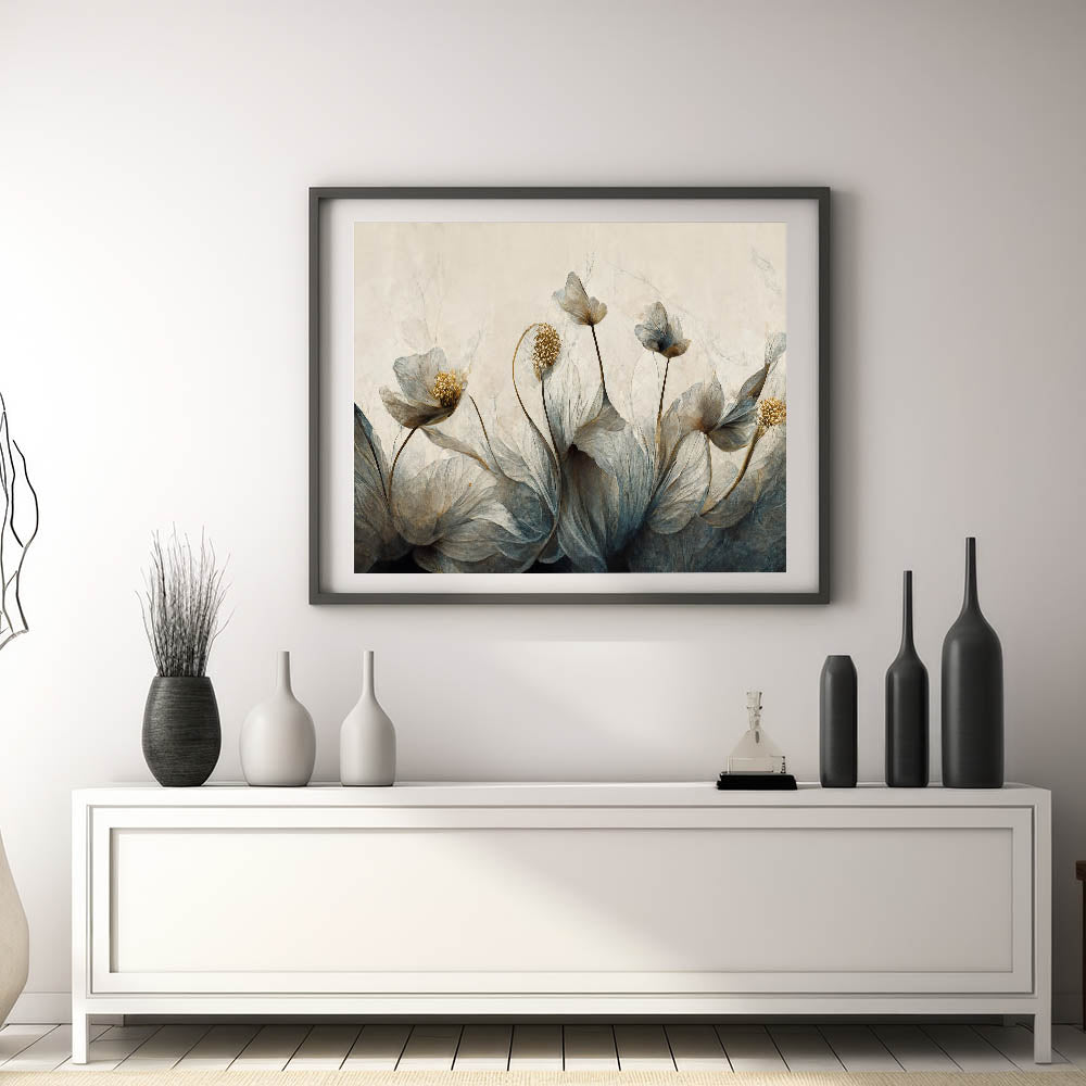Transform your space with this ethereal floral abstract wall art, a delicate composition of translucent petals in soft blue-gray tones with elegant gold accents. This modern wall art radiates a sense of tranquility and sophistication, making it an ideal addition to modern living room decor. The intricate floral details and muted colors blend seamlessly into a variety of interior styles.