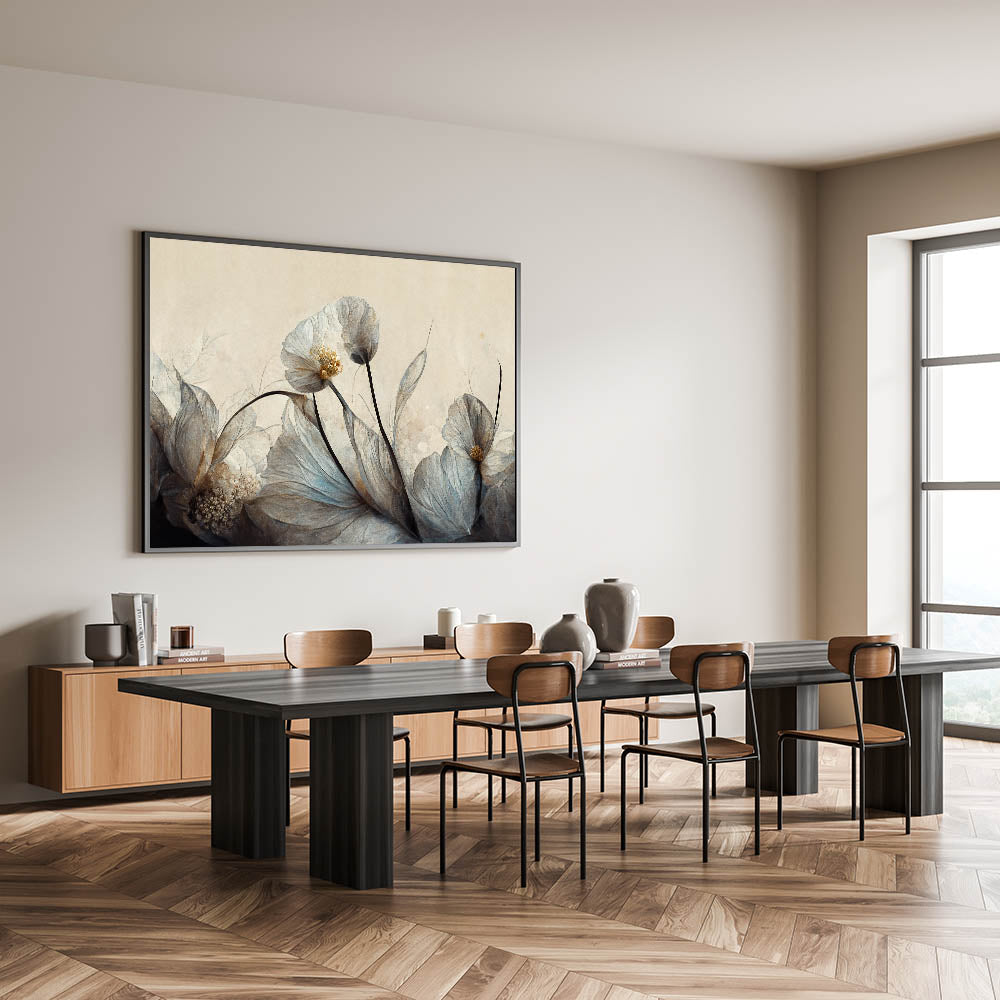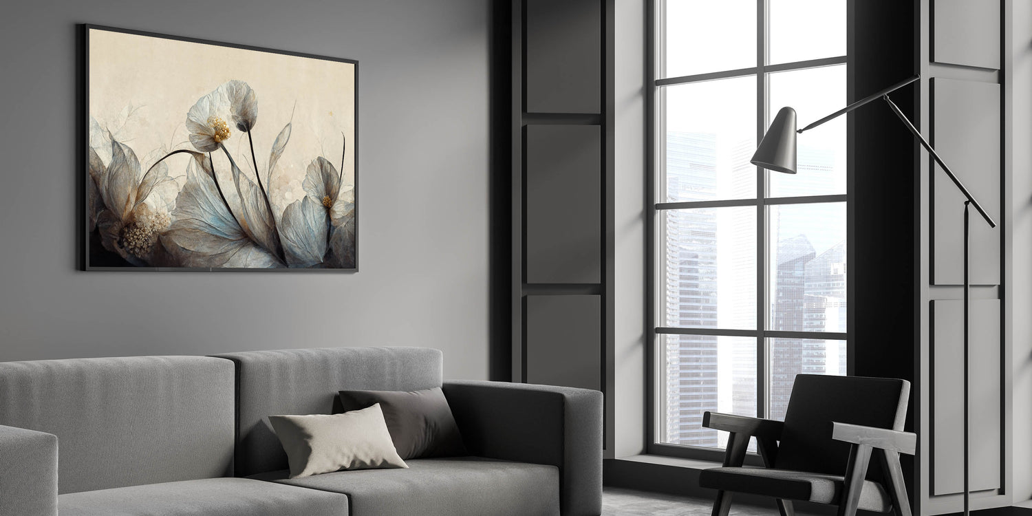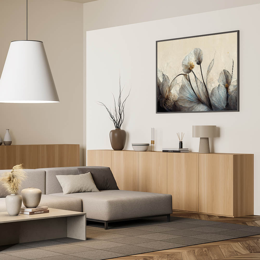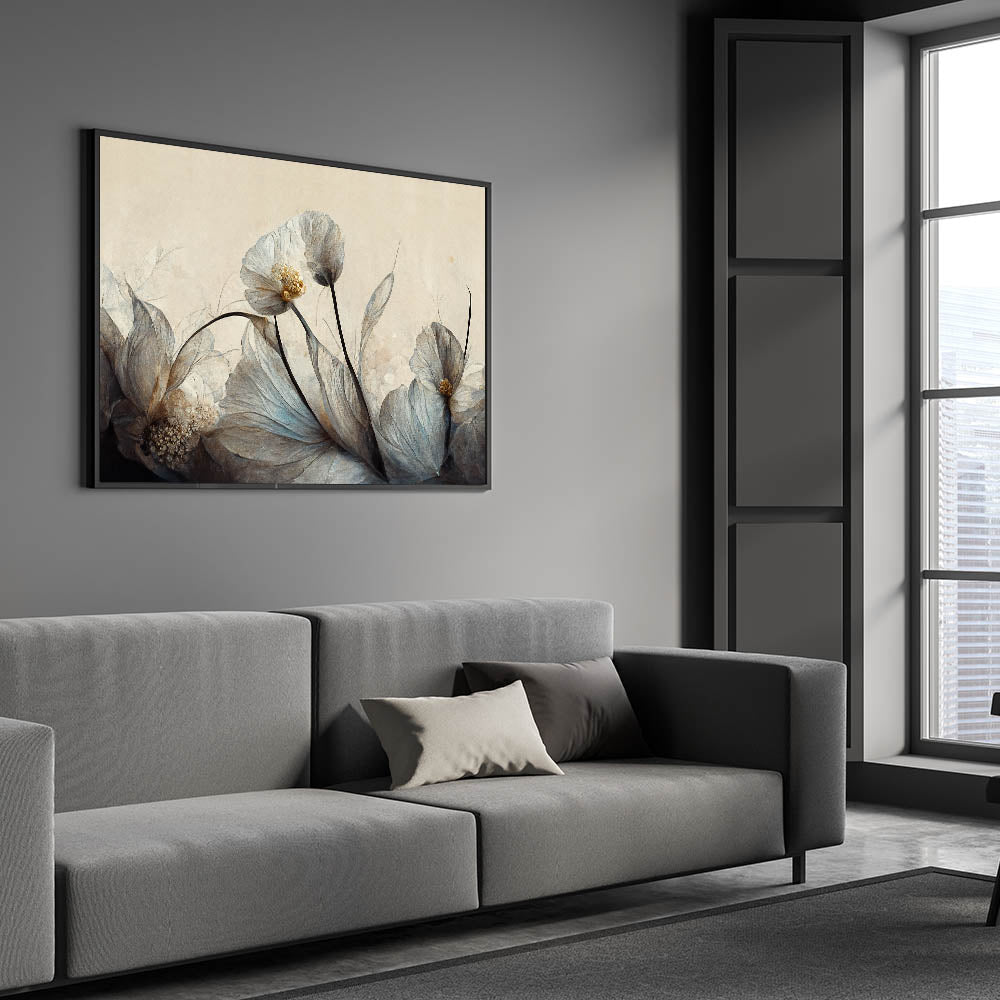 Create a serene and elegant atmosphere in your home with this stunning floral wall art, featuring delicate translucent flowers in soft gray, beige, and gold tones. The refined brushwork and subtle textures bring a sense of movement and tranquility, making it an ideal wall art for living room décor. The neutral palette complements modern living room decor, adding a sophisticated and timeless touch to your space.