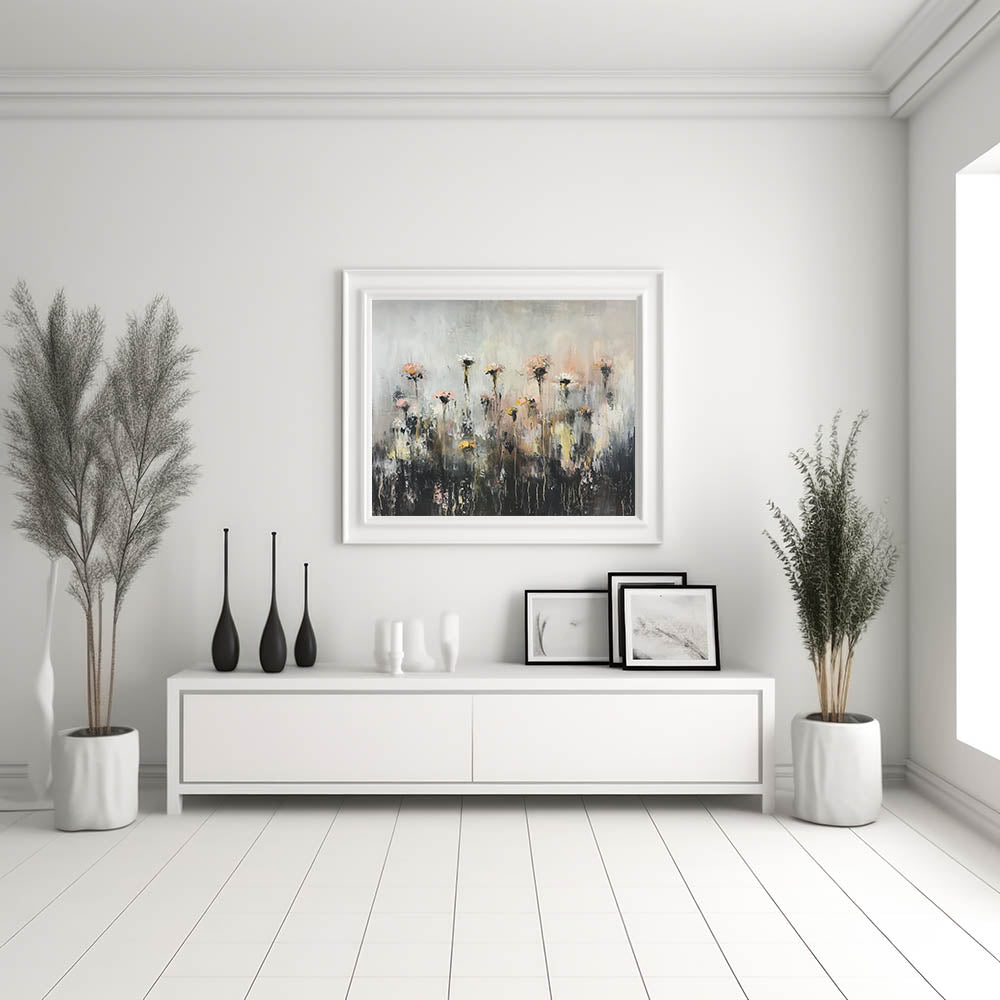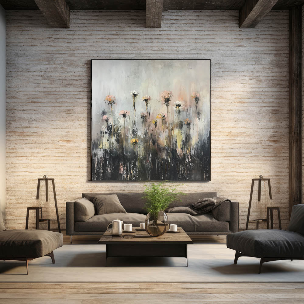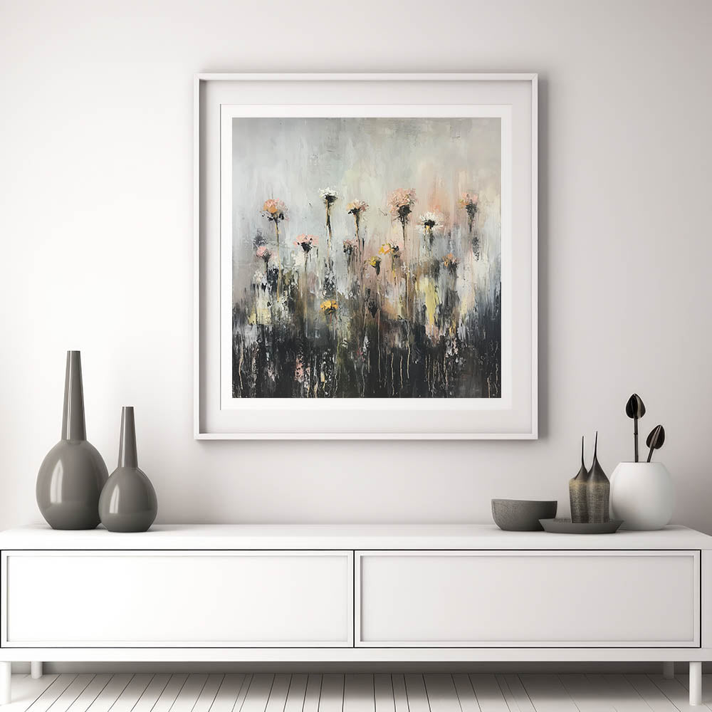 Bring a sense of serene elegance to your modern living room decor with this stunning abstract floral wall art. Featuring delicate pink, white, and soft yellow flowers rising from a misty backdrop, this artwork captures a tranquil yet expressive atmosphere. The layered textures and muted tones create a dreamy, sophisticated aesthetic, making it an eye-catching statement piece for any contemporary home.