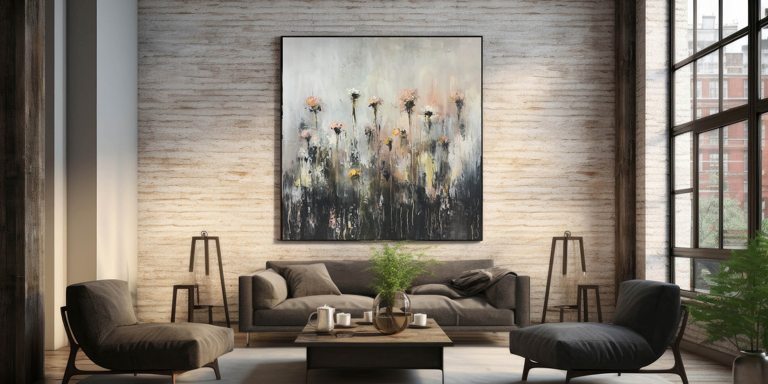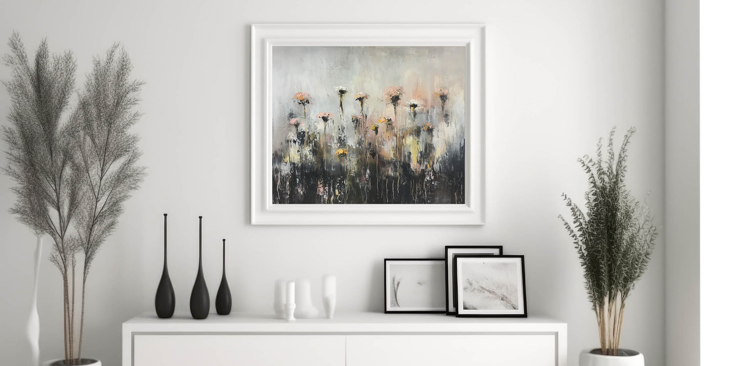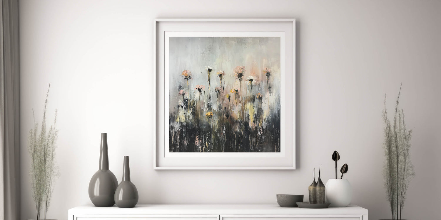 Bring a sense of serene elegance to your modern living room decor with this stunning abstract floral wall art. Featuring delicate pink, white, and soft yellow flowers rising from a misty backdrop, this artwork captures a tranquil yet expressive atmosphere. The layered textures and muted tones create a dreamy, sophisticated aesthetic, making it an eye-catching statement piece for any contemporary home.