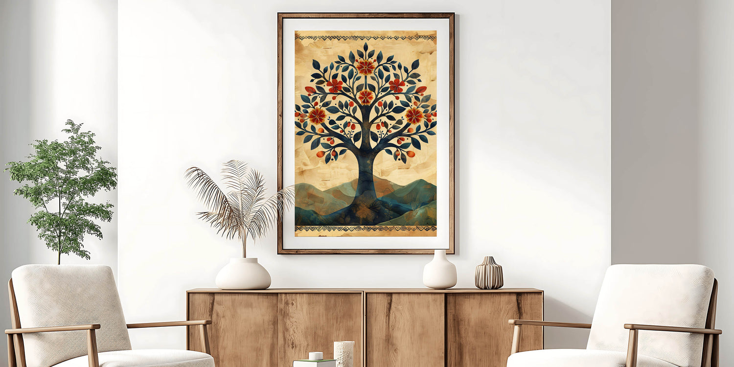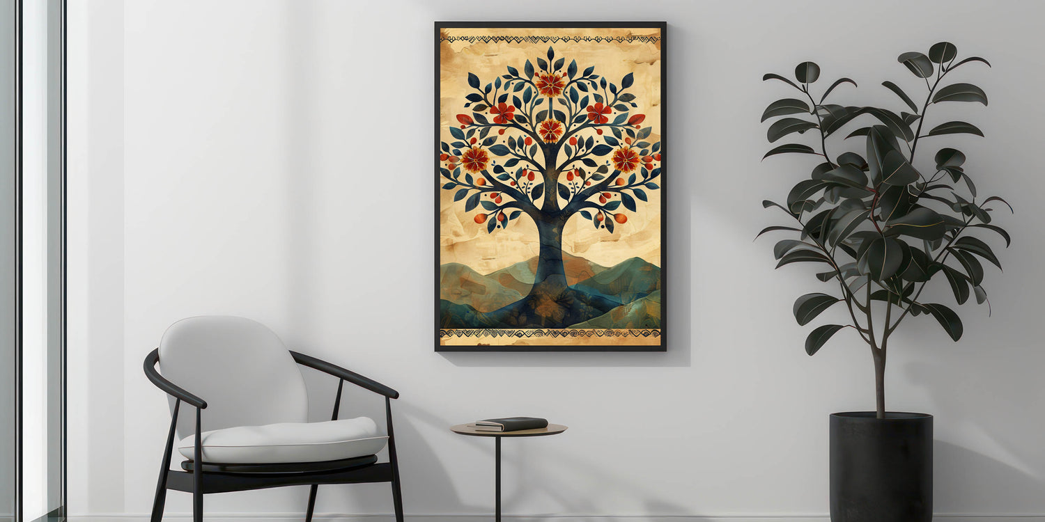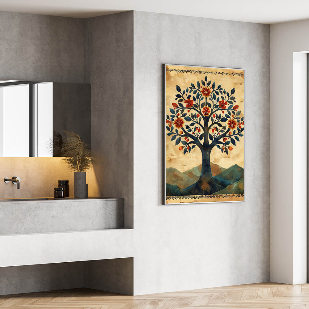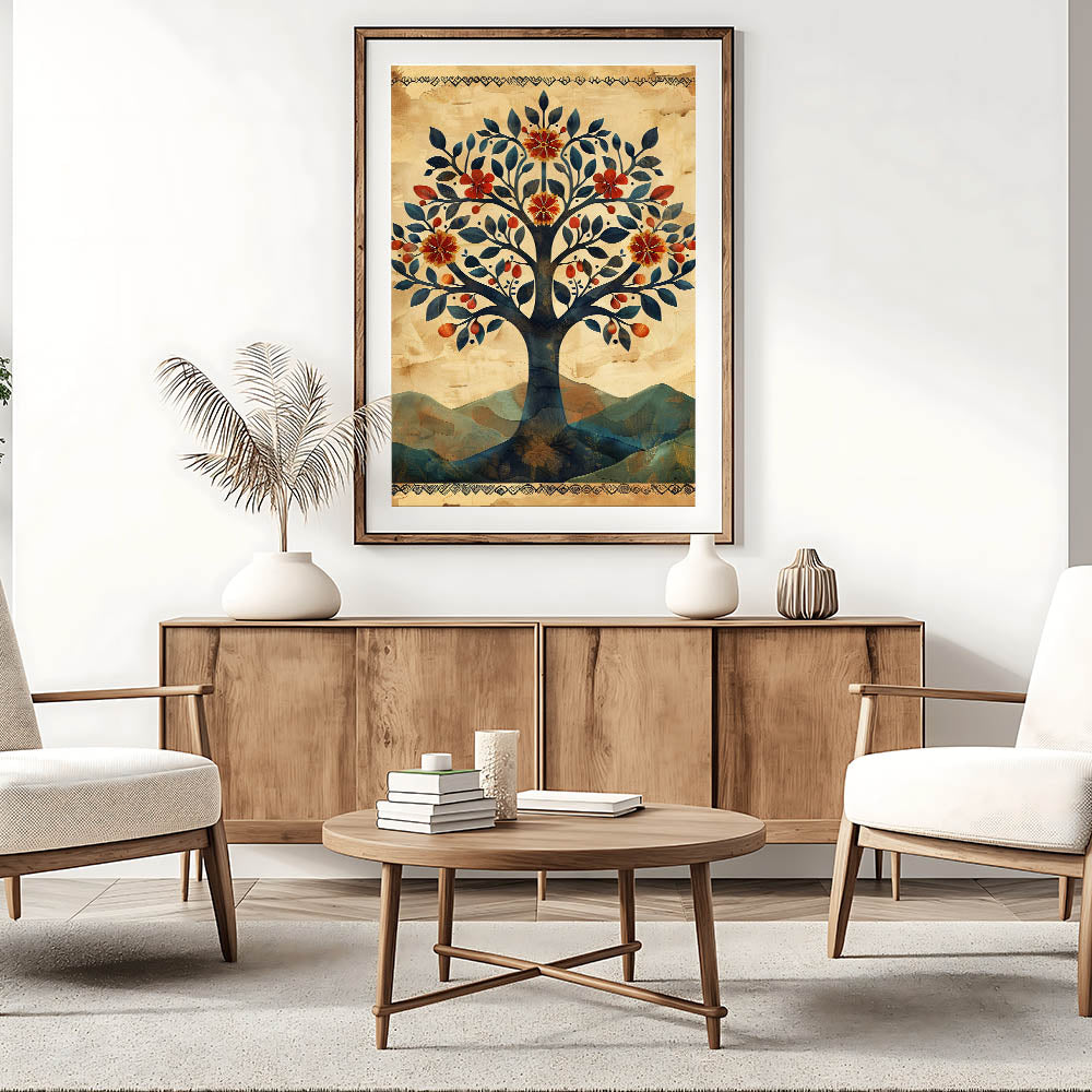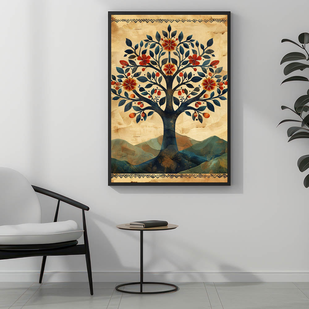 Embrace the charm of folk-inspired botanical art with this vintage tree wall art, featuring a beautifully illustrated tree adorned with deep blue leaves, warm red florals, and golden fruits. This modern wall art blends earthy beige, rustic orange, and muted blue tones, creating a visually rich and timeless composition. The ornate border and textured background add a handcrafted feel, making it a perfect choice for wall art for living room spaces, bohemian settings, or rustic interiors.