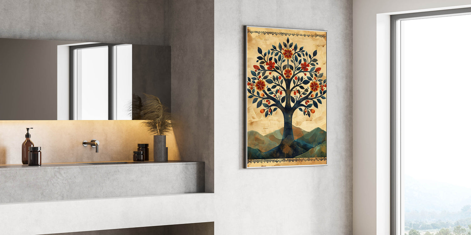 Whether you’re searching for canvas art prints or framed art prints, this large wall art piece offers a fusion of traditional folk motifs and contemporary aesthetics. Its warm, inviting colors and symbolic tree design create a sense of harmony and nature-inspired beauty.