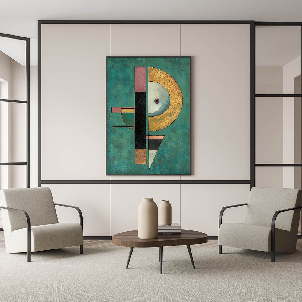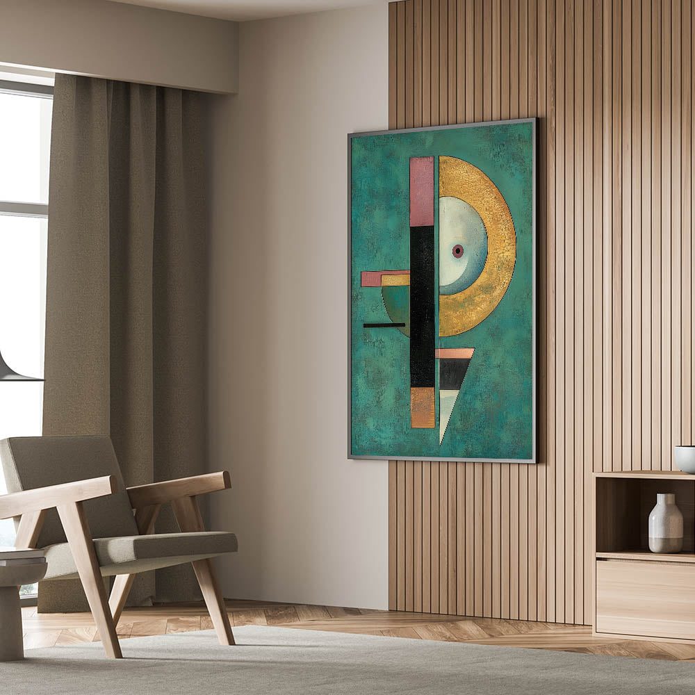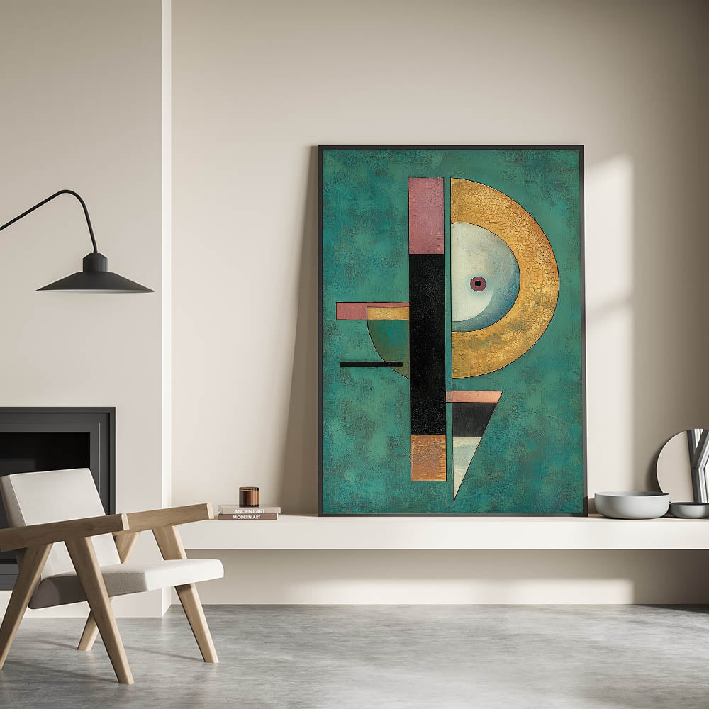 Bring bold sophistication to your space with this living room wall art, a striking geometric abstract composition featuring rich teal, gold, black, and pink hues. The structured shapes and textured elements create a modern and retro-inspired aesthetic, making this modern wall art perfect for contemporary interiors. The balance of bold colors and dynamic design makes this piece a standout addition to any décor.