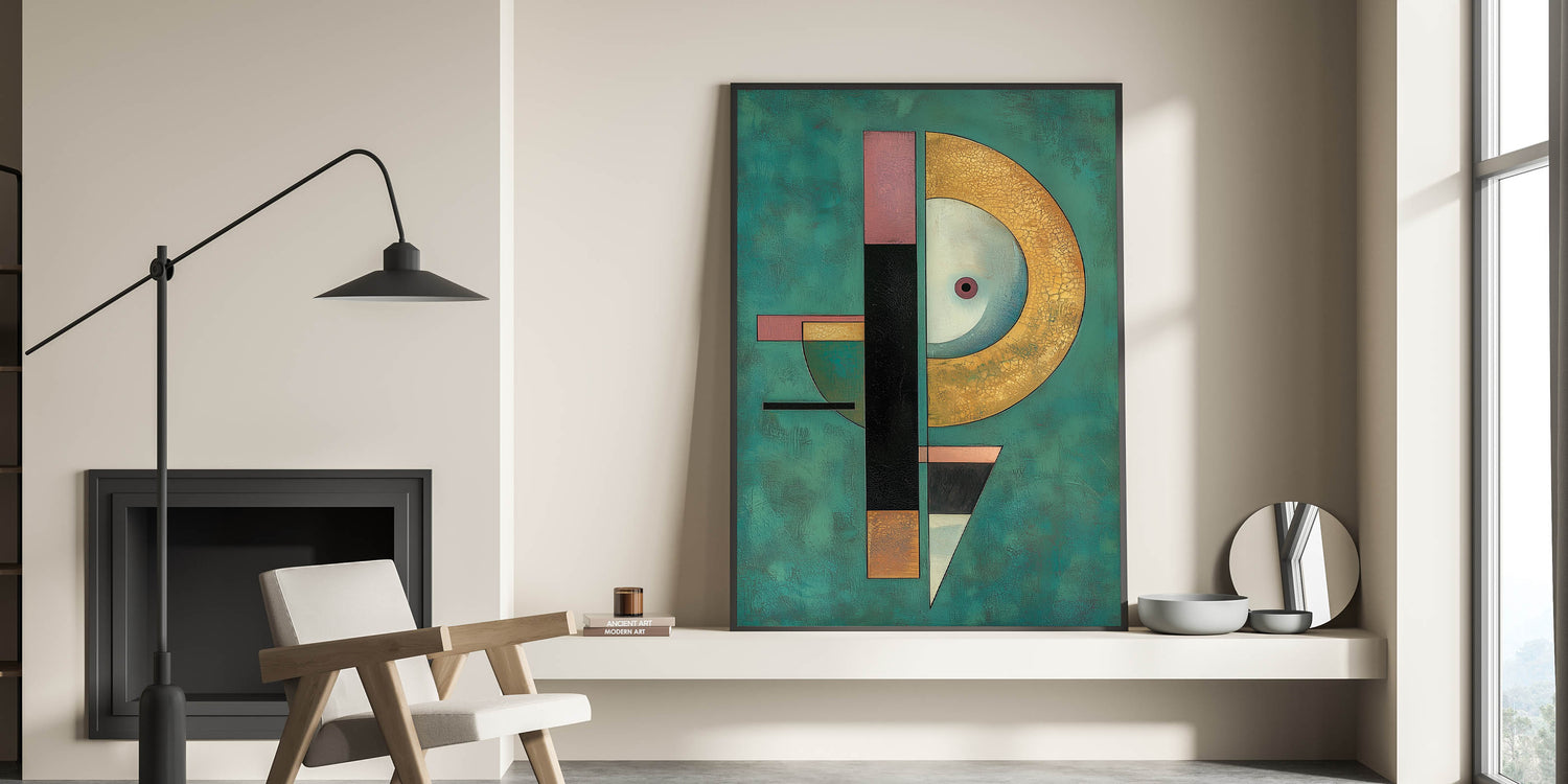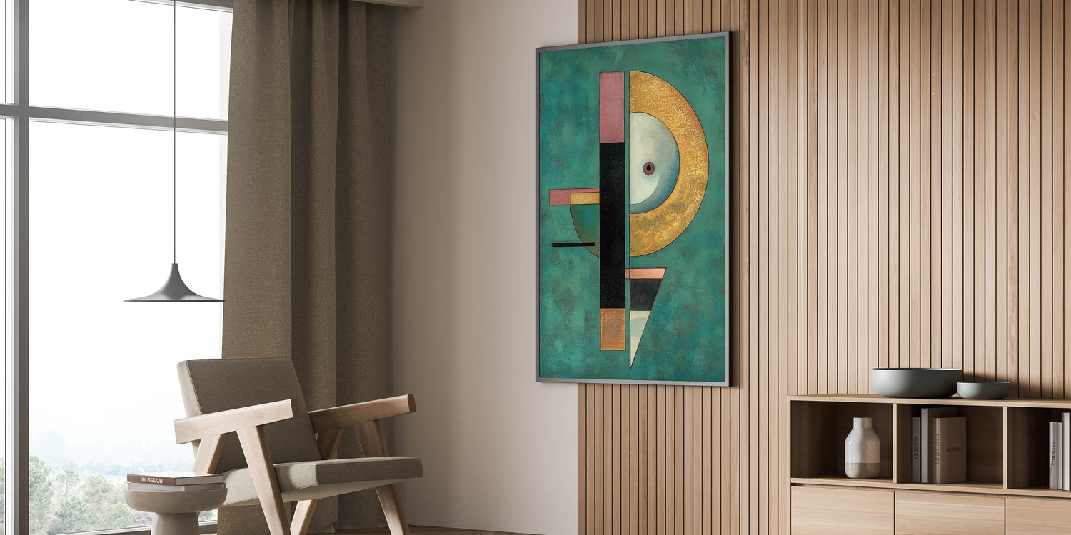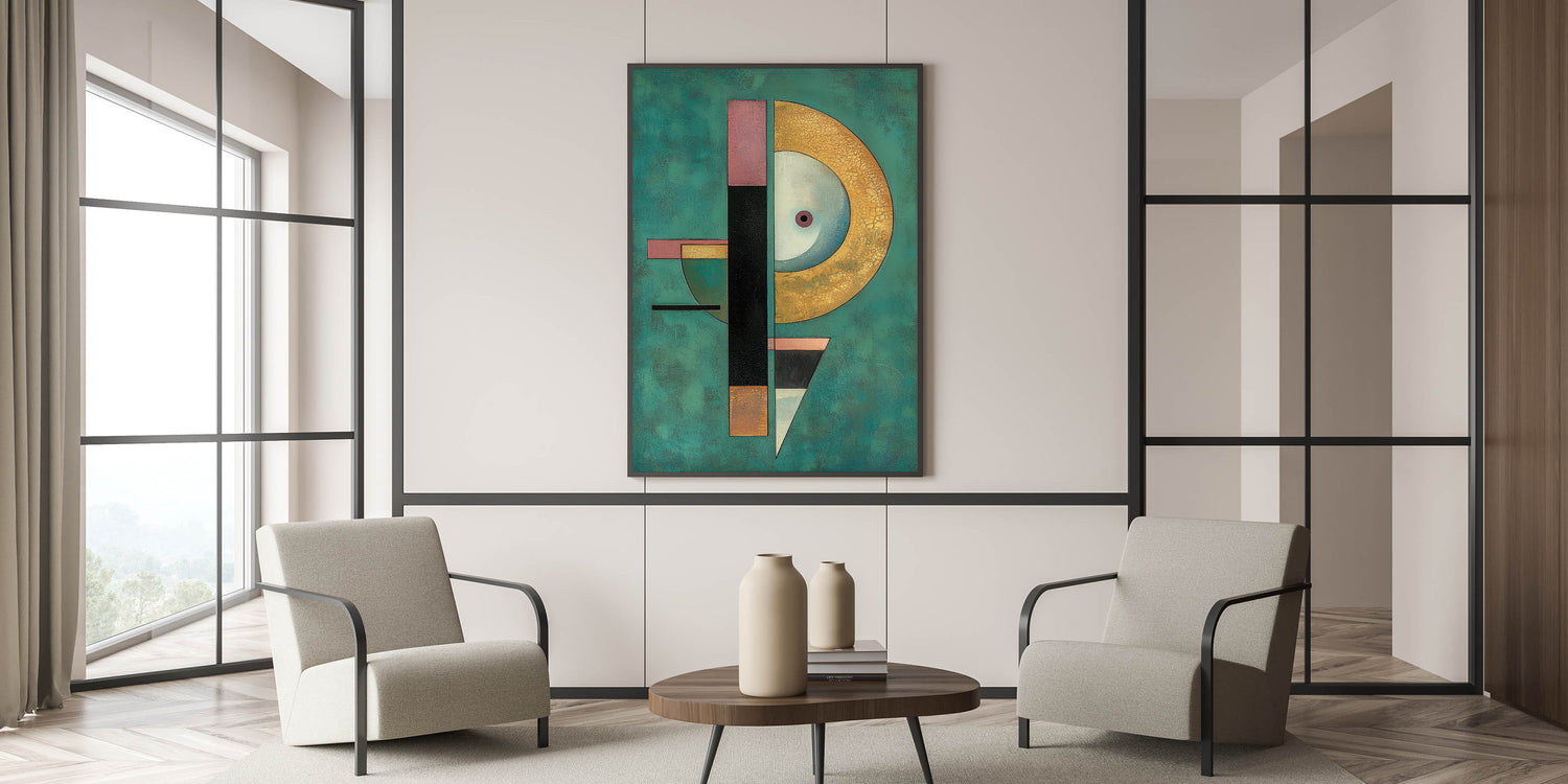 Bring bold sophistication to your space with this living room wall art, a striking geometric abstract composition featuring rich teal, gold, black, and pink hues. The structured shapes and textured elements create a modern and retro-inspired aesthetic, making this modern wall art perfect for contemporary interiors. The balance of bold colors and dynamic design makes this piece a standout addition to any décor.