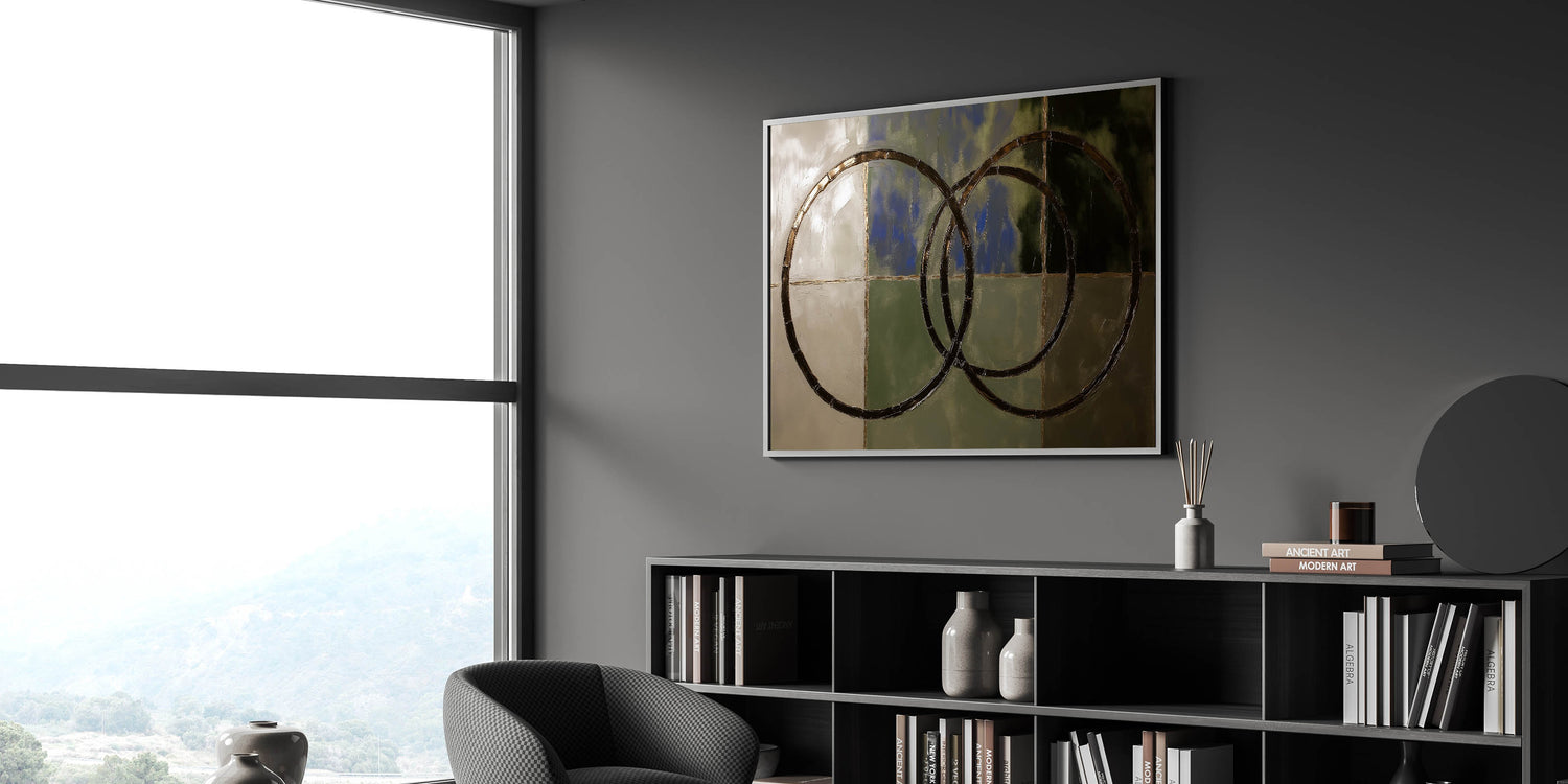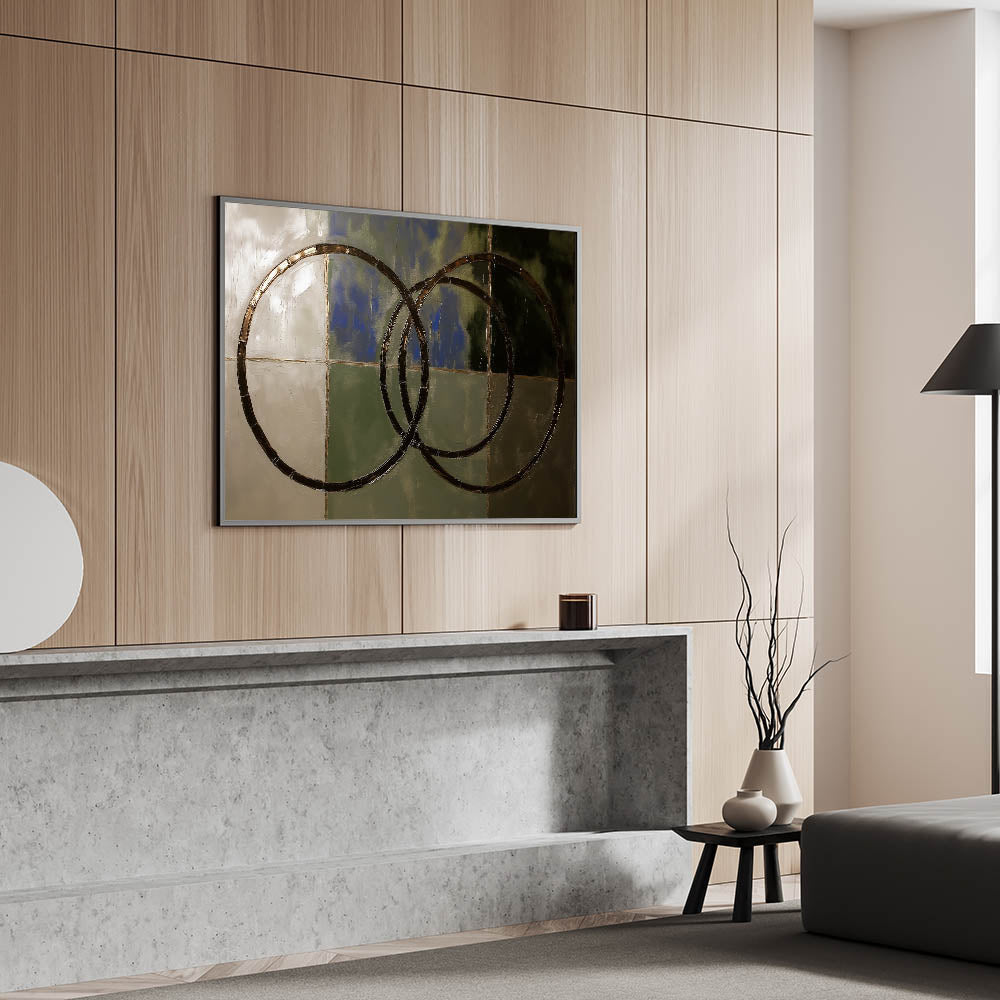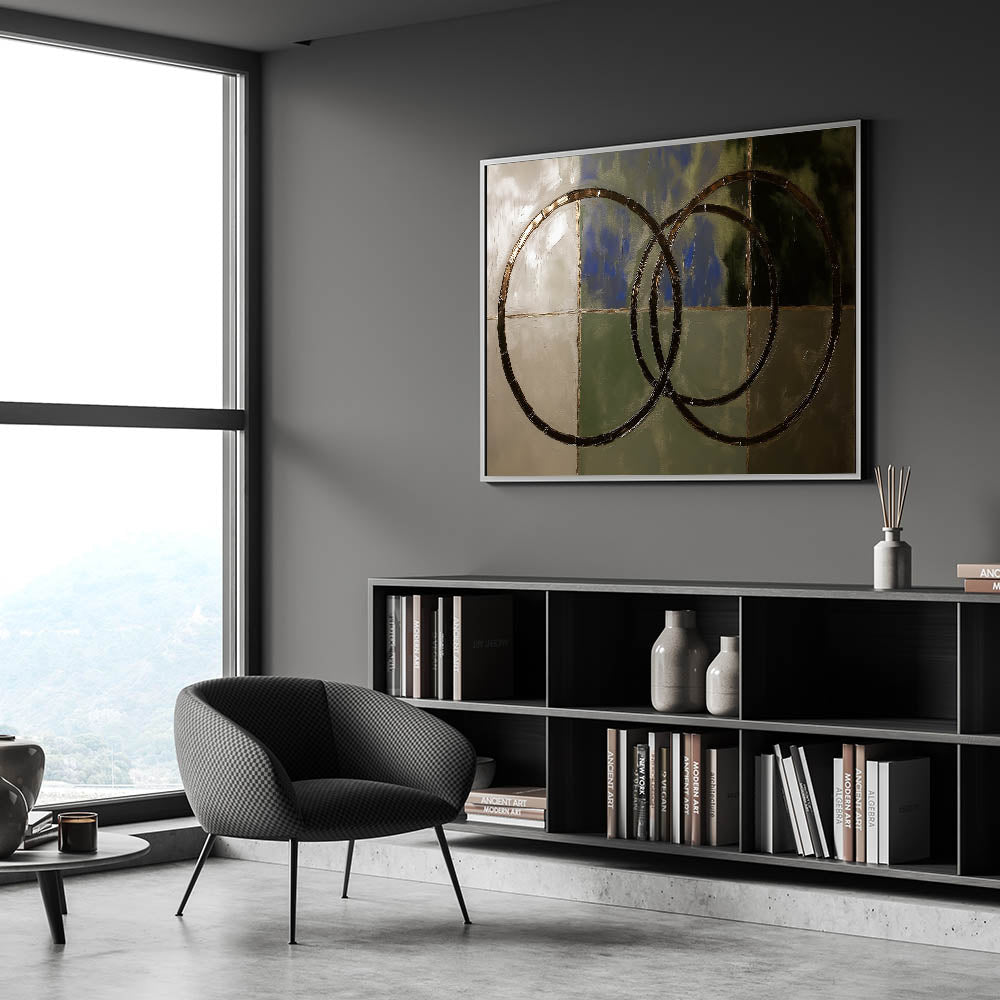 Transform your space with this geometric abstract wall art, designed to bring depth and elegance to any modern living room decor. Featuring intersecting metallic gold and black rings against a textured green, beige, and blue background, this artwork blends contemporary sophistication with artistic expression. The rich earthy tones and dynamic composition make it a perfect centerpiece for any space.