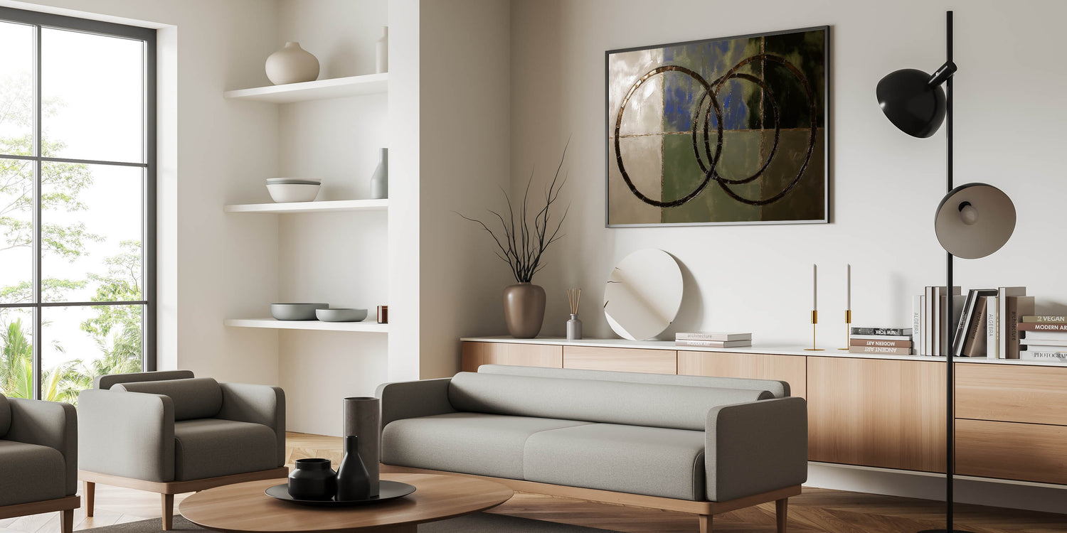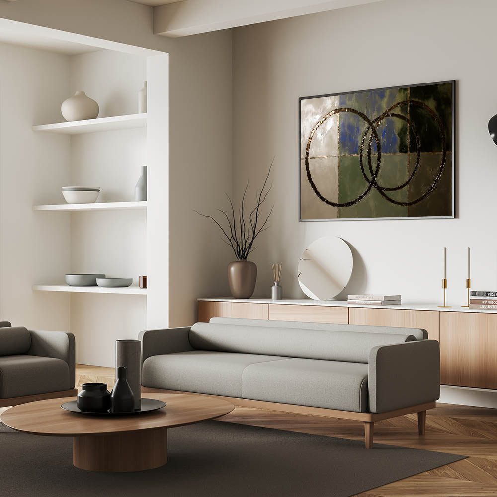 - Elegant Geometric Design: A blend of abstract art pieces and structured form for a contemporary living room art aesthetic.