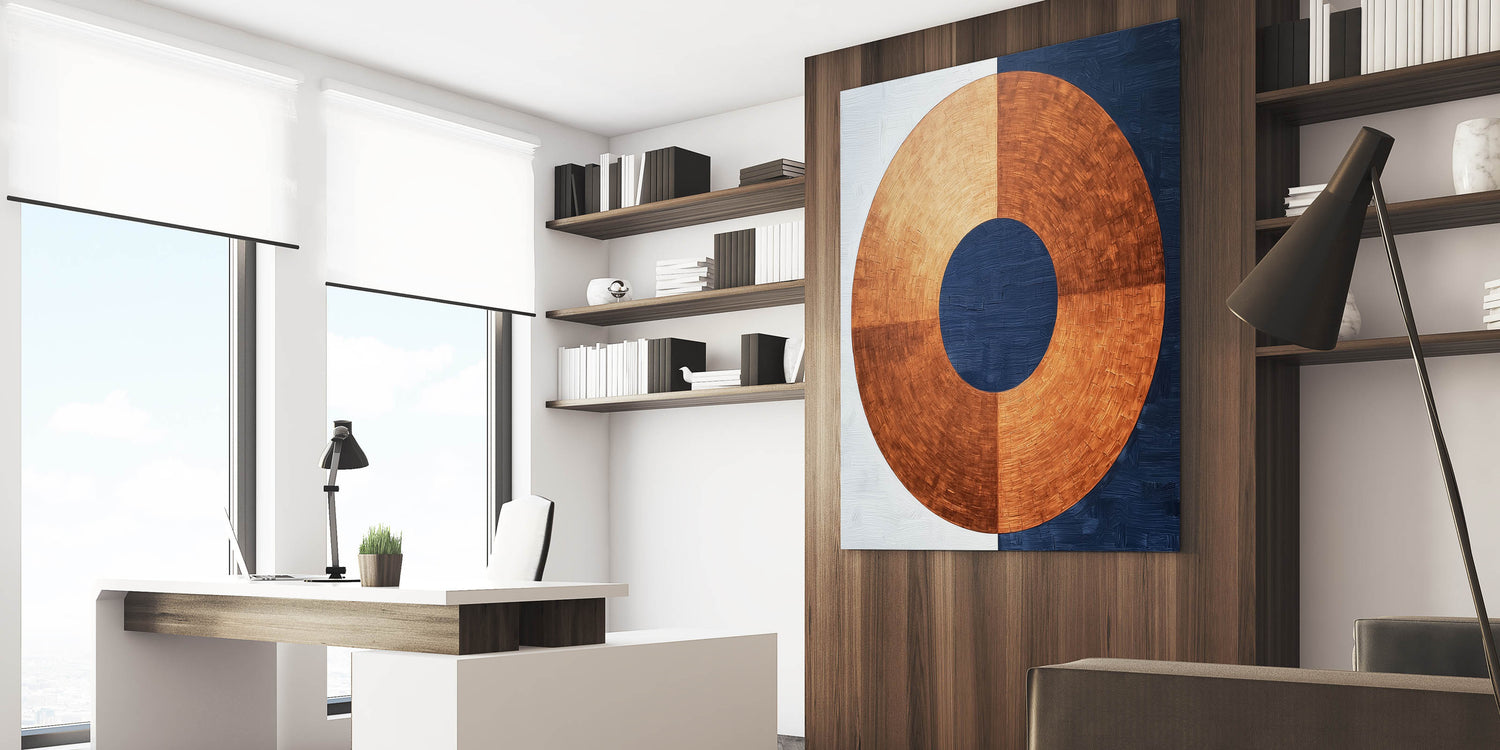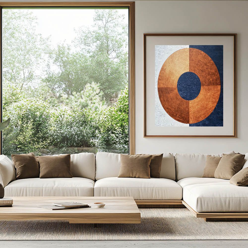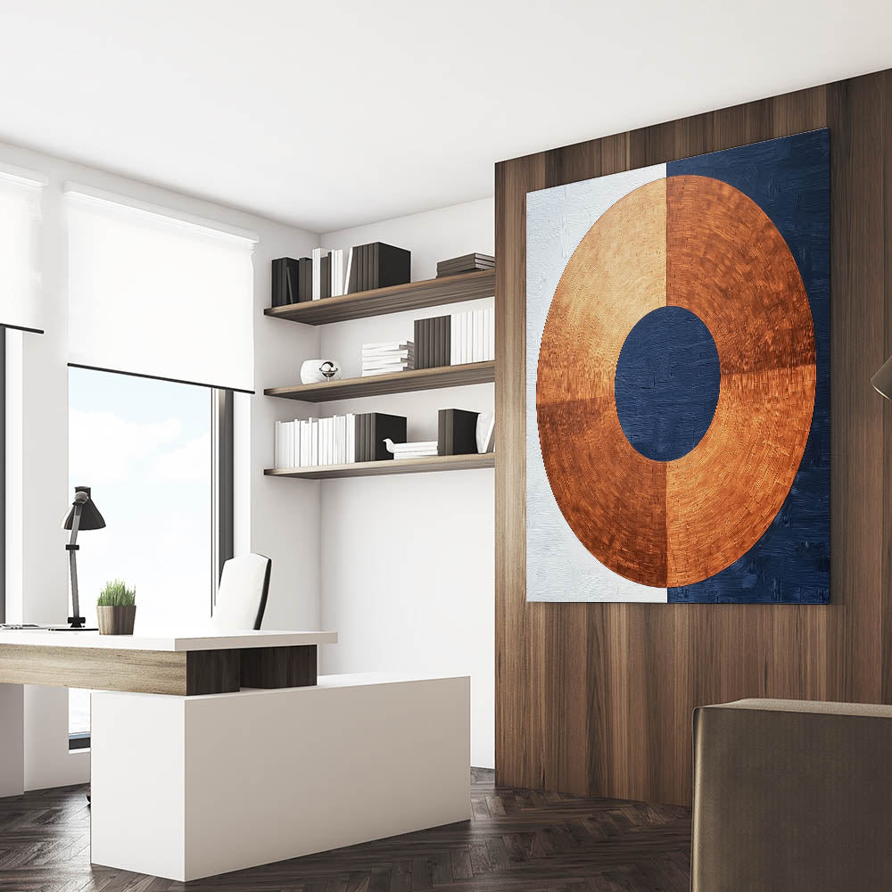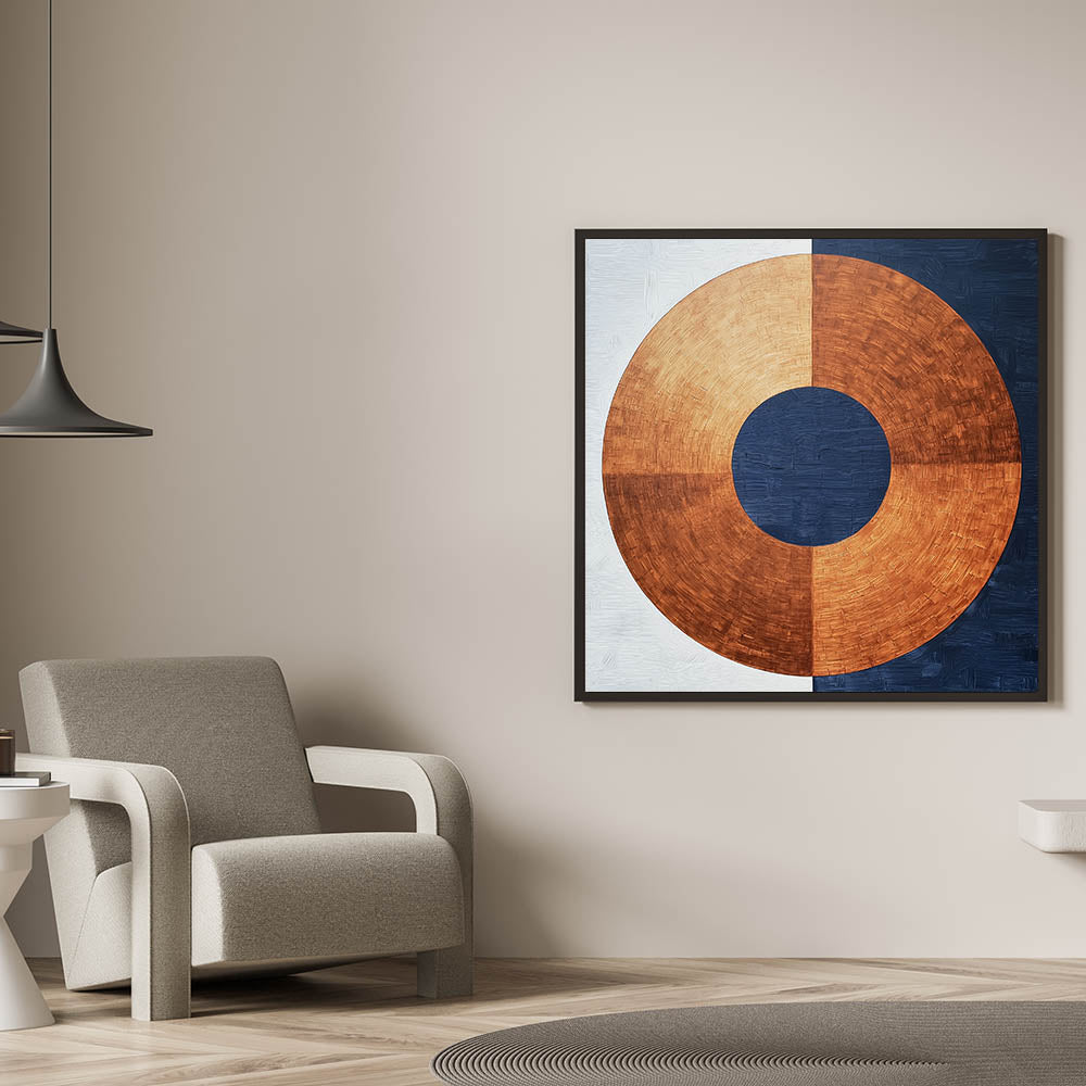 Elevate your space with this stunning geometric abstract wall art, featuring a bold circular design in rich navy blue, metallic gold, and crisp white. This modern wall art piece exudes sophistication and contemporary appeal, making it an excellent choice for wall art for living rooms, offices, or upscale interiors. The clean lines and textured details create a striking contrast, blending artistic expression with minimalist elegance.