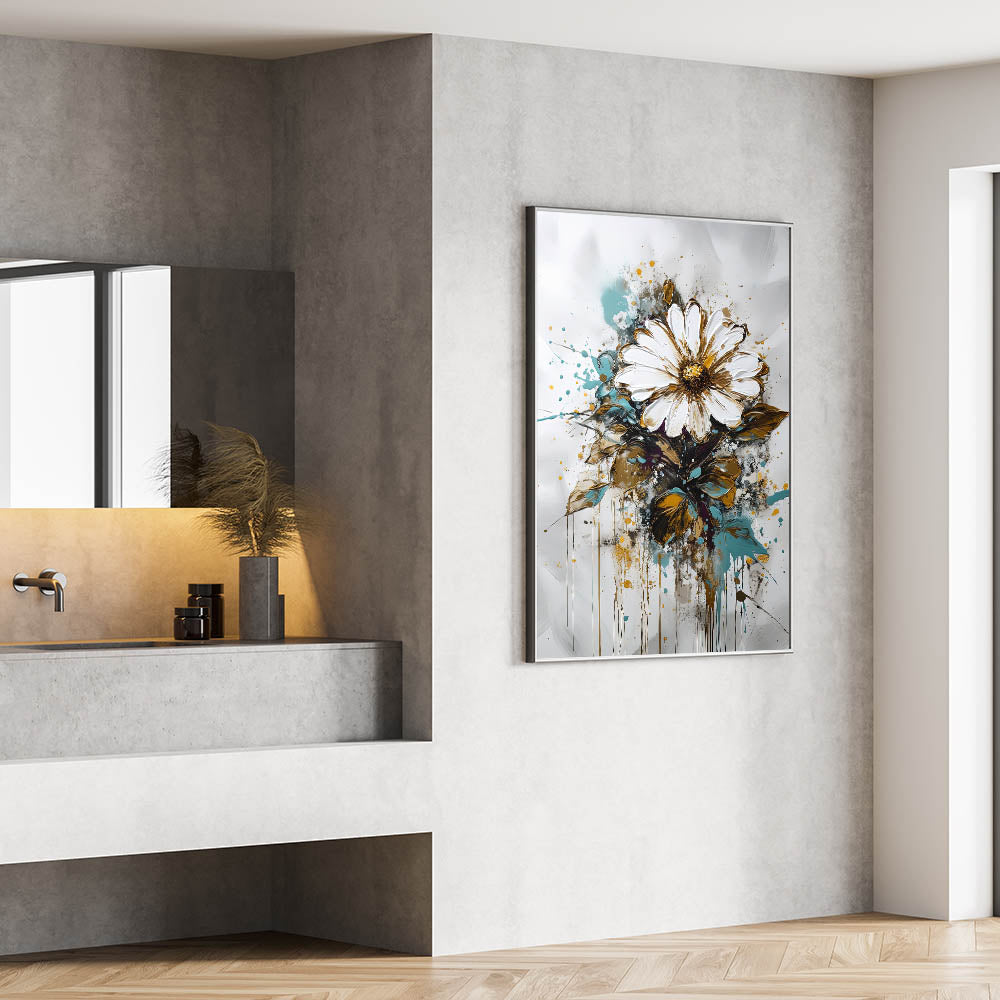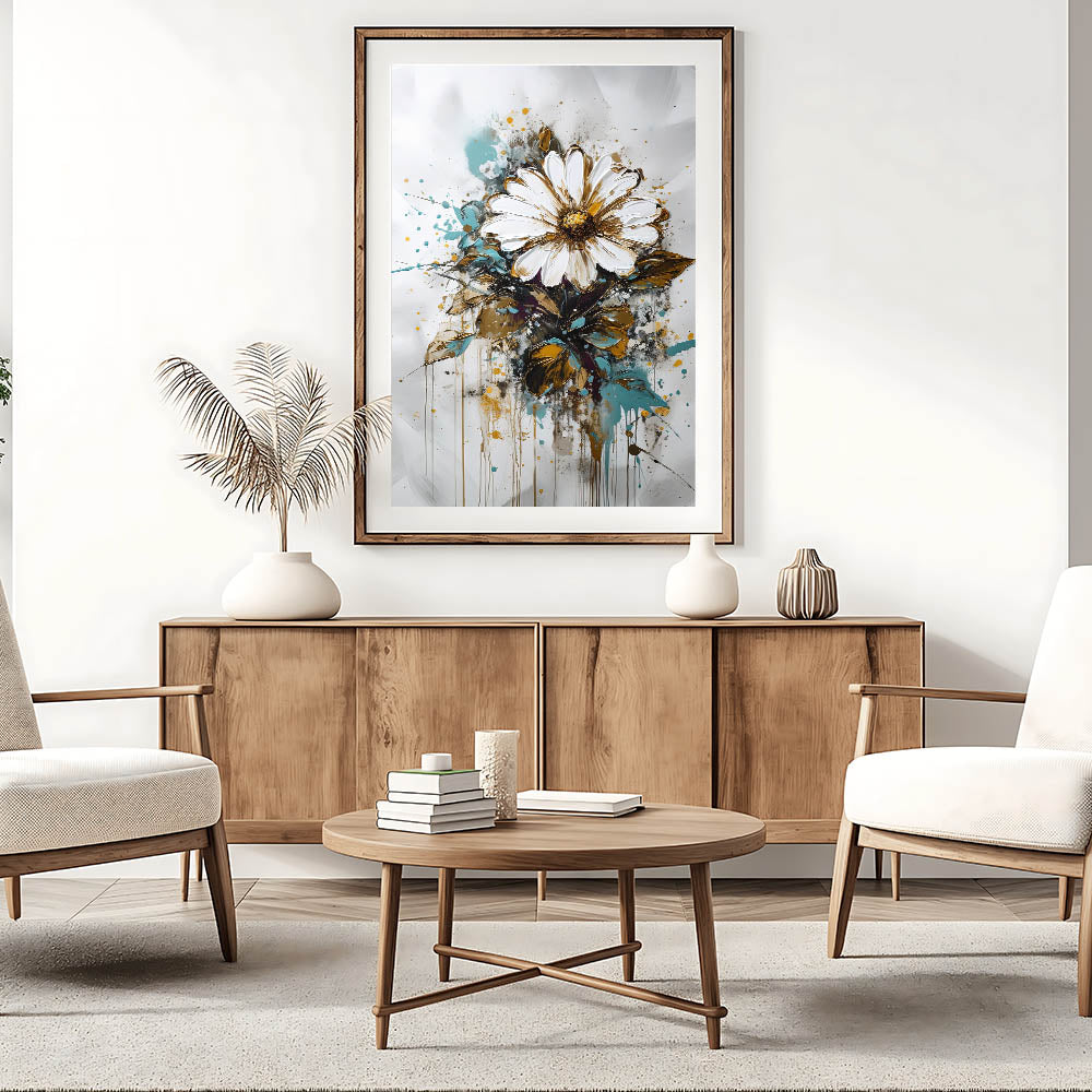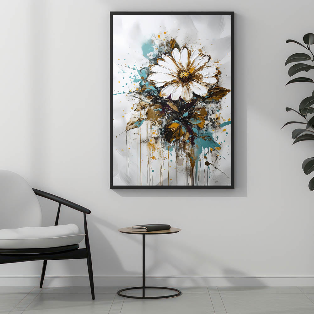 Infuse your space with artistic sophistication using this Gold & Teal Floral Abstract Wall Art. Featuring a bold, textured daisy with shimmering gold accents, rich teal brushstrokes, and expressive splashes of color, this living room wall art embodies modern elegance. The striking contrast between metallic highlights and deep earthy hues makes it an ideal statement piece for those who appreciate modern wall art with a unique and luxurious appeal.