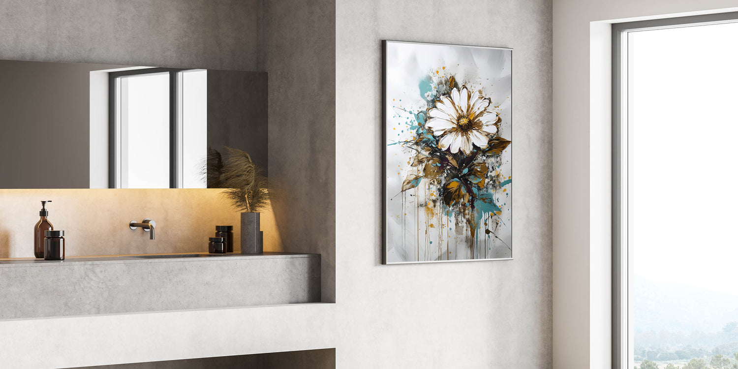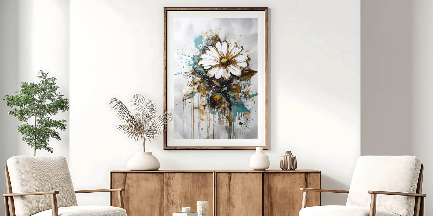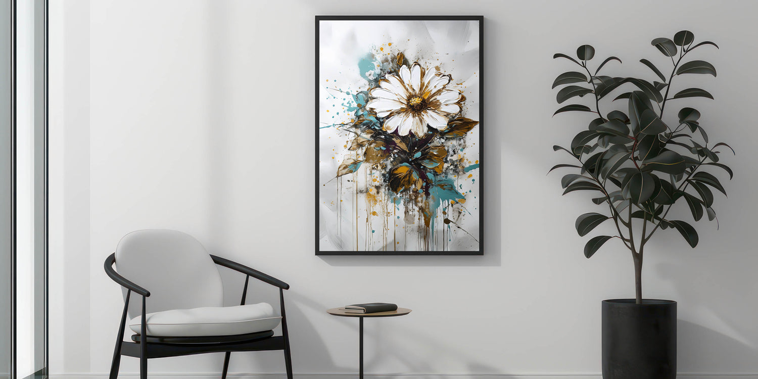 Infuse your space with artistic sophistication using this Gold & Teal Floral Abstract Wall Art. Featuring a bold, textured daisy with shimmering gold accents, rich teal brushstrokes, and expressive splashes of color, this living room wall art embodies modern elegance. The striking contrast between metallic highlights and deep earthy hues makes it an ideal statement piece for those who appreciate modern wall art with a unique and luxurious appeal.