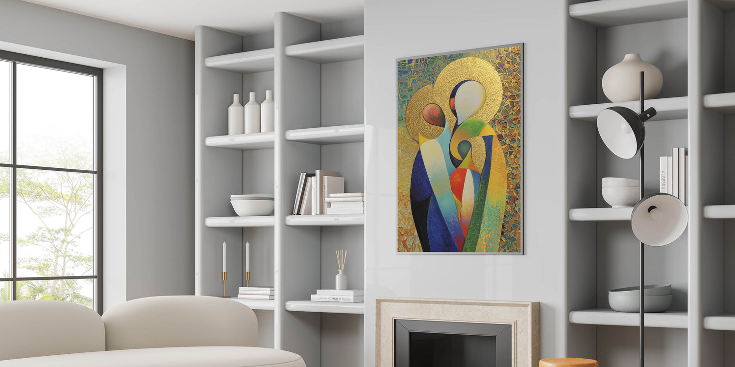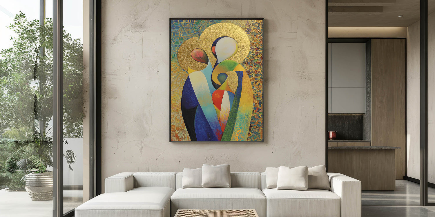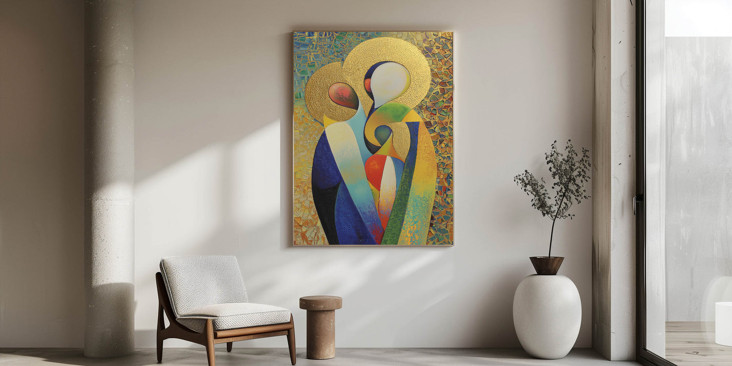 Infuse your space with elegance and meaning with this golden abstract wall art, featuring a stunning fusion of vibrant blues, greens, golds, and reds. This modern wall art showcases an intricate composition of geometric shapes and metallic gold halos, adding depth and texture. The richly textured background and mosaic-like patterns bring a sense of luxury and spirituality, making it perfect as wall art for living room spaces, offices, or artistic interiors.