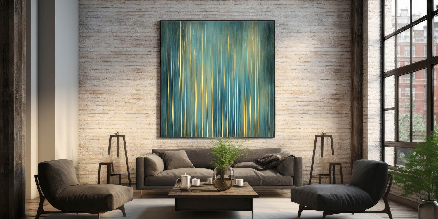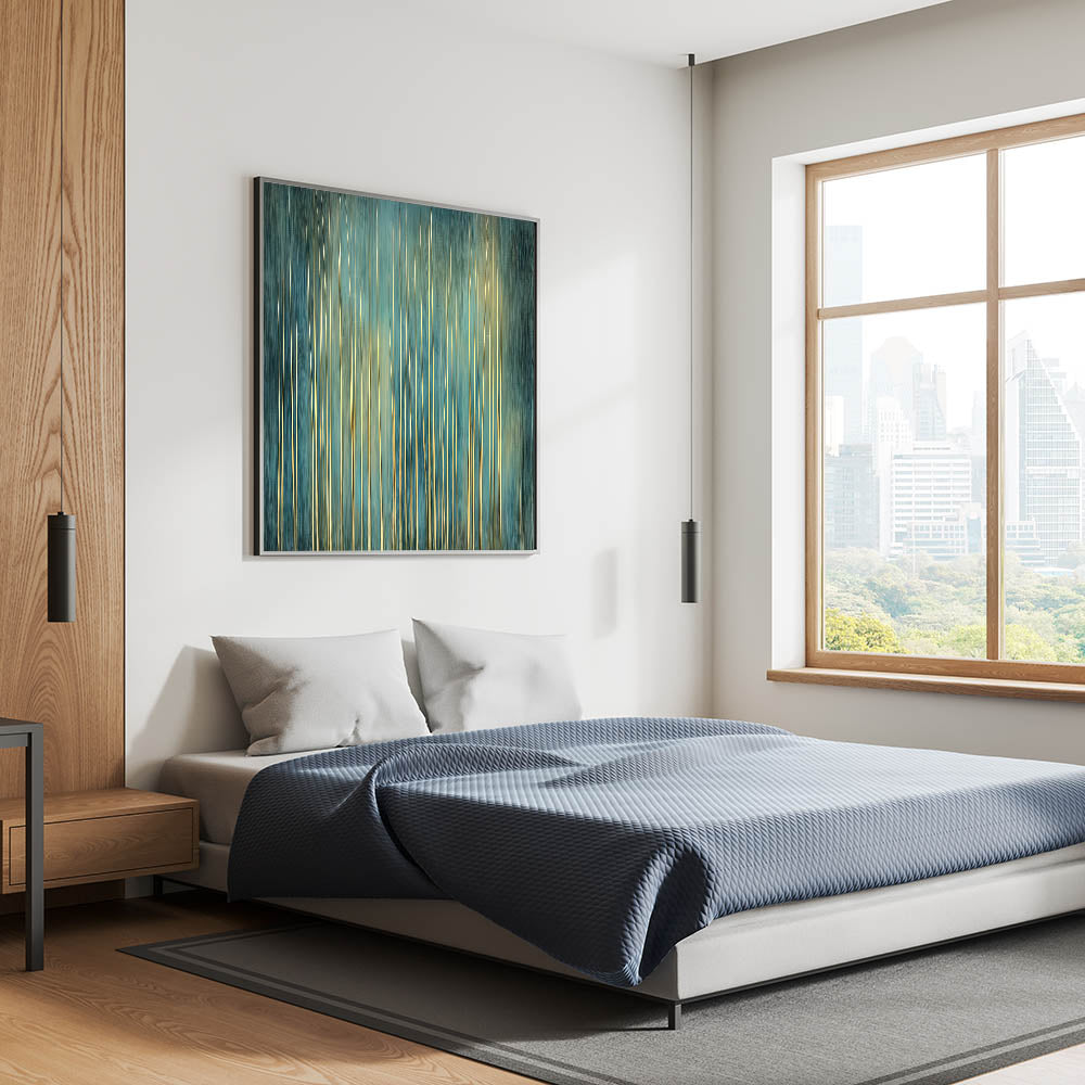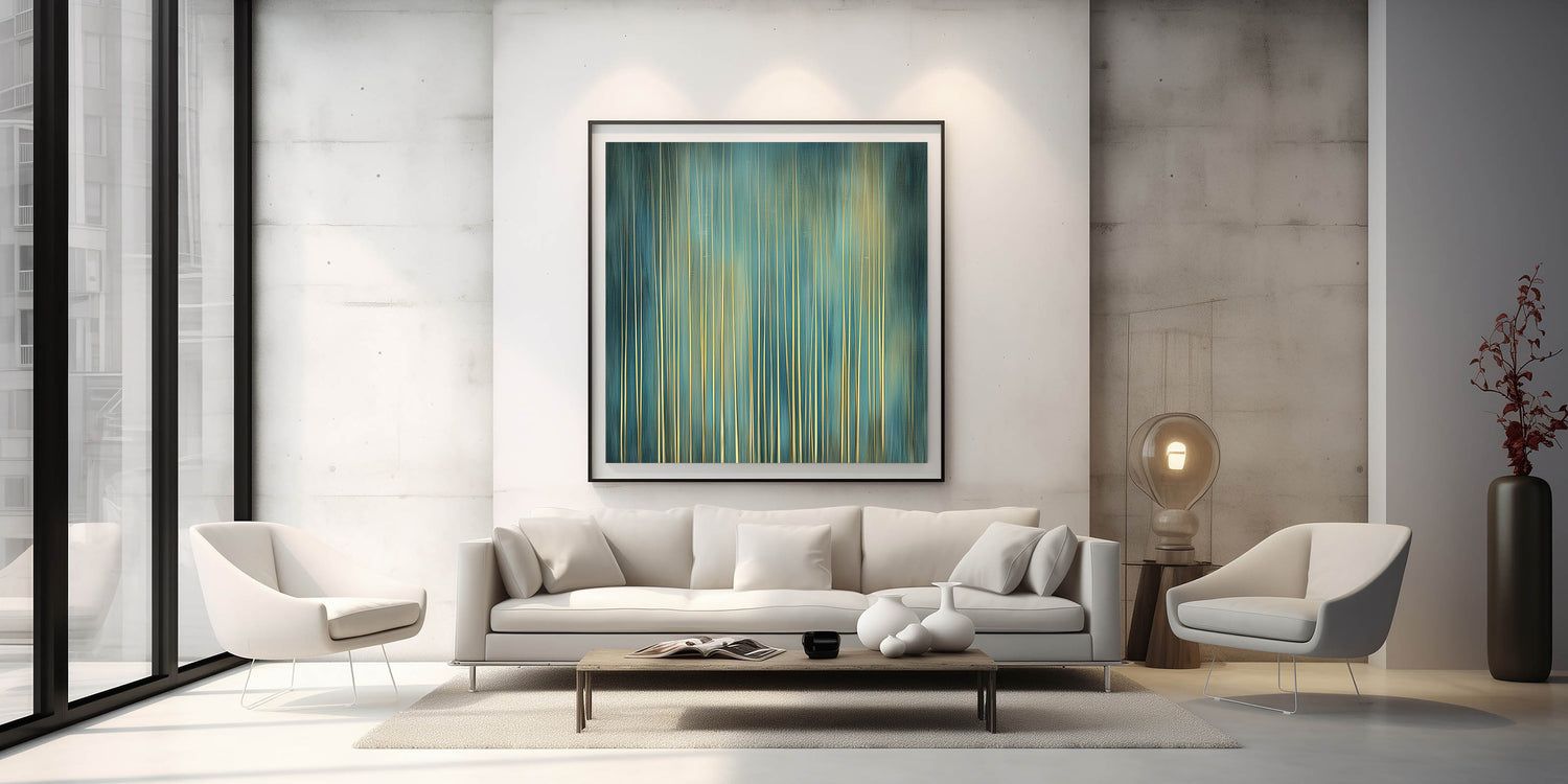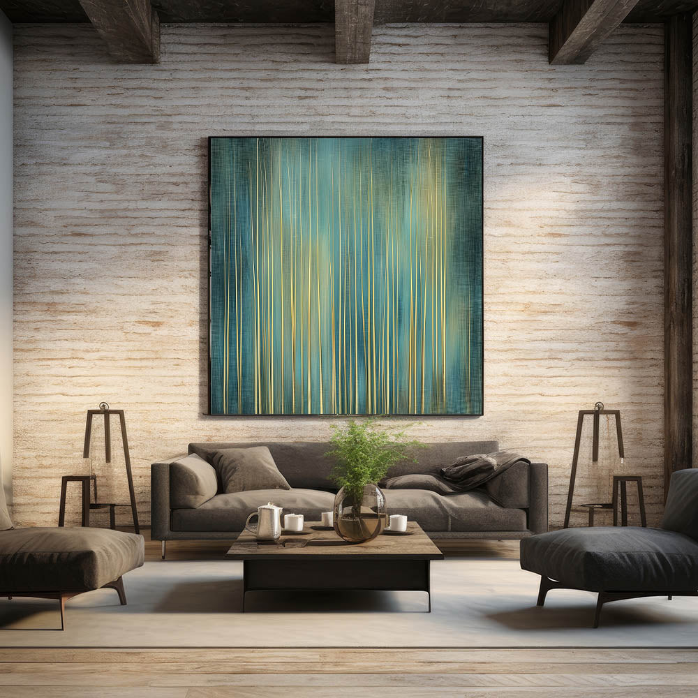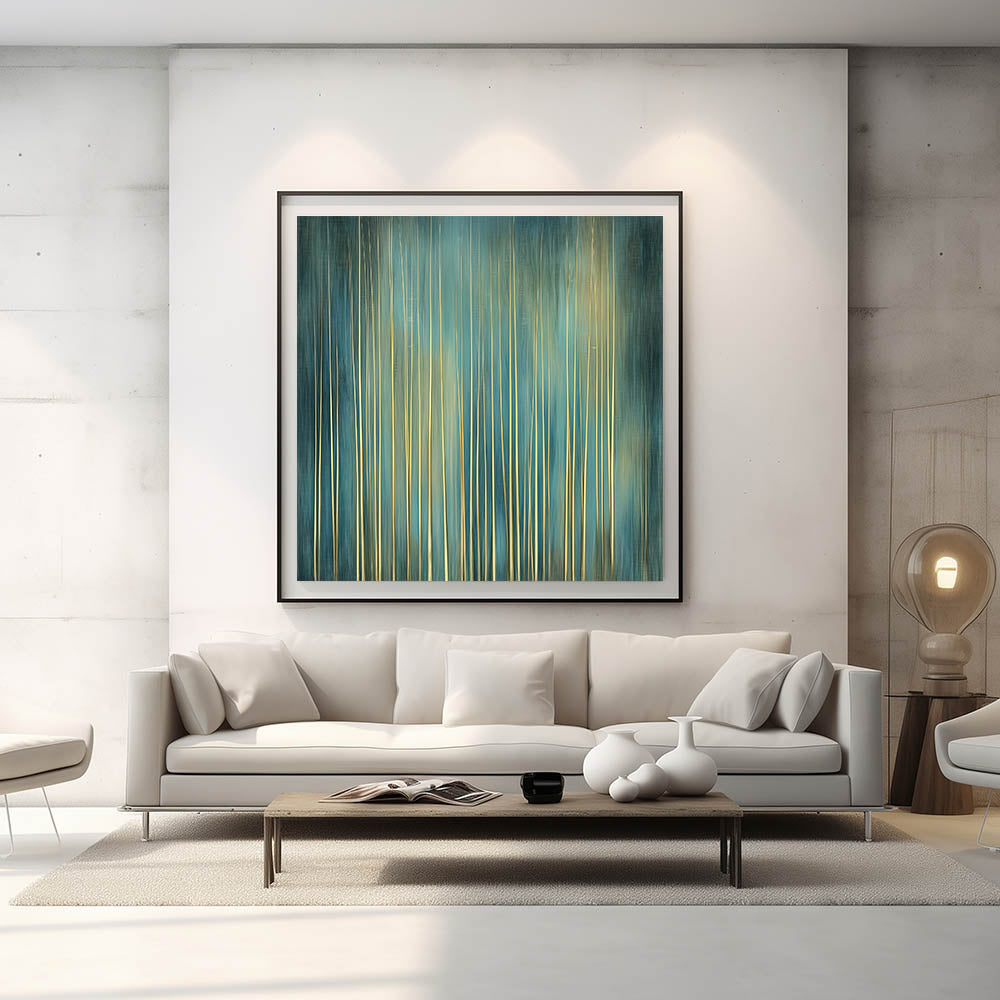 Introduce a sense of elegance and tranquility to your space with this gold and teal abstract wall art, featuring tall, golden vertical lines resembling bamboo or reeds. The rich teal and deep blue background, accented with metallic gold highlights, creates a calming yet sophisticated ambiance. This modern wall art is perfect for wall art for living rooms, offices, or minimalist interiors, adding an organic yet contemporary touch. Available in canvas wall art, framed wall art, and acrylic glass, this artwork complements both modern and nature-inspired décor.