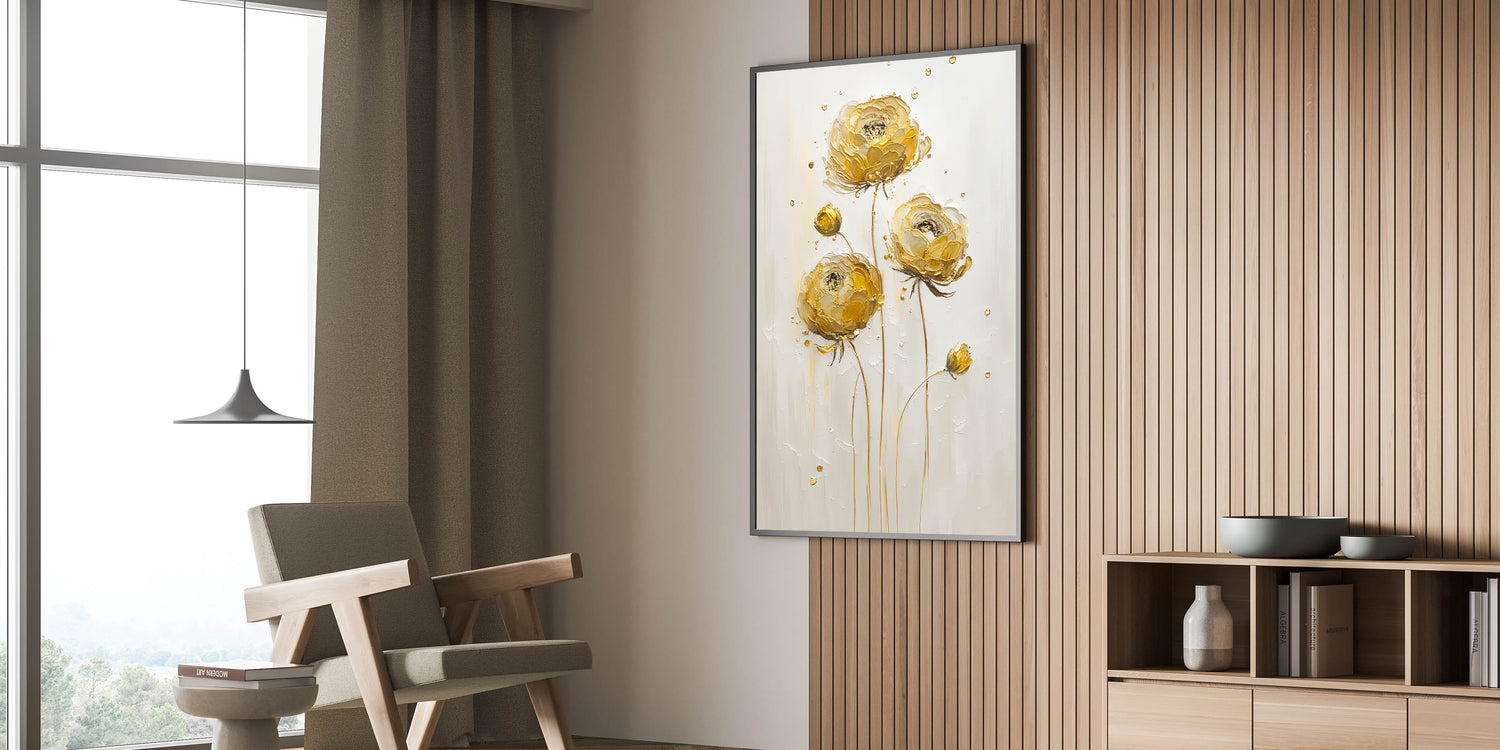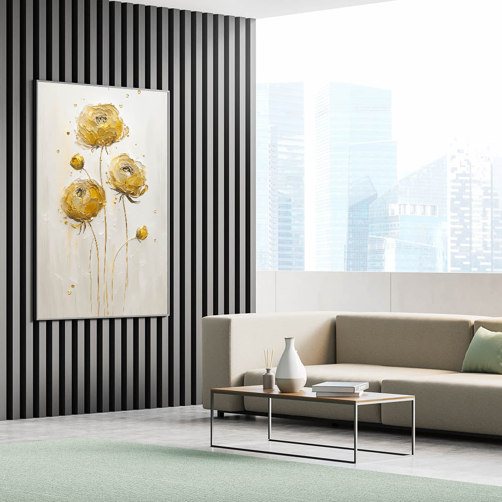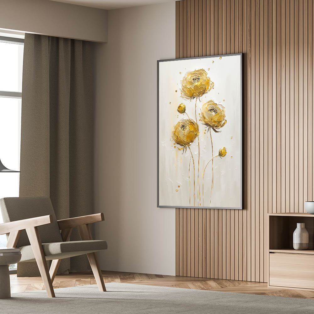 Add a touch of elegance to your space with this Golden Bloom Minimalist Wall Art, a delicate fusion of soft gold florals and sleek modern design. This living room wall art highlights intricate floral textures with a refined metallic glow, creating a luxurious and contemporary statement piece. The neutral background complements any decor style, making it a timeless addition to your collection of modern wall art.