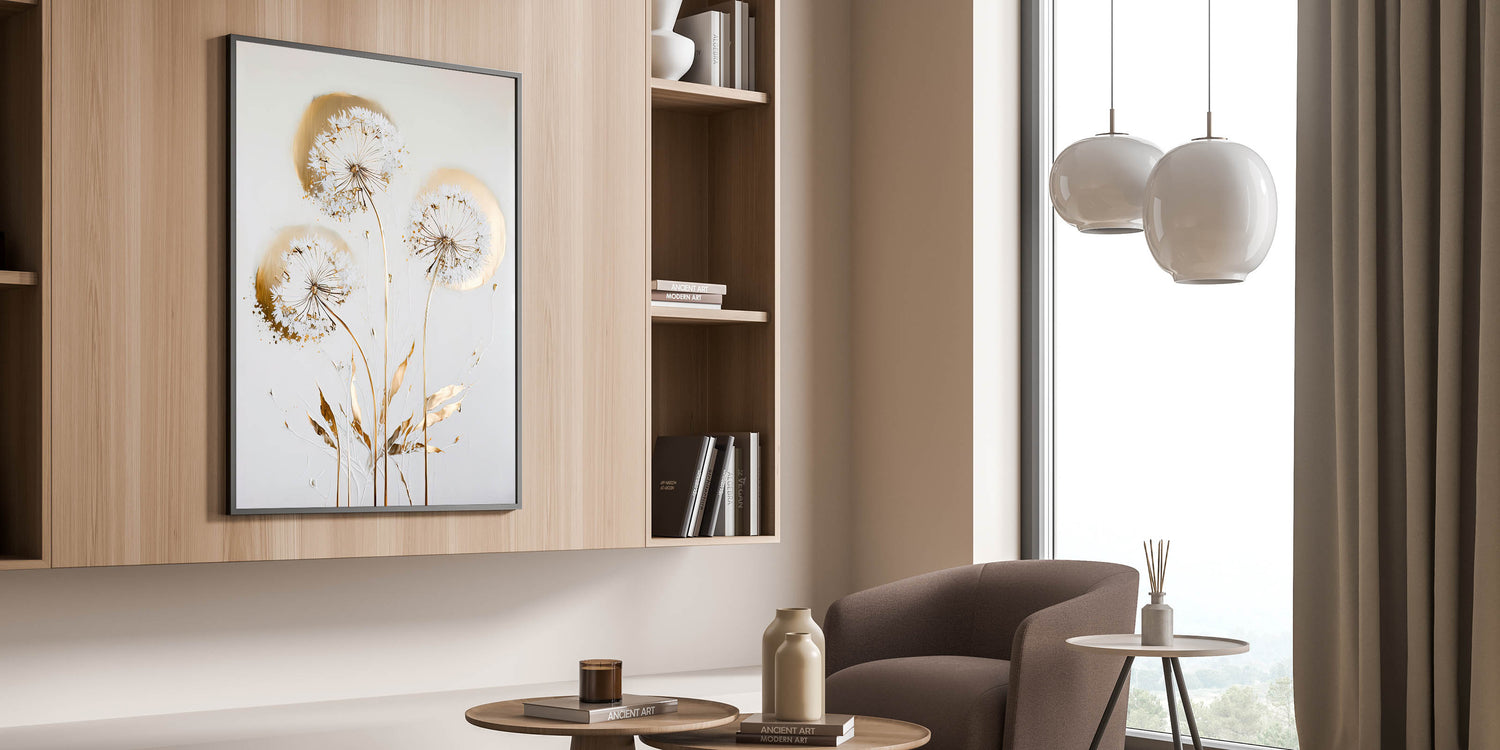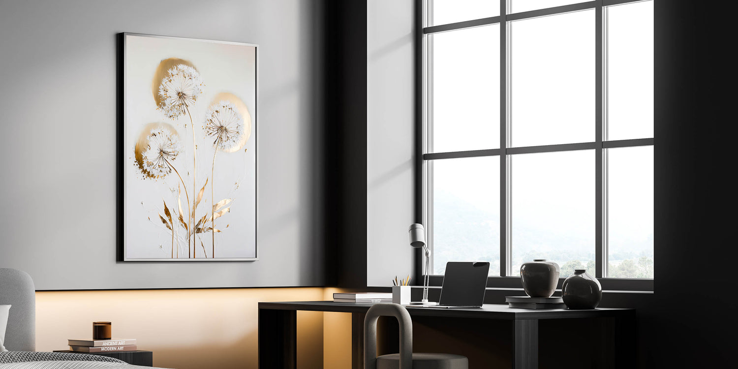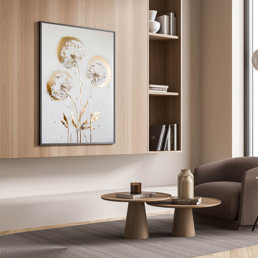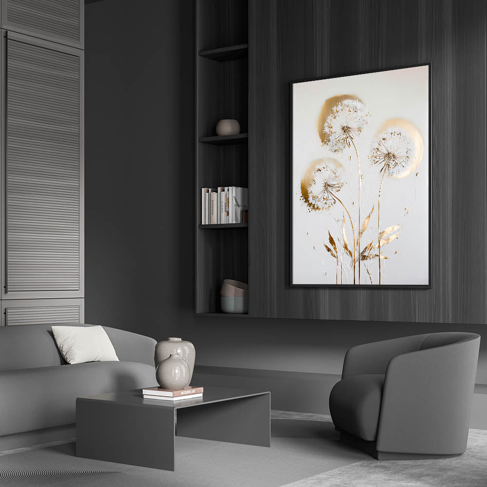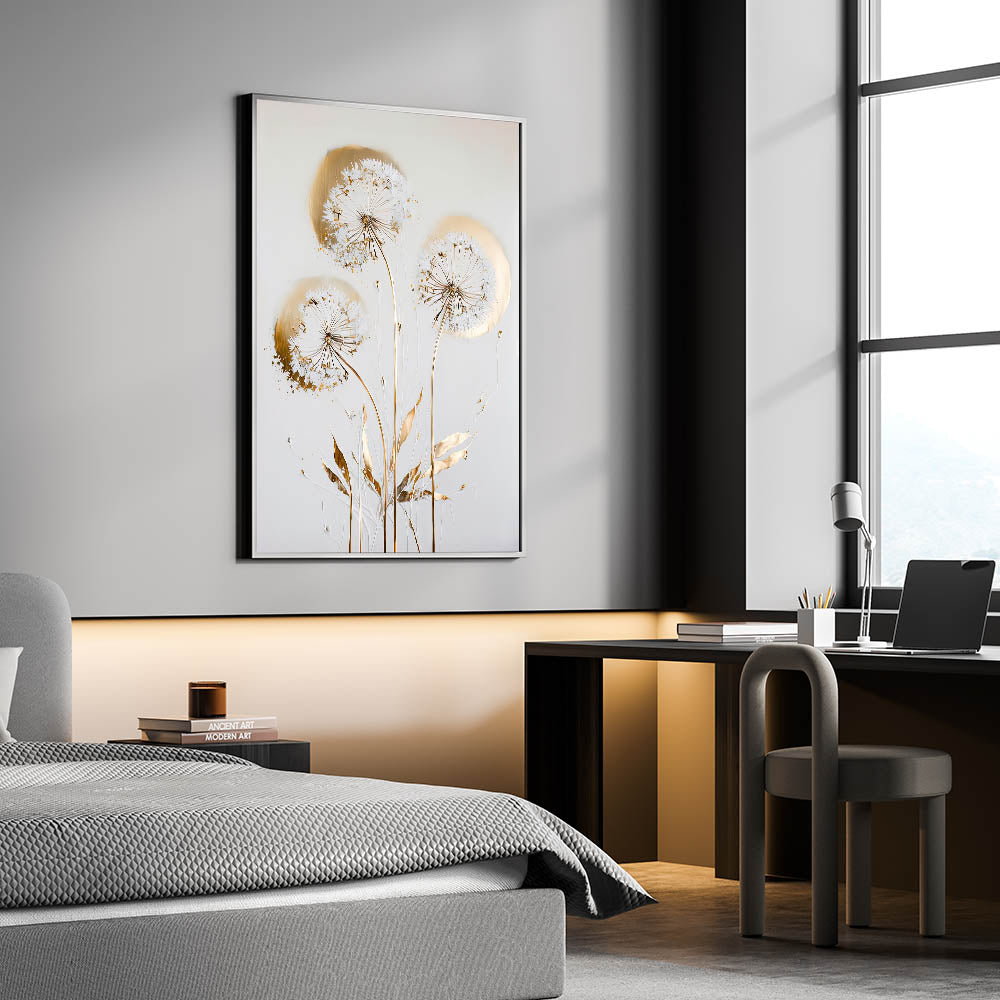 Add a touch of luxury and serenity to your space with this Golden Dandelion Wall Art, an elegant fusion of delicate floral elements and metallic gold accents. This living room wall art features ethereal dandelions with intricate golden detailing, making it a refined and stylish choice for modern wall art lovers. The soft, neutral background enhances the sophistication of this canvas wall art, making it a timeless decor piece.