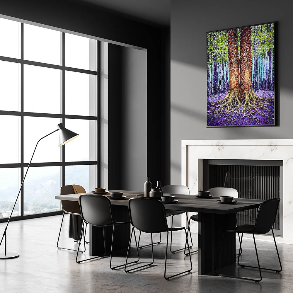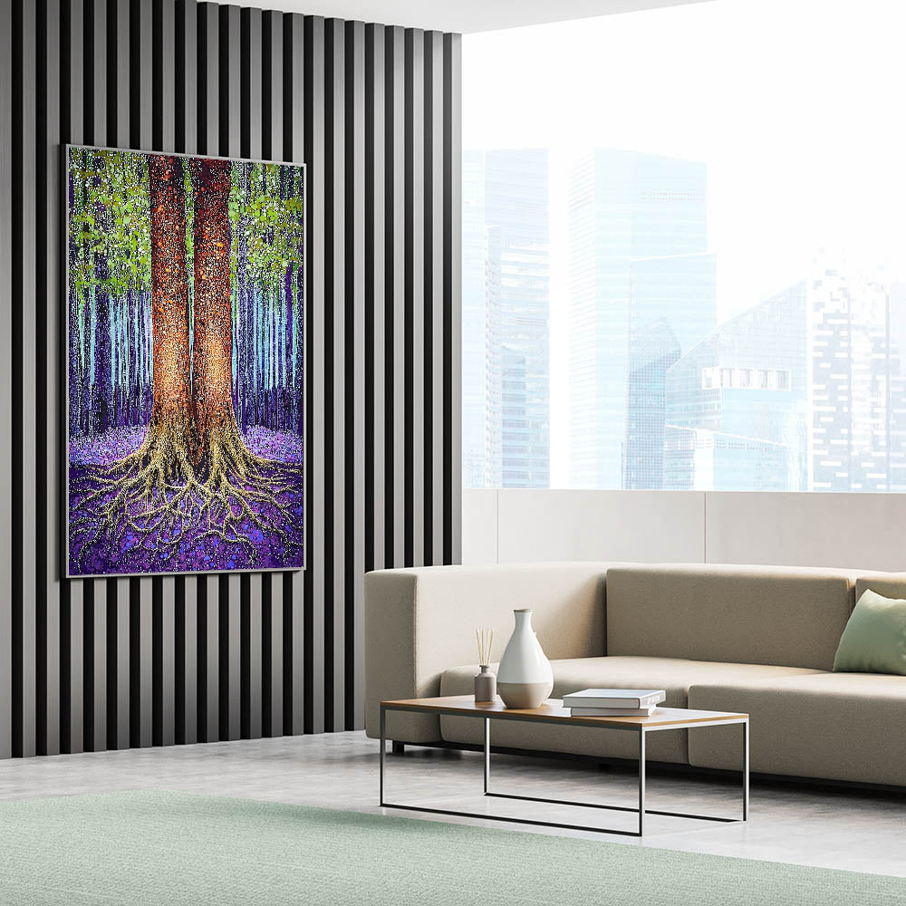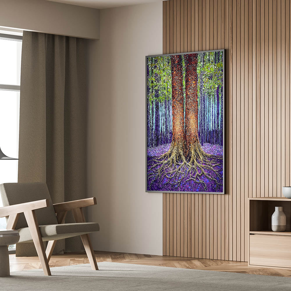 This large canvas art print is perfect for nature lovers and art enthusiasts who appreciate bold colors and intricate detailing. Whether displayed as framed wall art or canvas wall art, this golden-rooted forest scene brings a sense of harmony and strength to your modern living space.