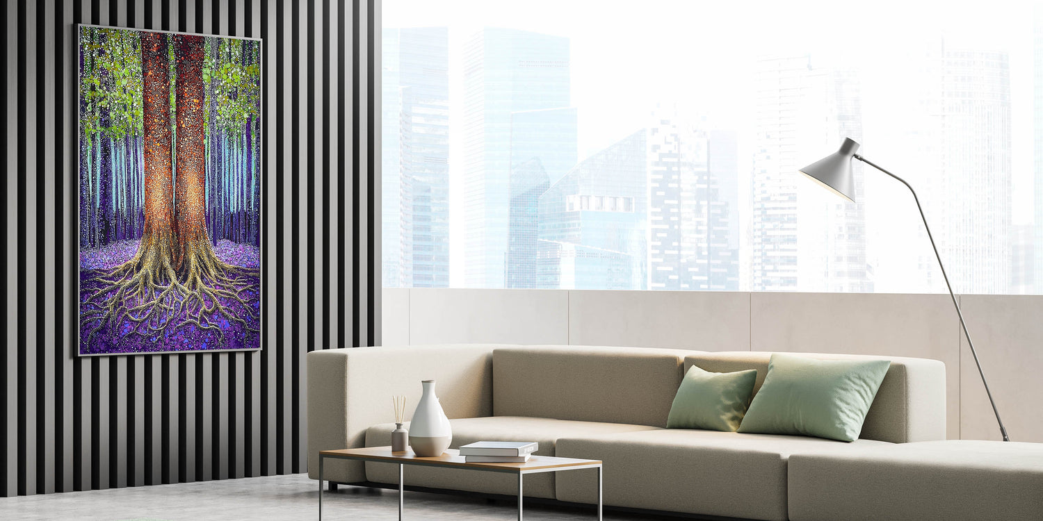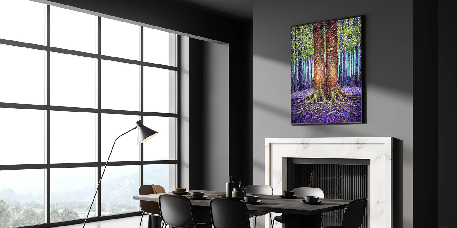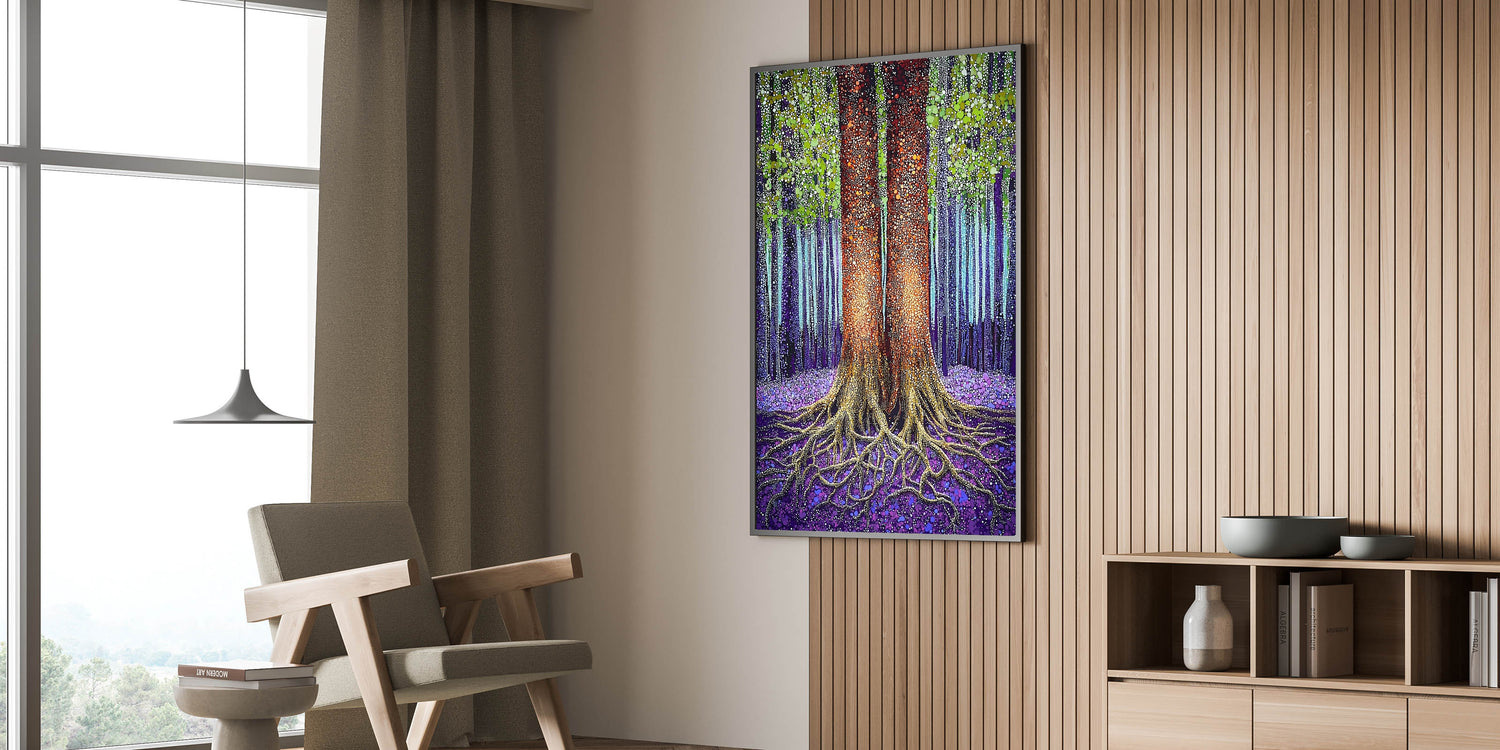 This large canvas art print is perfect for nature lovers and art enthusiasts who appreciate bold colors and intricate detailing. Whether displayed as framed wall art or canvas wall art, this golden-rooted forest scene brings a sense of harmony and strength to your modern living space.