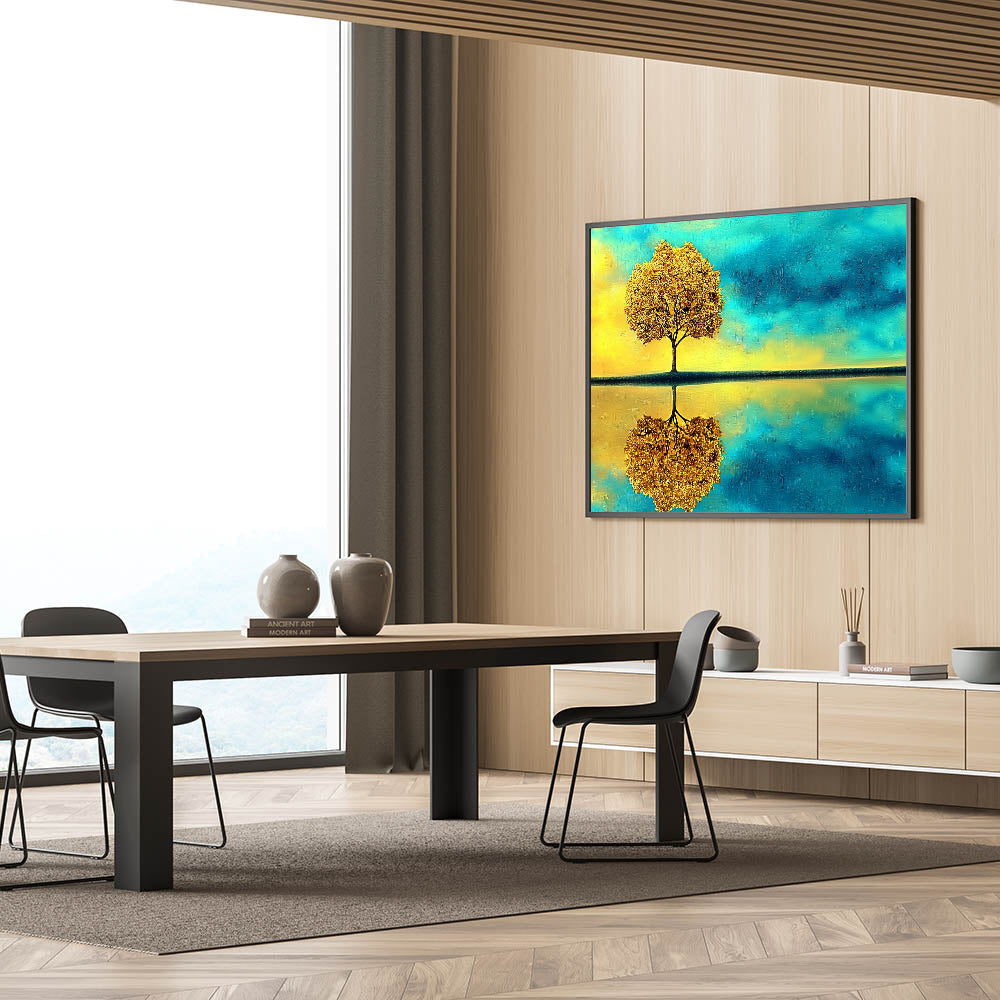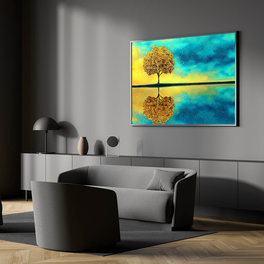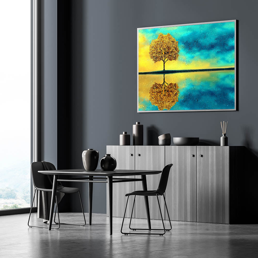 Bring a sense of harmony and elegance to your space with this living room wall art, featuring a stunning golden tree mirrored in a tranquil body of water. The rich golden hues contrast beautifully against the teal and deep blue sky, creating a mesmerizing and surreal atmosphere. This modern wall art is an ideal statement piece, adding warmth and sophistication to contemporary interiors. Whether displayed as canvas wall art or framed wall art, this artwork transforms any space with its serene and luminous quality.