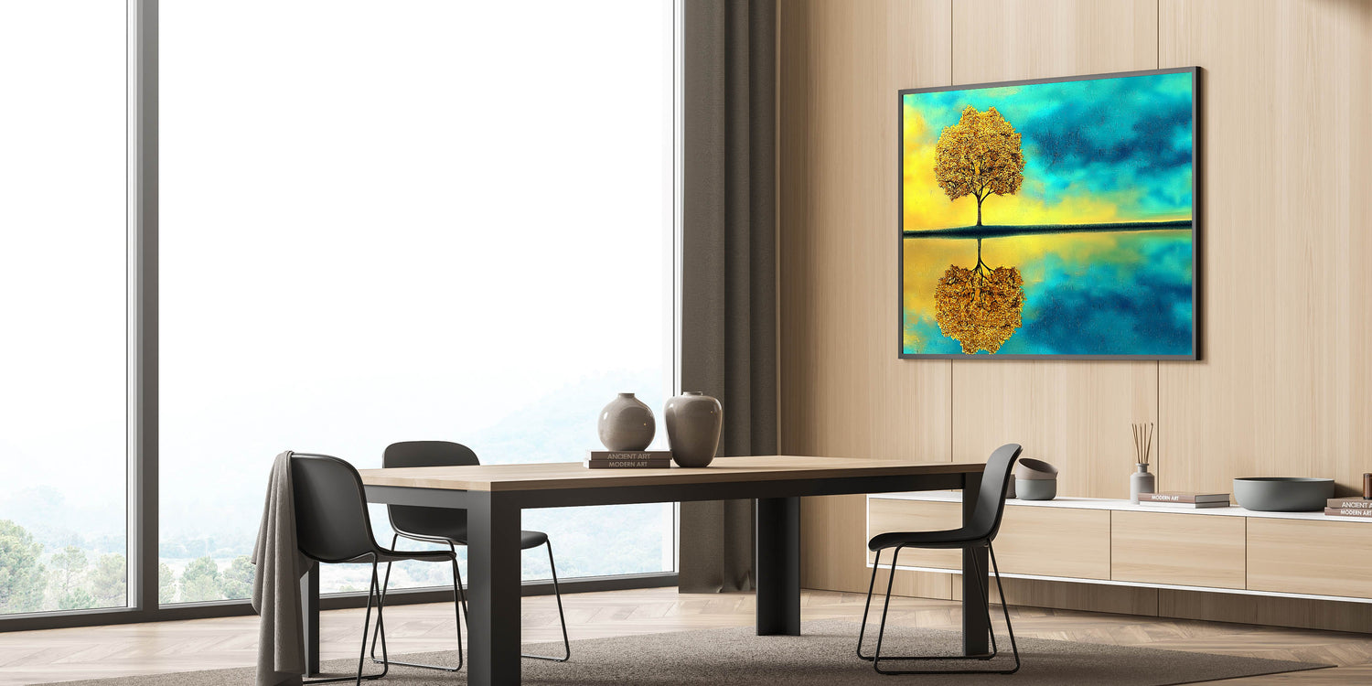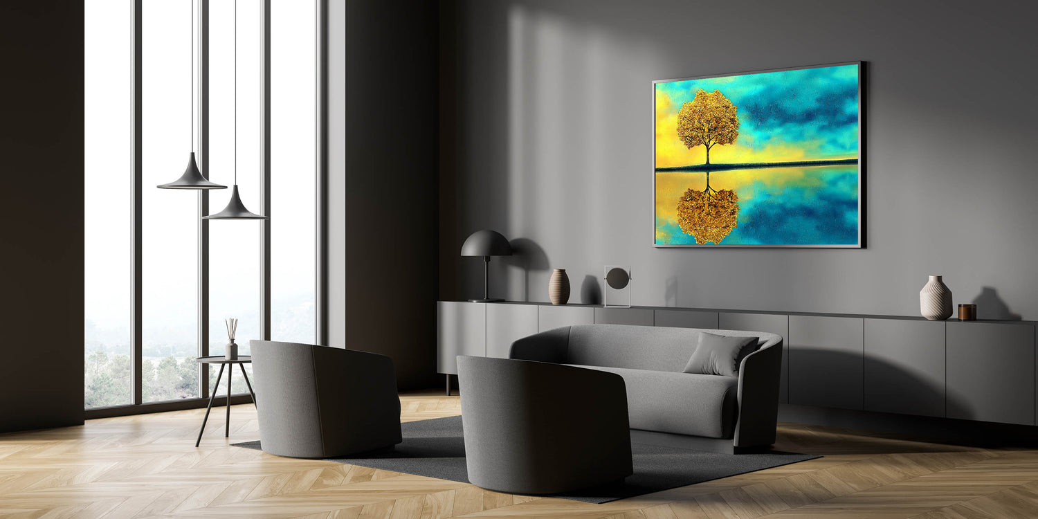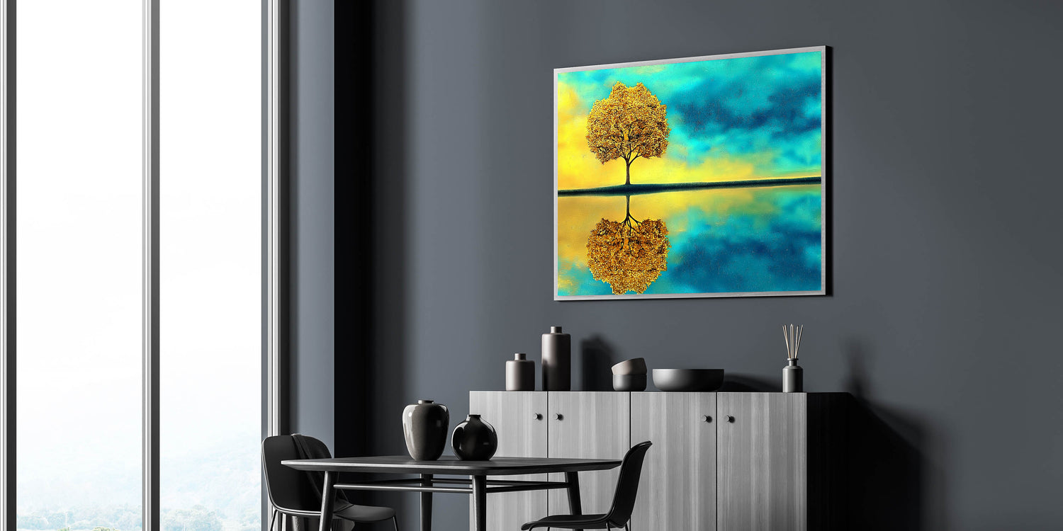 Bring a sense of harmony and elegance to your space with this living room wall art, featuring a stunning golden tree mirrored in a tranquil body of water. The rich golden hues contrast beautifully against the teal and deep blue sky, creating a mesmerizing and surreal atmosphere. This modern wall art is an ideal statement piece, adding warmth and sophistication to contemporary interiors. Whether displayed as canvas wall art or framed wall art, this artwork transforms any space with its serene and luminous quality.