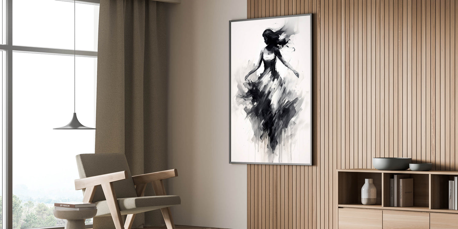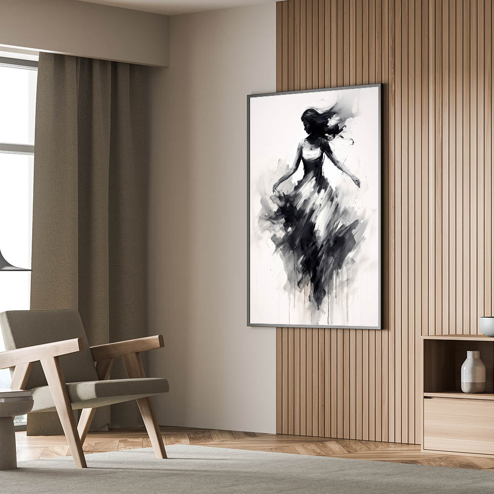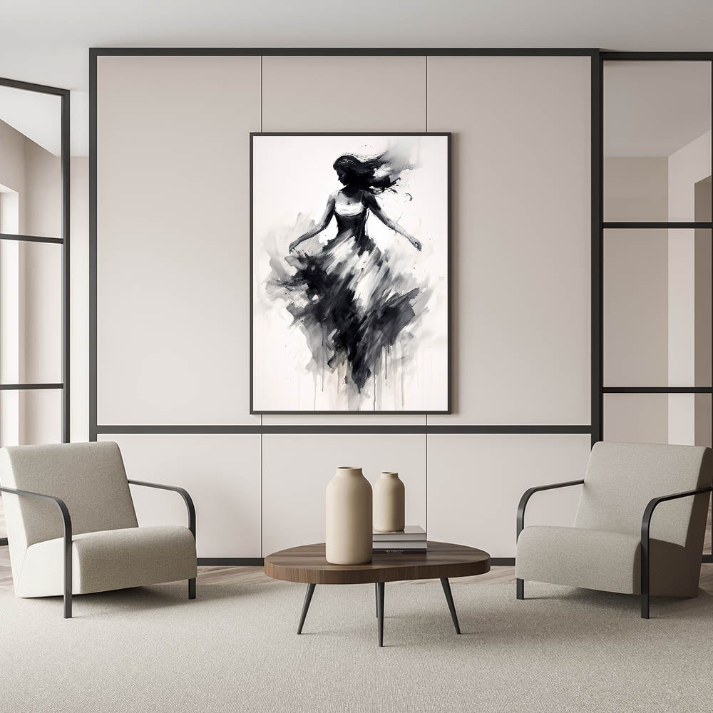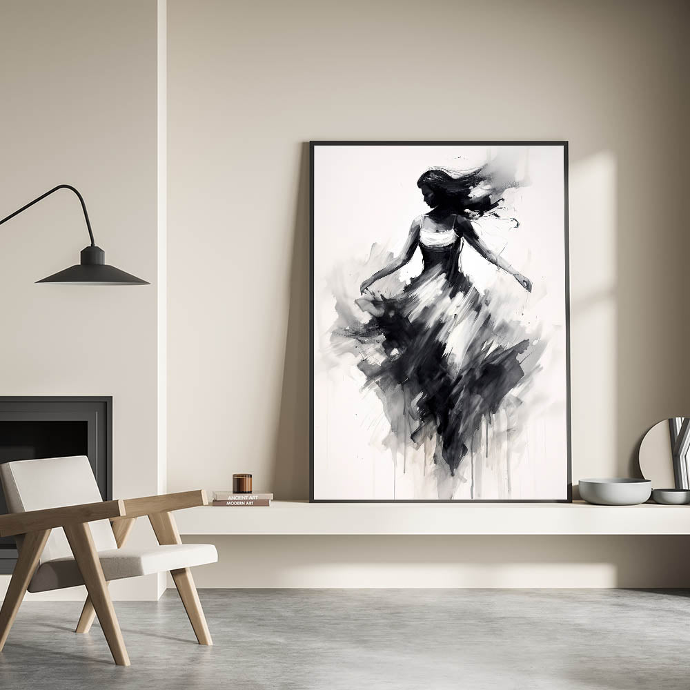 Bring movement and elegance to your space with this Living Room Wall Art, featuring a stunning abstract portrayal of a woman in motion. The fluid black and white brushstrokes create a captivating contrast, blending grace and artistic expression. This bold yet delicate piece is ideal for Modern Living Room Decor, adding a sophisticated touch to any space.