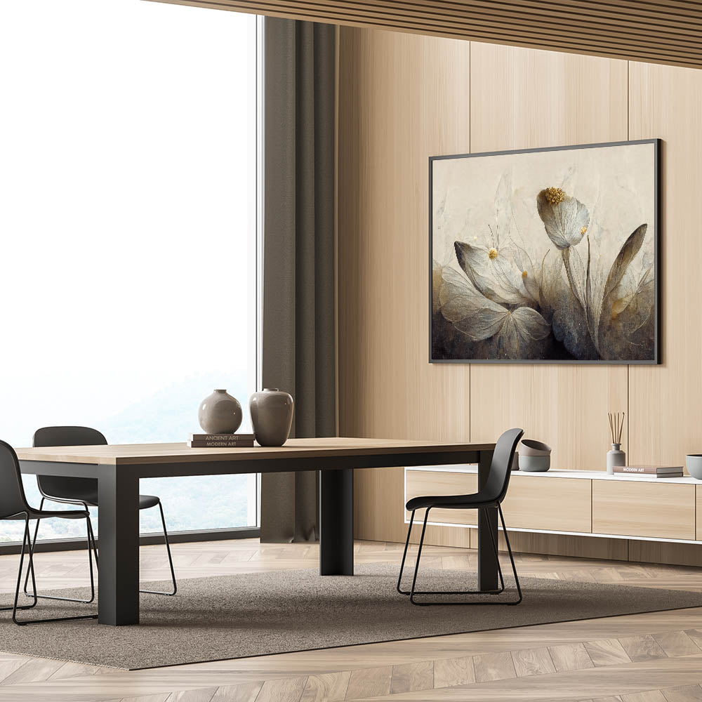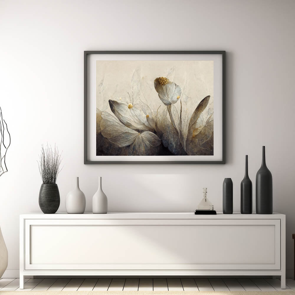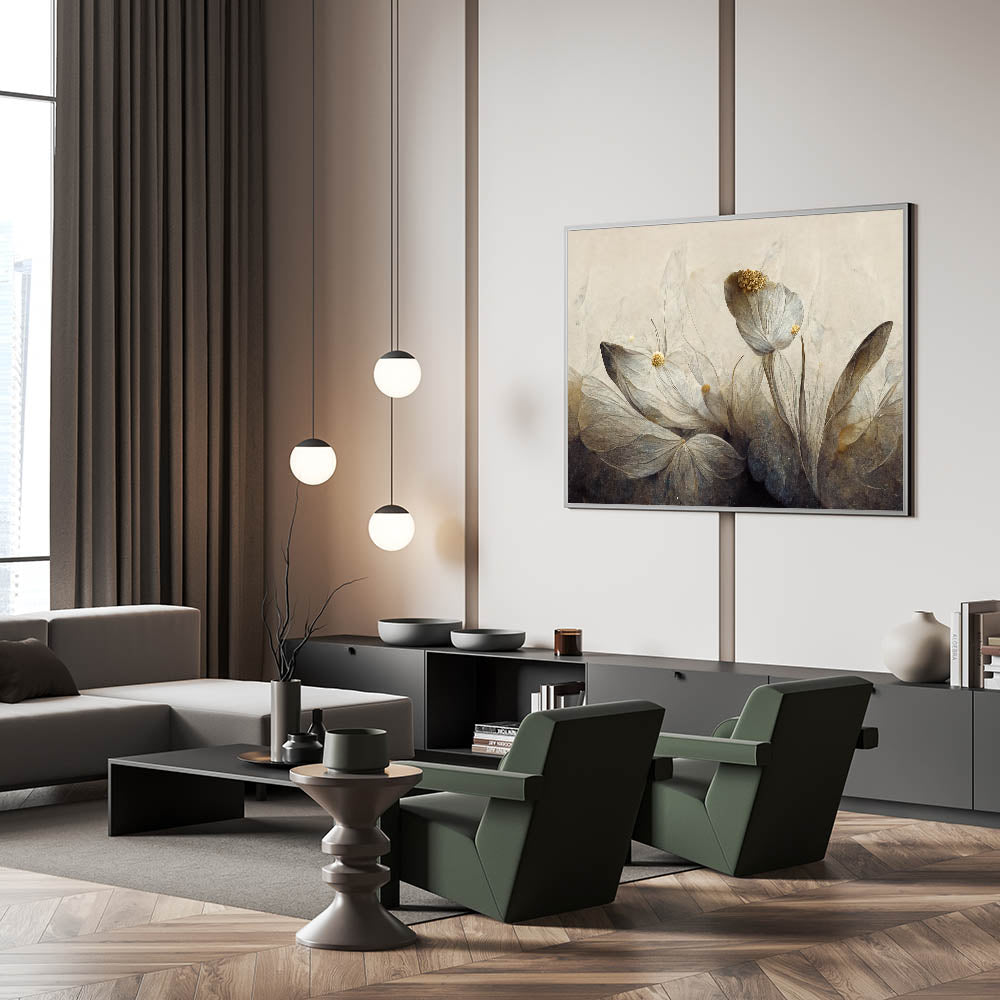 Immerse your space in timeless elegance with this gray and gold floral wall art. The soft textures and delicate petals create a harmonious balance, perfect for modern living room decor. With muted gray and beige hues enhanced by golden floral accents, this piece brings a sense of sophistication and warmth to any home.