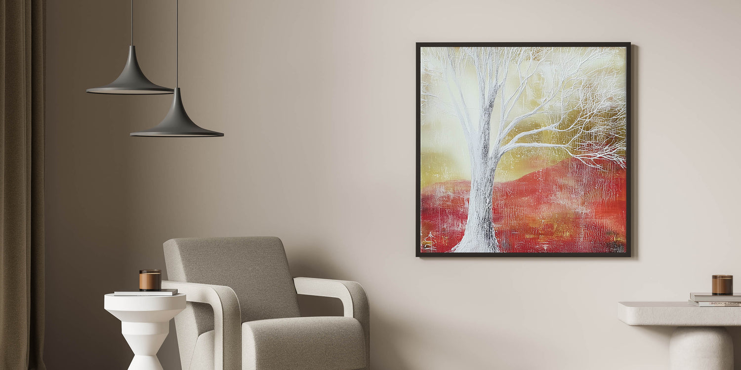 Add a touch of artistic elegance to your space with this large wall art piece, featuring a striking lone tree set against a soft gradient of warm gold, deep burgundy, and muted white. The delicate branches and textured background create a sense of depth, making this abstract wall art a sophisticated statement piece for any setting. Perfect as wall art for the living room, this design blends contemporary and minimalist aesthetics, adding warmth and serenity to your décor.