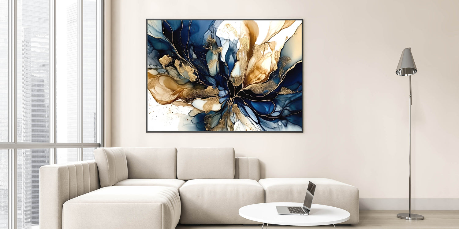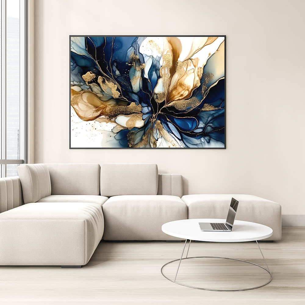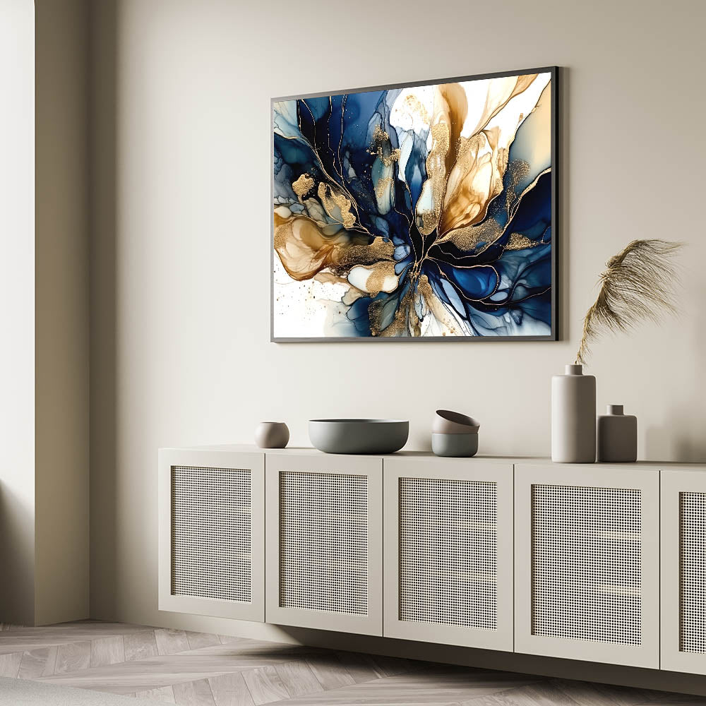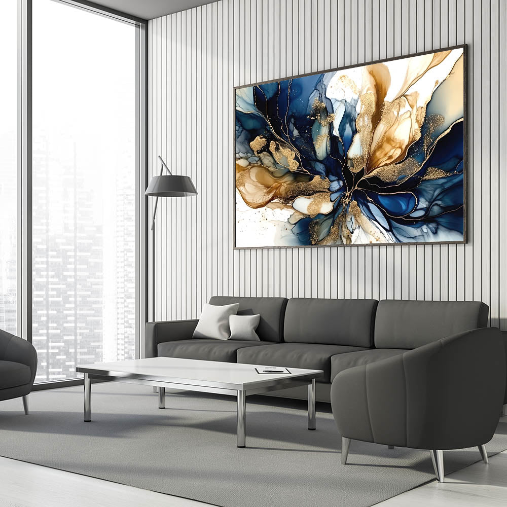 Make a statement with this Living Room Wall Art, featuring a mesmerizing fluid abstract design in rich navy blue, gold, and beige hues. The elegant metallic gold detailing enhances the flowing movement of the composition, creating a perfect blend of modern artistry and luxury. This artwork is ideal for Modern Living Room Decor, adding depth and sophistication to any space.