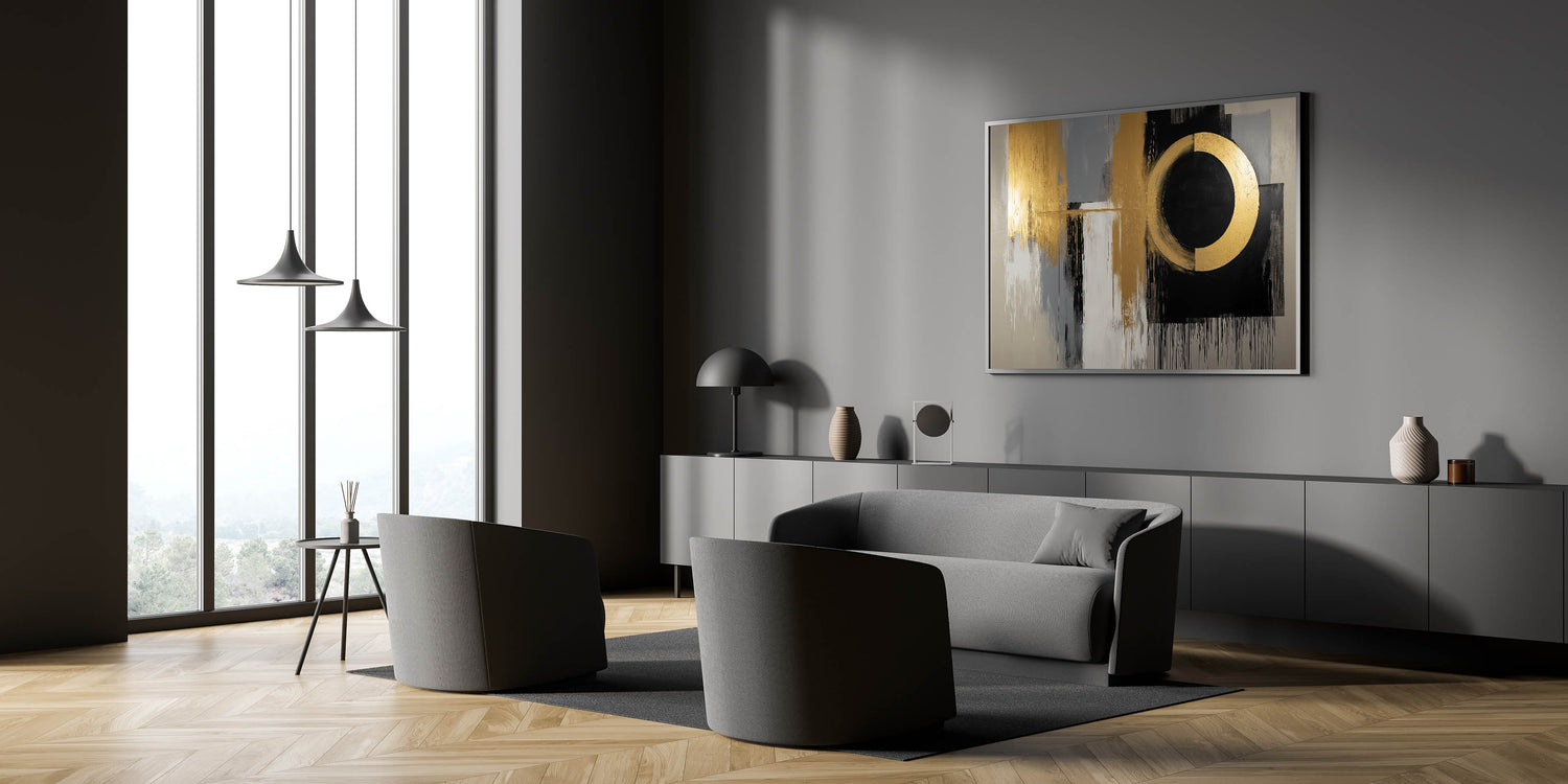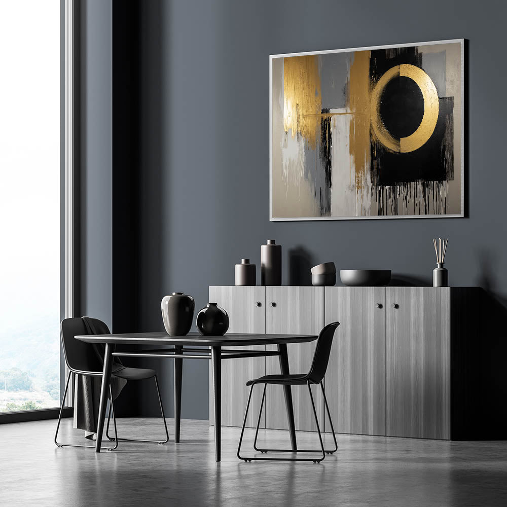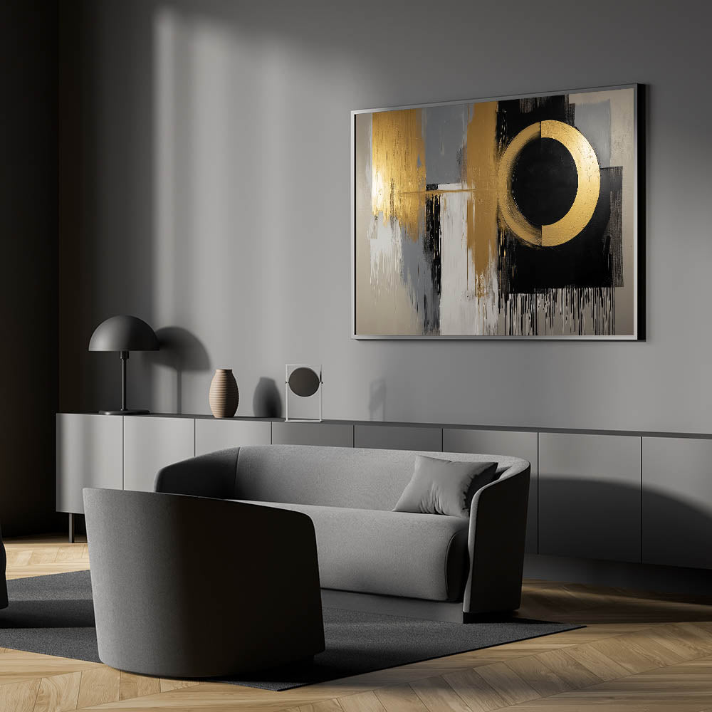 Elevate your space with this Living Room Wall Art, a striking gold and black abstract composition designed to add a bold, contemporary touch. The dynamic circular focal point blends seamlessly with textured gray, white, and gold brushstrokes, creating a luxurious and modern aesthetic. This piece is the perfect statement for Modern Living Room Decor.
