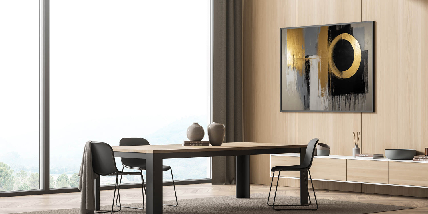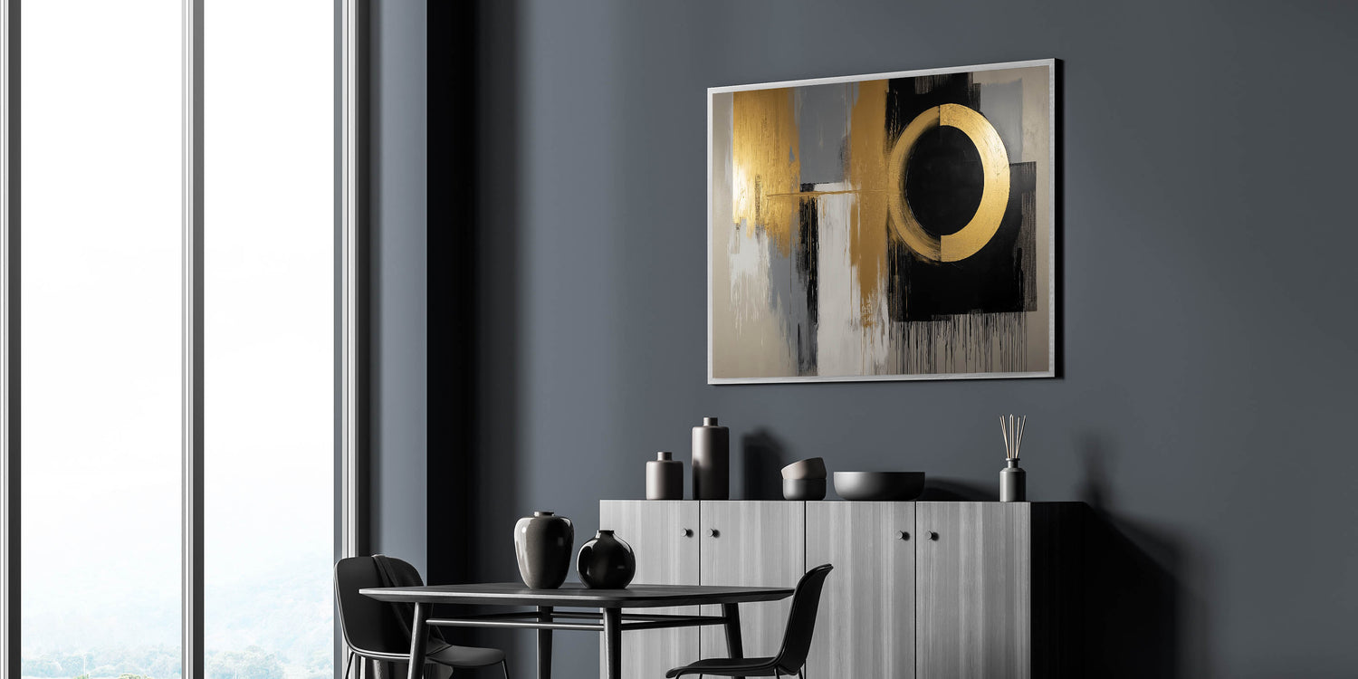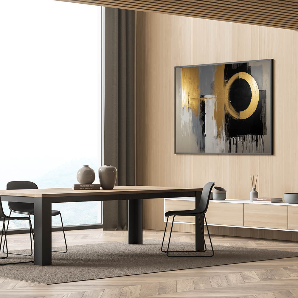Elevate your space with this Living Room Wall Art, a striking gold and black abstract composition designed to add a bold, contemporary touch. The dynamic circular focal point blends seamlessly with textured gray, white, and gold brushstrokes, creating a luxurious and modern aesthetic. This piece is the perfect statement for Modern Living Room Decor.