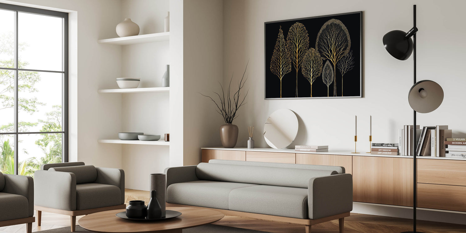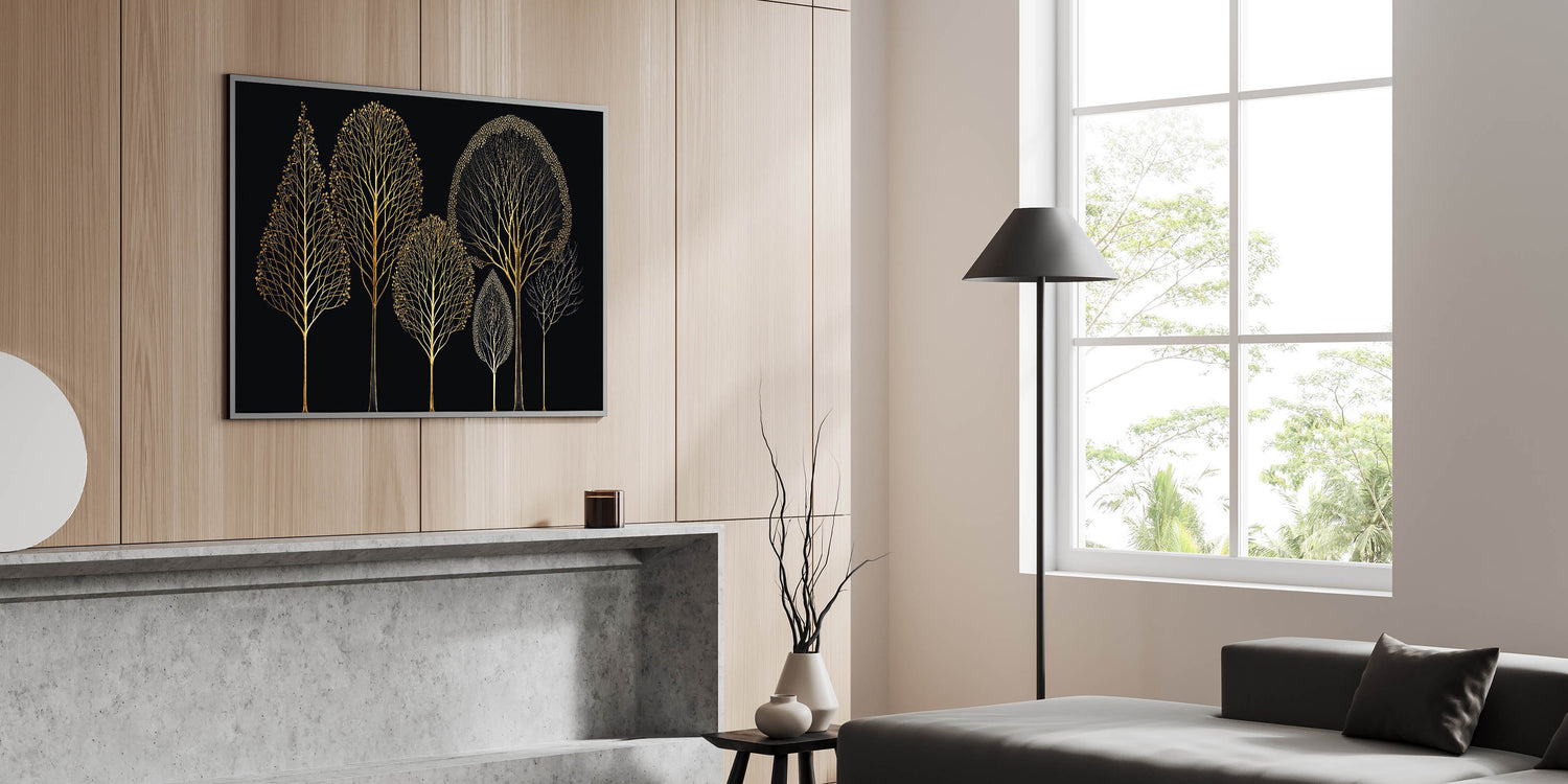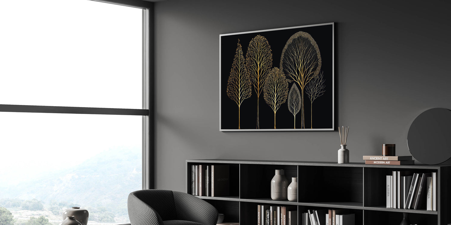- Elegant Tree Design – A sleek mix of abstract art pieces with delicate gold detailing