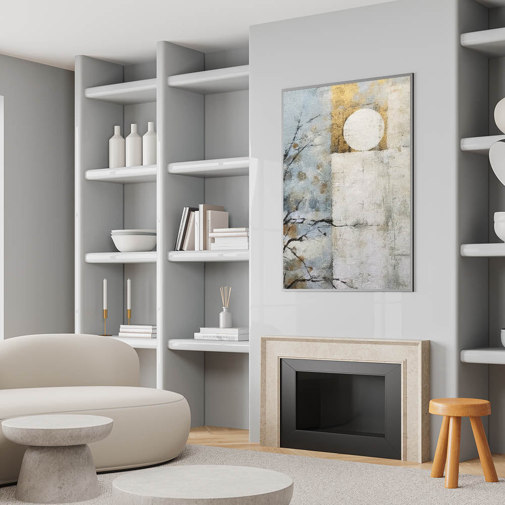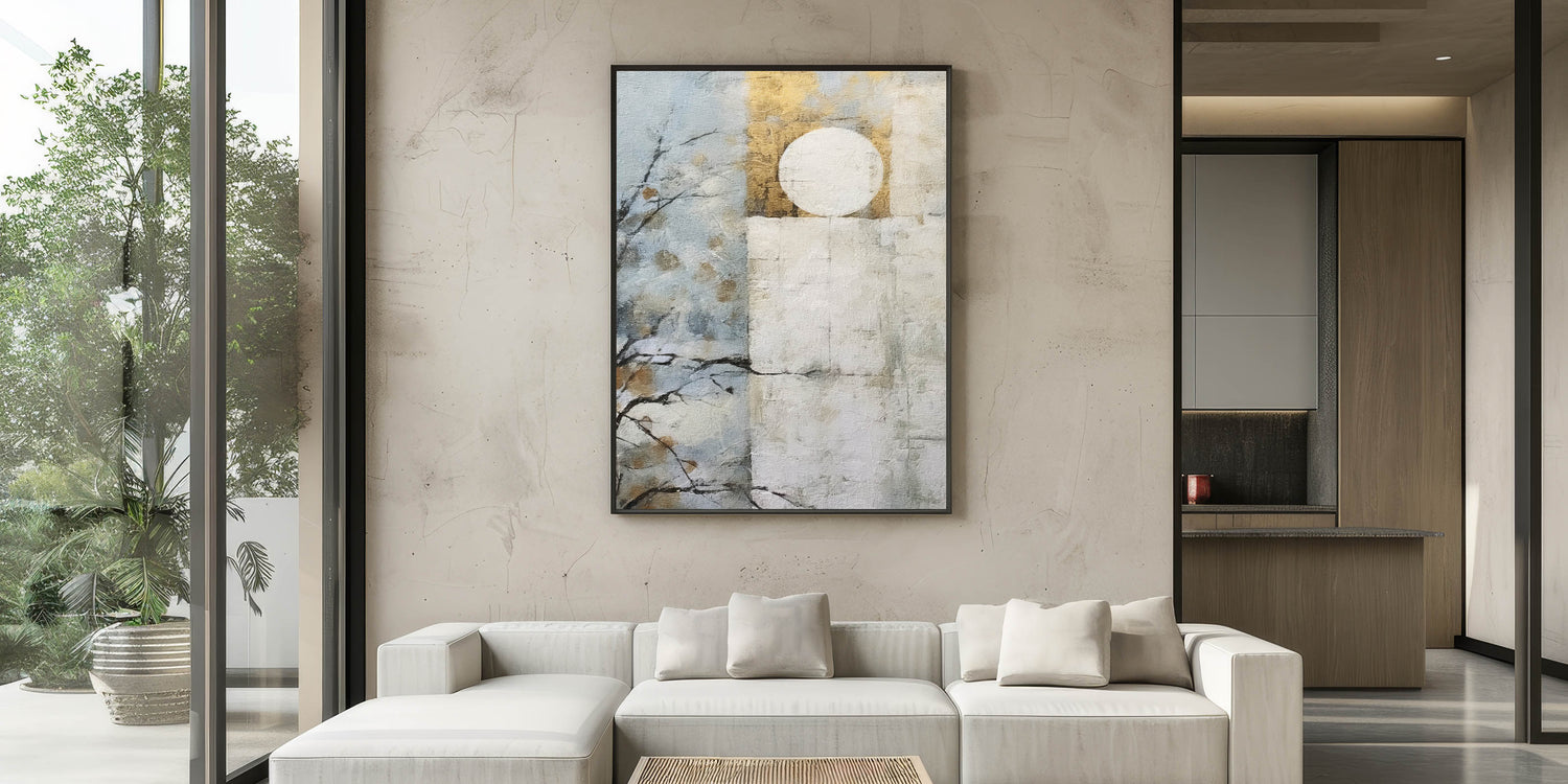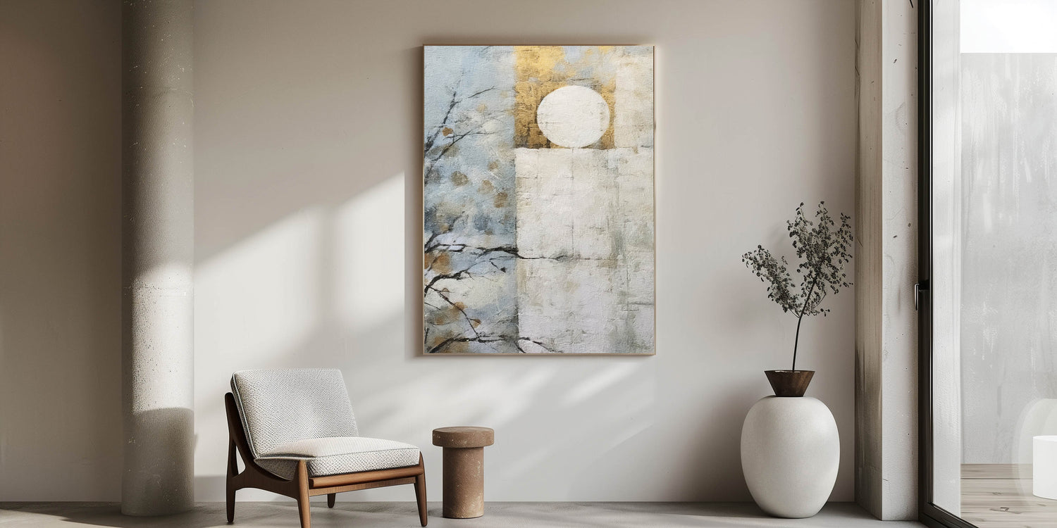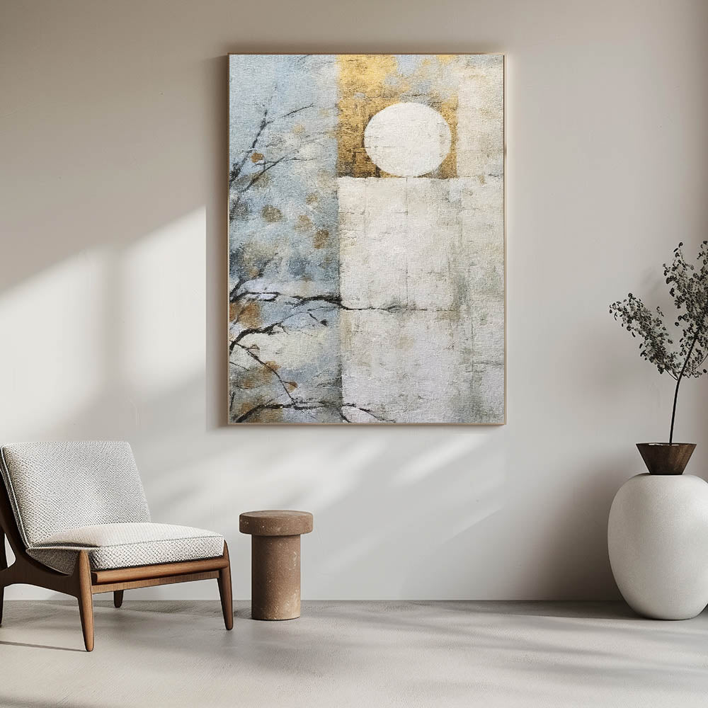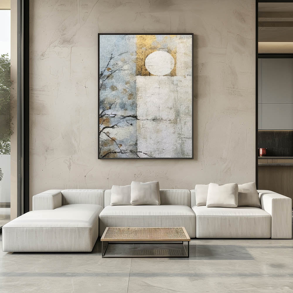 Elevate your home with this Minimalist Abstract Living Room Wall Art, a serene and sophisticated blend of modern wall art and abstract art pieces. Featuring a textured design with muted tones of soft gray, warm beige, and subtle gold, this canvas wall art brings a sense of balance and tranquility to modern living room decor. The delicate depiction of a tree branch against geometric elements adds a natural, yet artistic, touch to the composition.