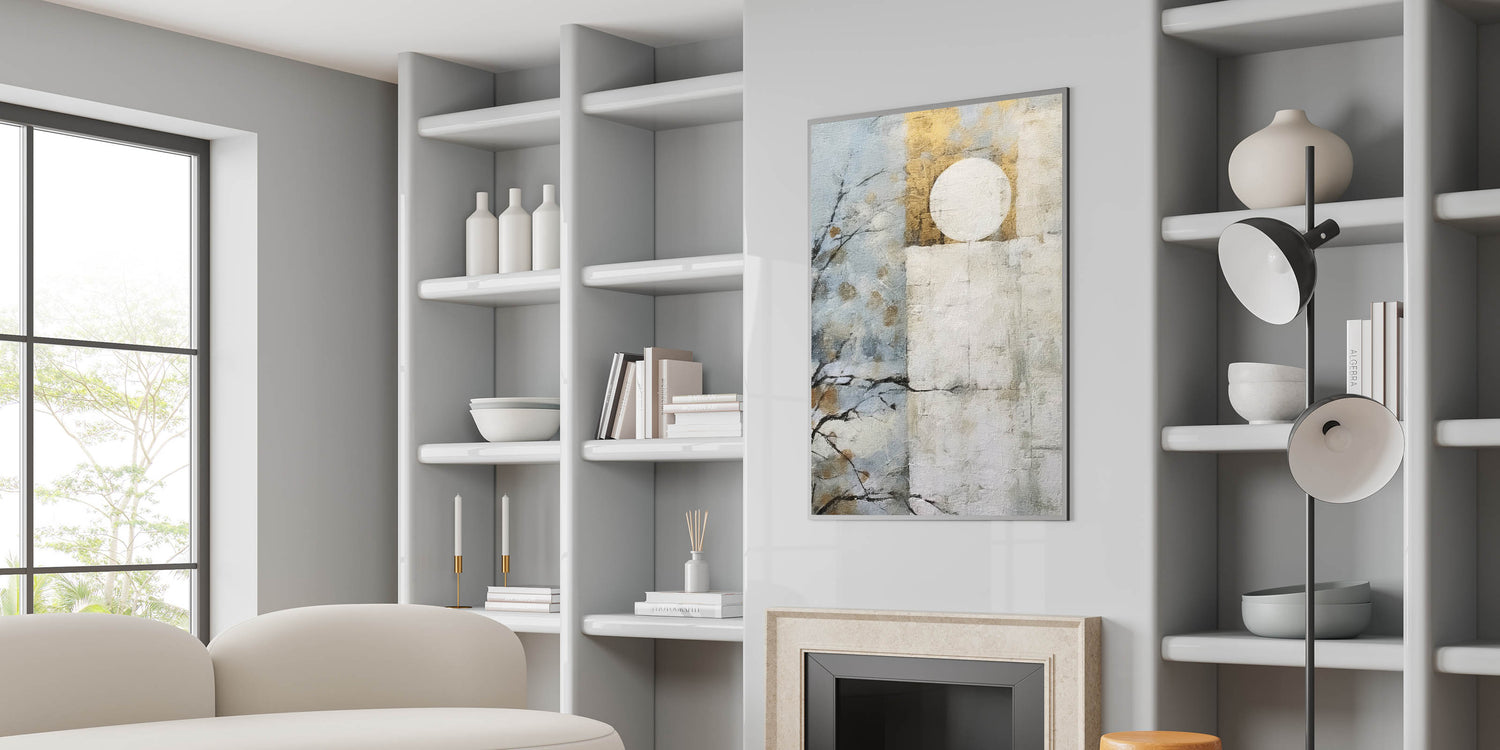 - Subtle tones of gold, gray, and soft blue complement contemporary art prints.