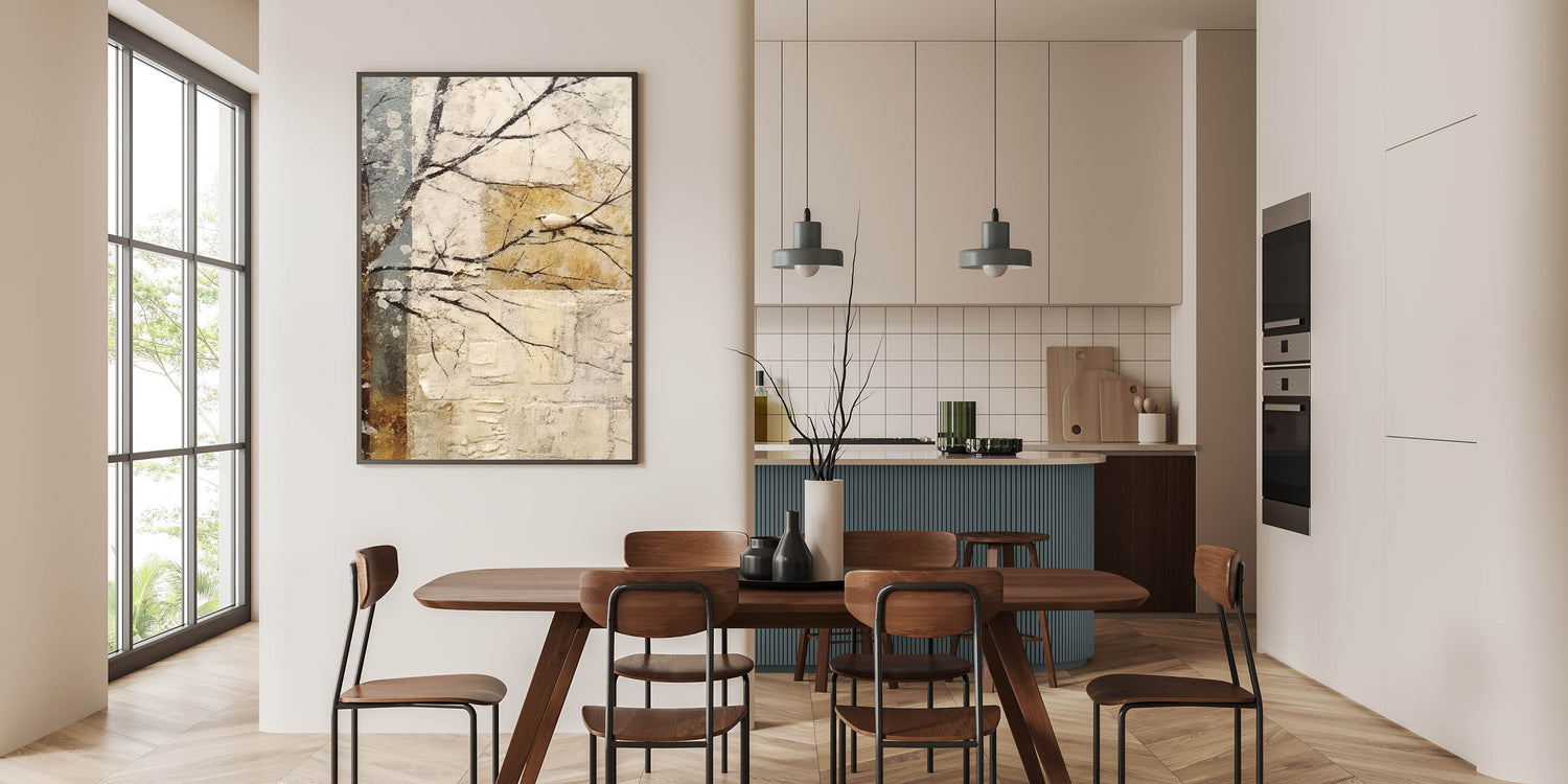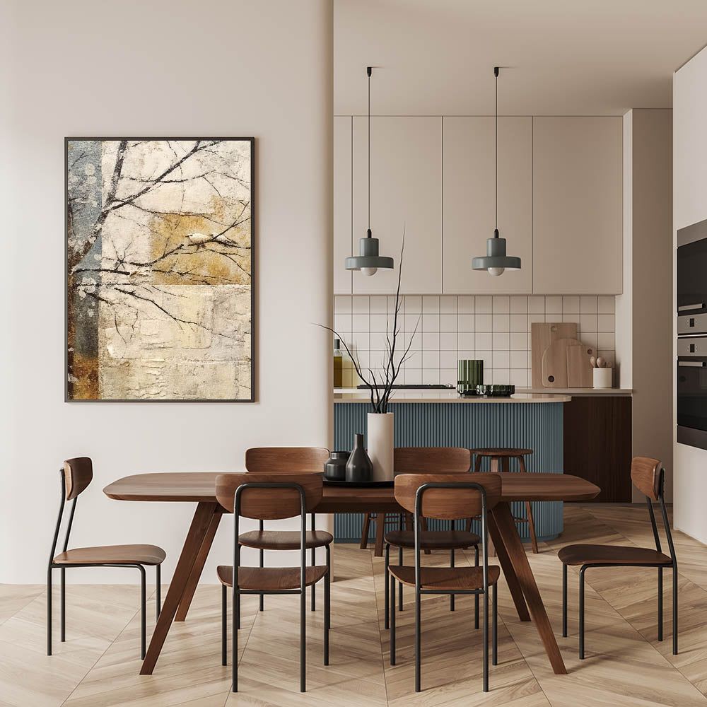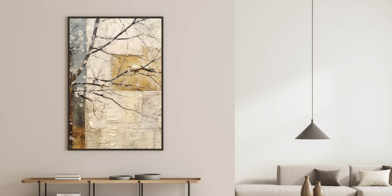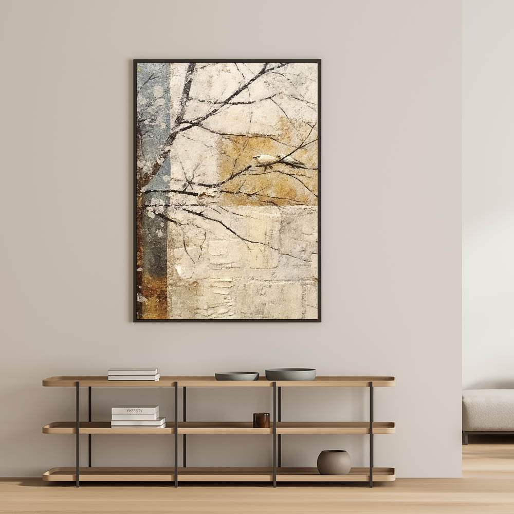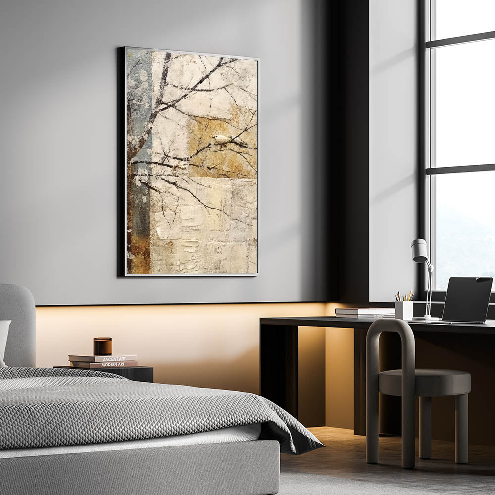 Embrace the beauty of nature with this serene minimalist bird wall art, featuring a delicate white bird perched on a branch against a textured, abstract background. The soft beige, gold, and muted blue tones create a tranquil atmosphere, making this modern wall art perfect for wall art for living rooms, bedrooms, or meditation spaces. The organic composition and earthy color palette bring a sense of calm, ideal for contemporary and rustic interiors.