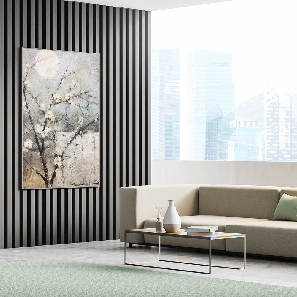 - Large canvas art with soft neutral tones and delicate floral elements.
