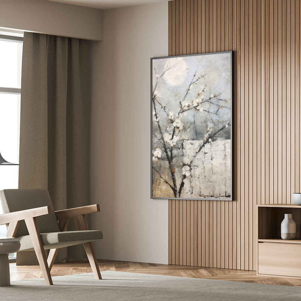Create a serene and elegant atmosphere with this Minimalist Blossom Living Room Wall Art, a beautiful blend of modern wall art and abstract art pieces. Featuring delicate white blossoms set against a soft, textured gray and beige background, this canvas wall art evokes tranquility and timeless sophistication. The gentle depiction of nature adds warmth and refinement to modern living room decor.