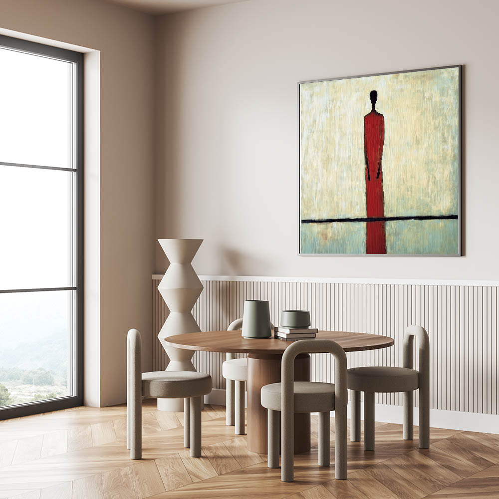 Make a bold artistic statement with this minimalist figurative abstract wall art, featuring a striking silhouette in deep red and black against a muted beige background. The simplicity of form combined with the bold color palette makes this modern wall art a captivating addition to modern living room decor. This canvas wall art embodies emotion, mystery, and elegance, making it a standout piece for any space.